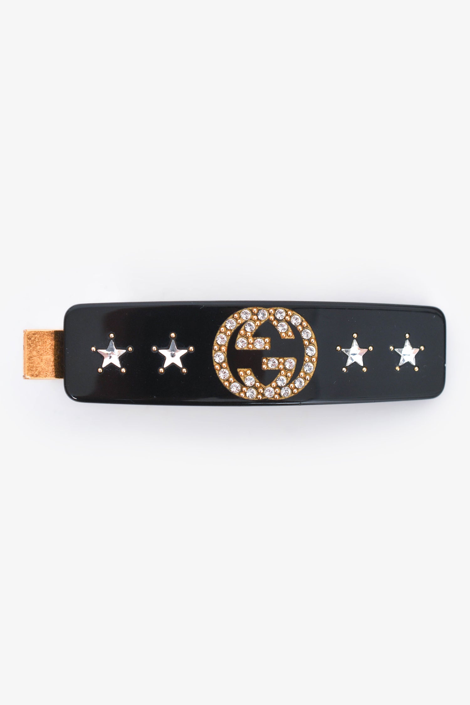 Refresh availabilityGucci Black Crystal Embellished GG Logo Hair Clip. Clip-on hair clamp. Crystal embellishment. Antiqued gold-tone hardware.