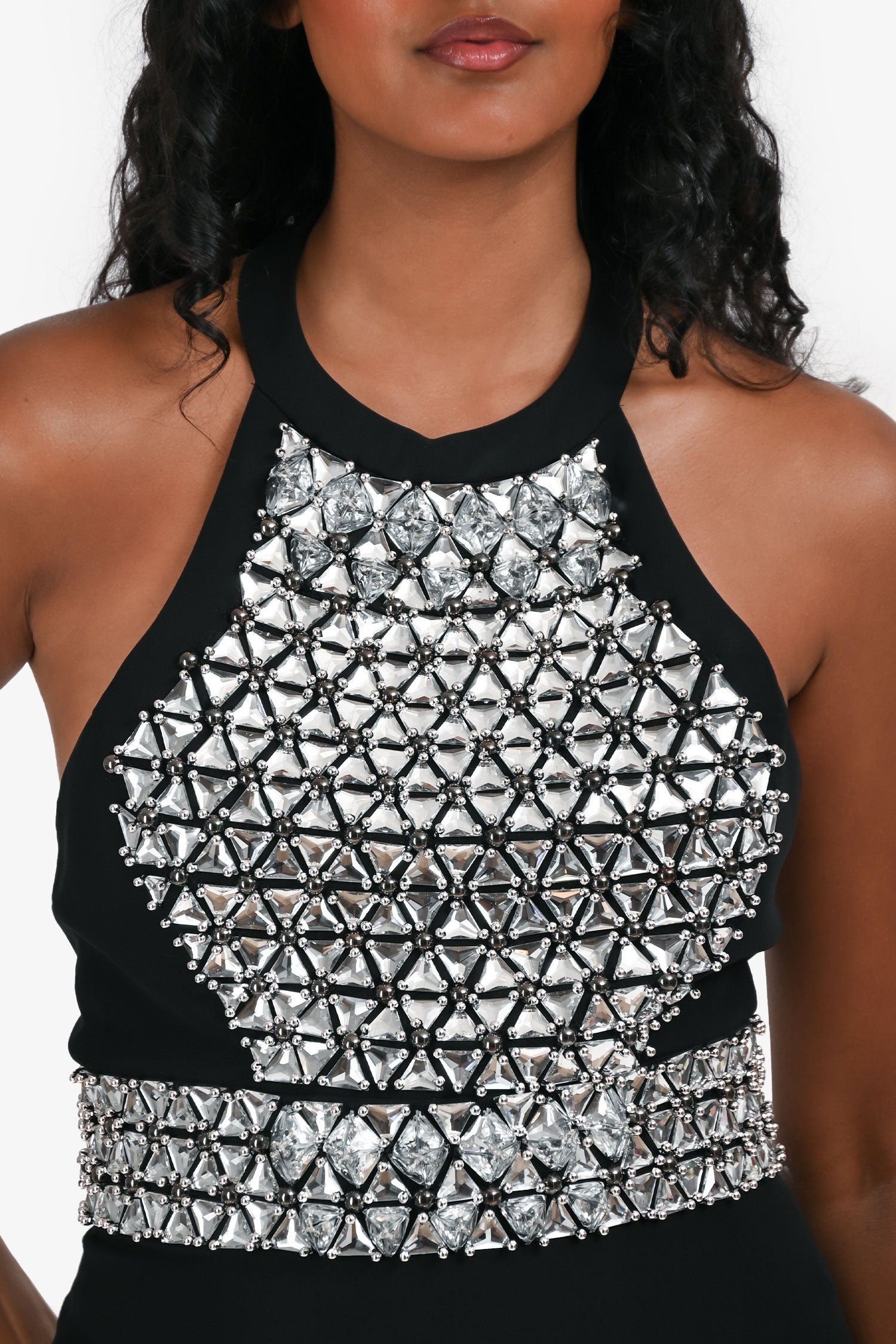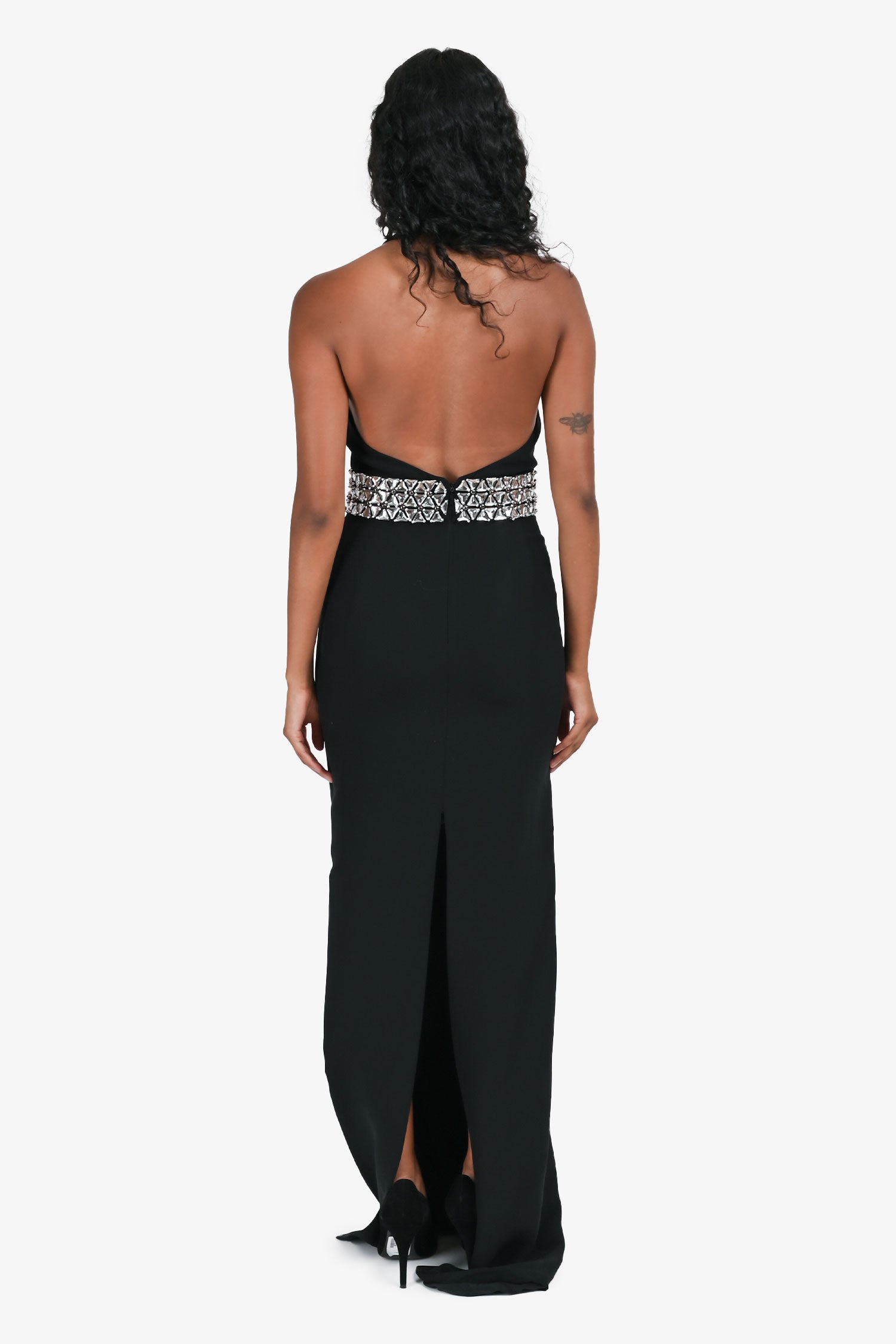 Refresh availabilityGucci Black Crystal Embellished Halter Gown. Halter neckline with button closure. Open back. Back zip closure. Fully lined. Tonal stitching.
