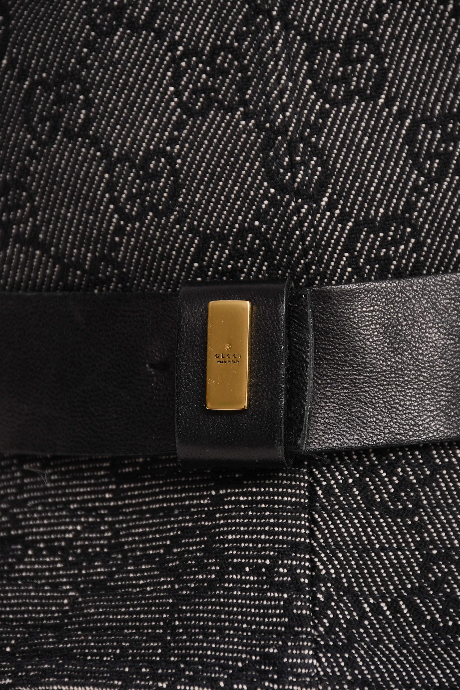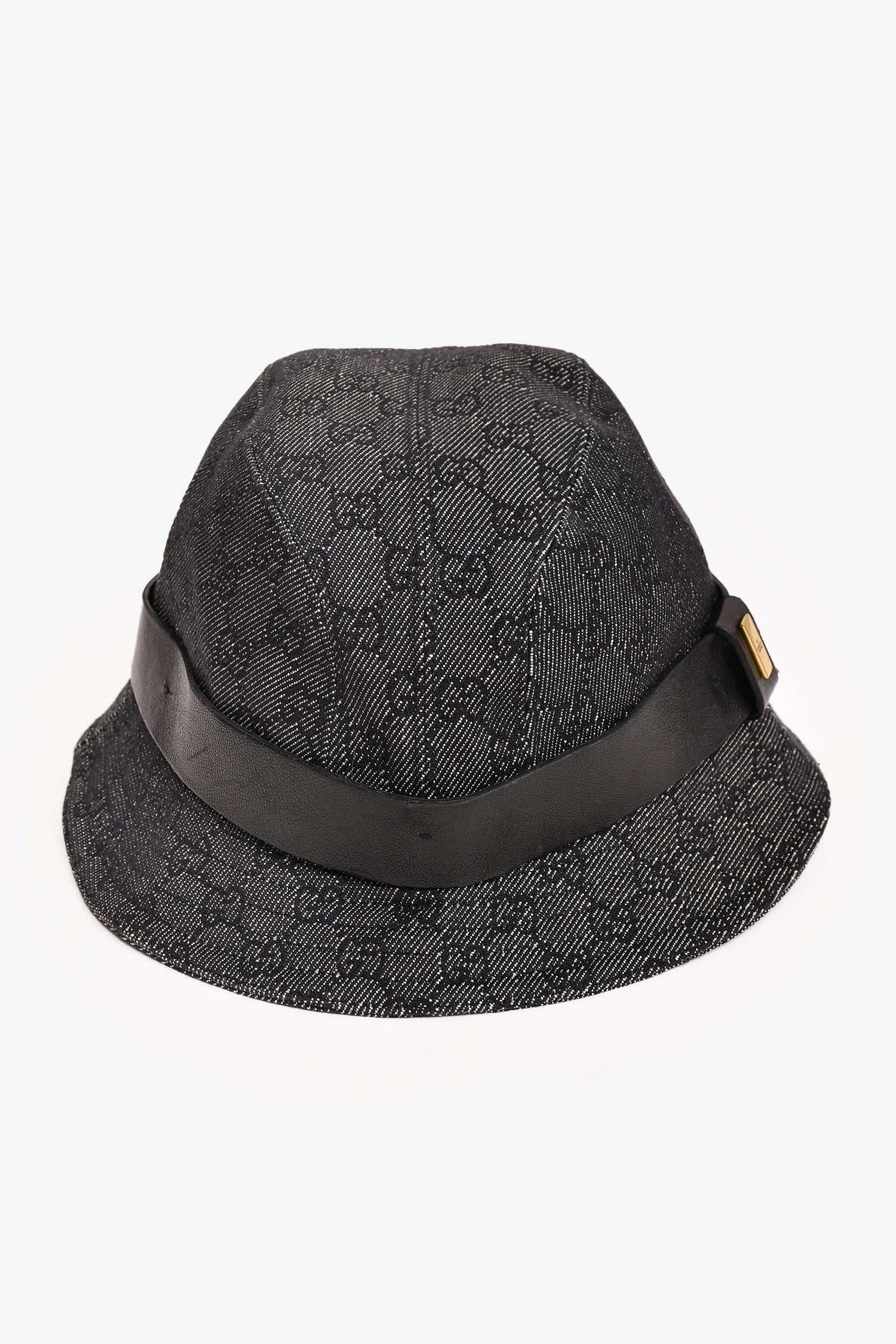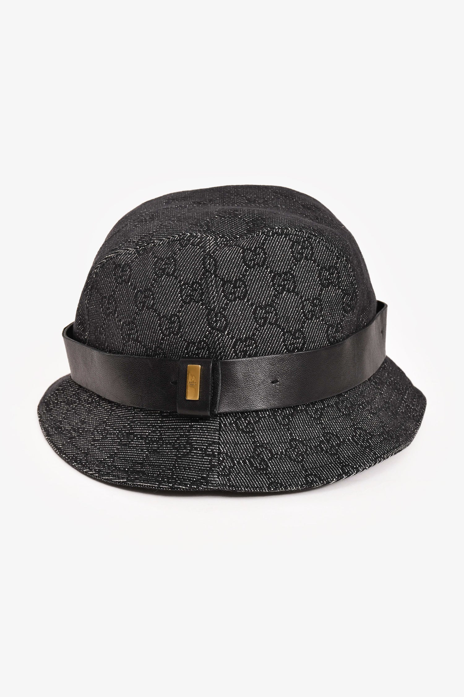Refresh availabilityGucci Black Denim Monogram Leather Belt Detail Bucket Hats. White denim detailing. Gold-tone hardware at the belt. Tonal stitching.