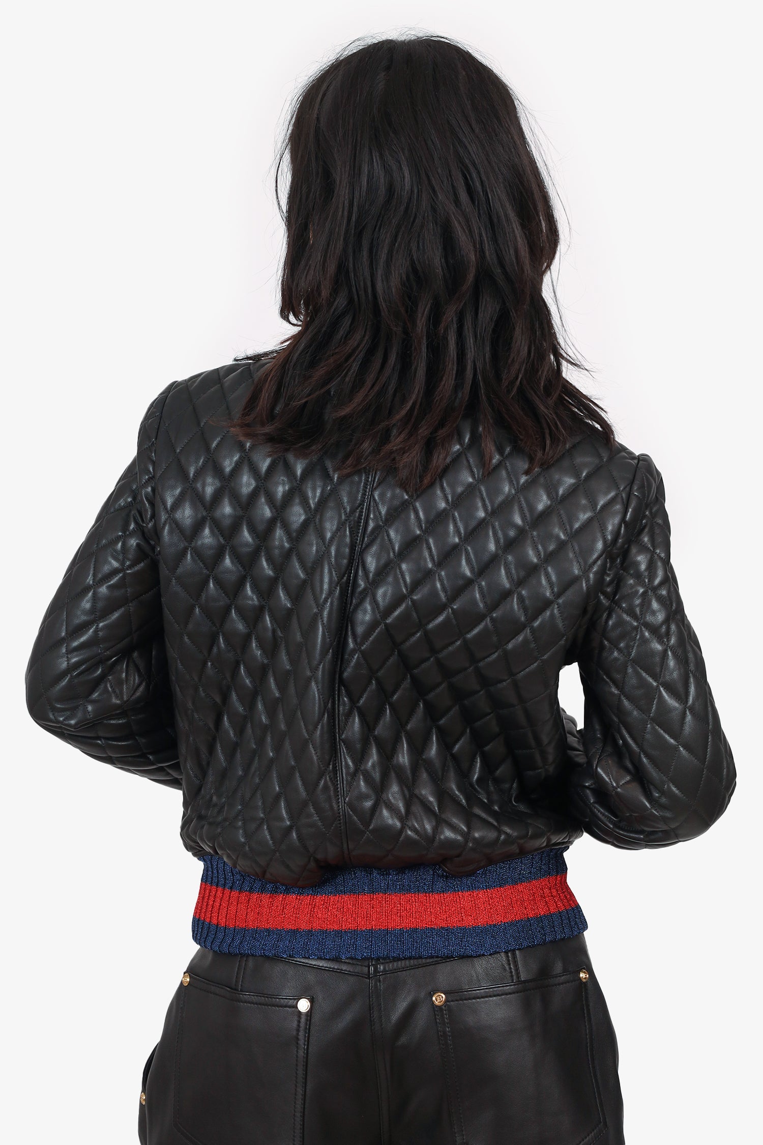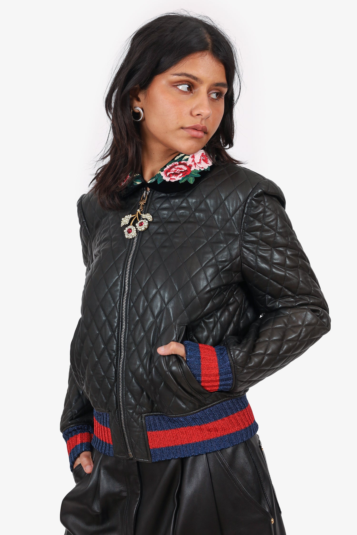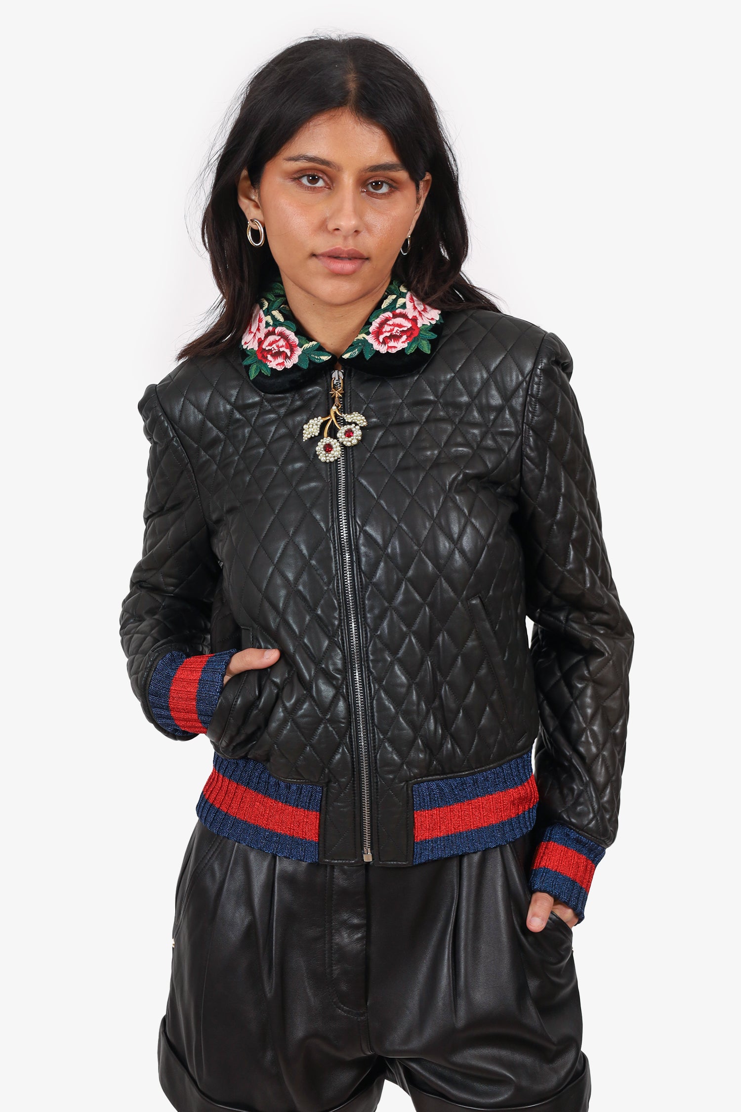 Refresh availabilityGucci Black Diamond Quilted Leather Floral Collar Bomber Jacket. Pull-on. Collared neckline. Front zip closure with embellished zipper. Elasticated sleeve cuffs and waistband. Lined interior. Gold-tone hardware. Tonal stitching.