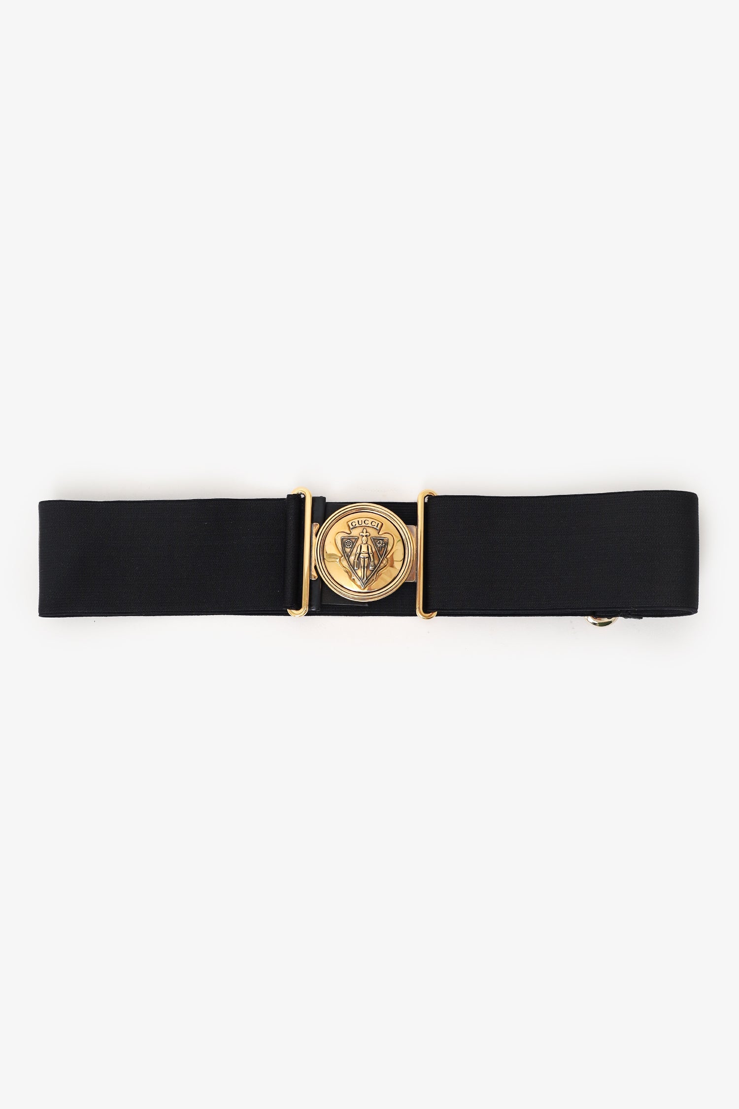 Refresh availabilityGucci Black Elastic Fabric Hysteria Buckle Belt. Toggle closure. Adjustable elasticated band. Gold-tone hardware. Tonal stitching.