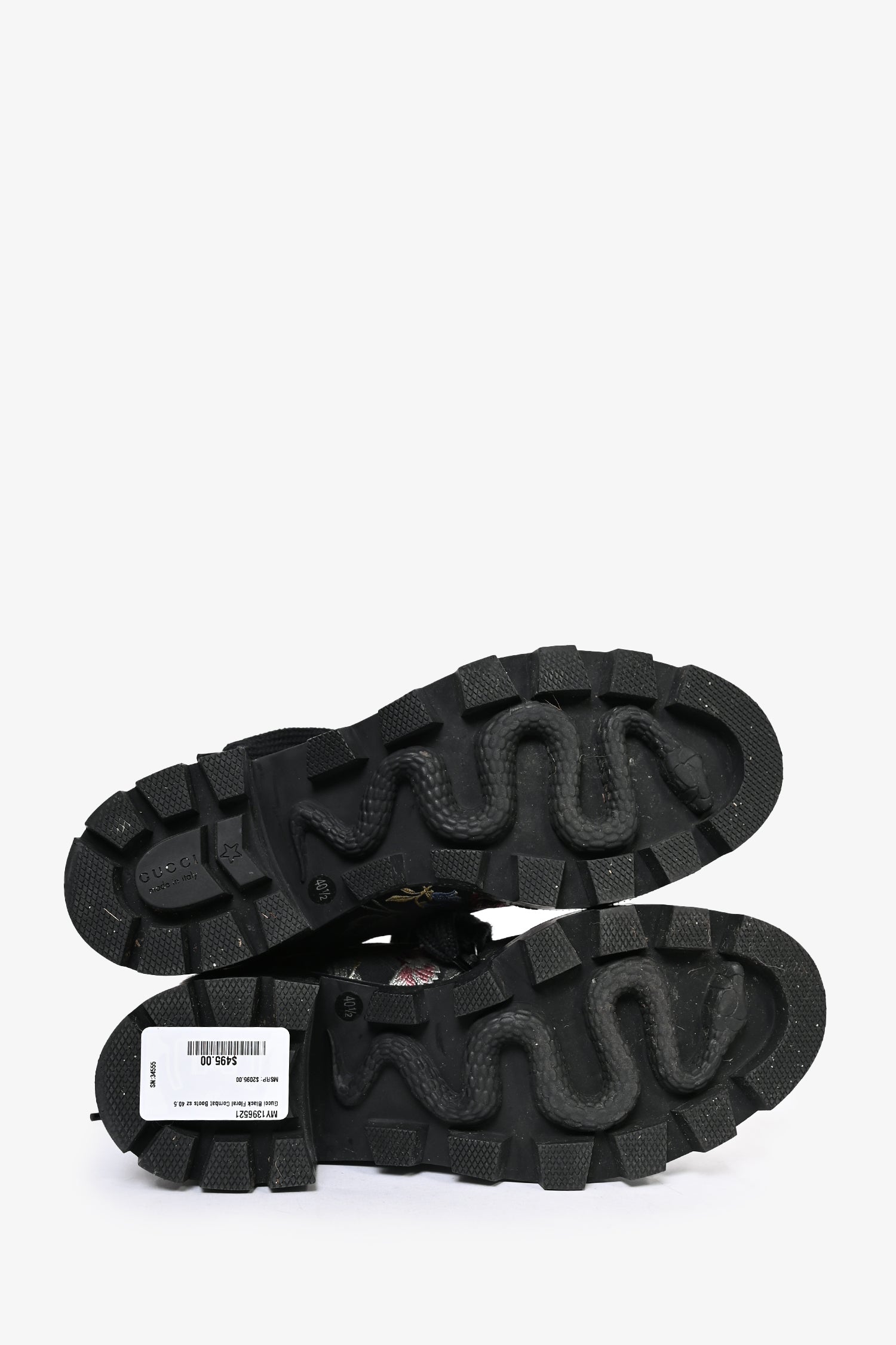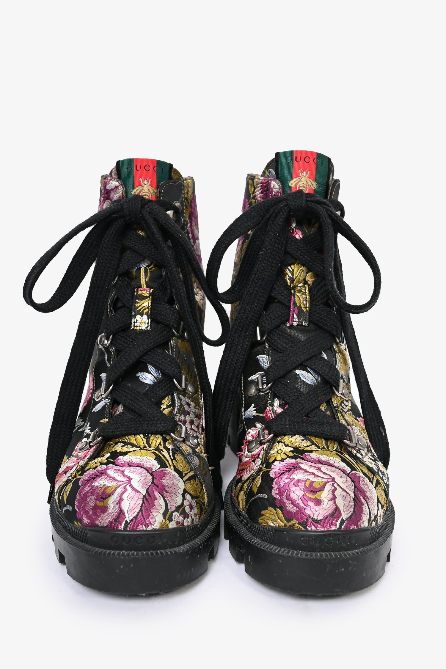 Refresh availabilityGucci Black Floral Combat Boots. Round toe. Front lace-up closure. Treaded bottoms.