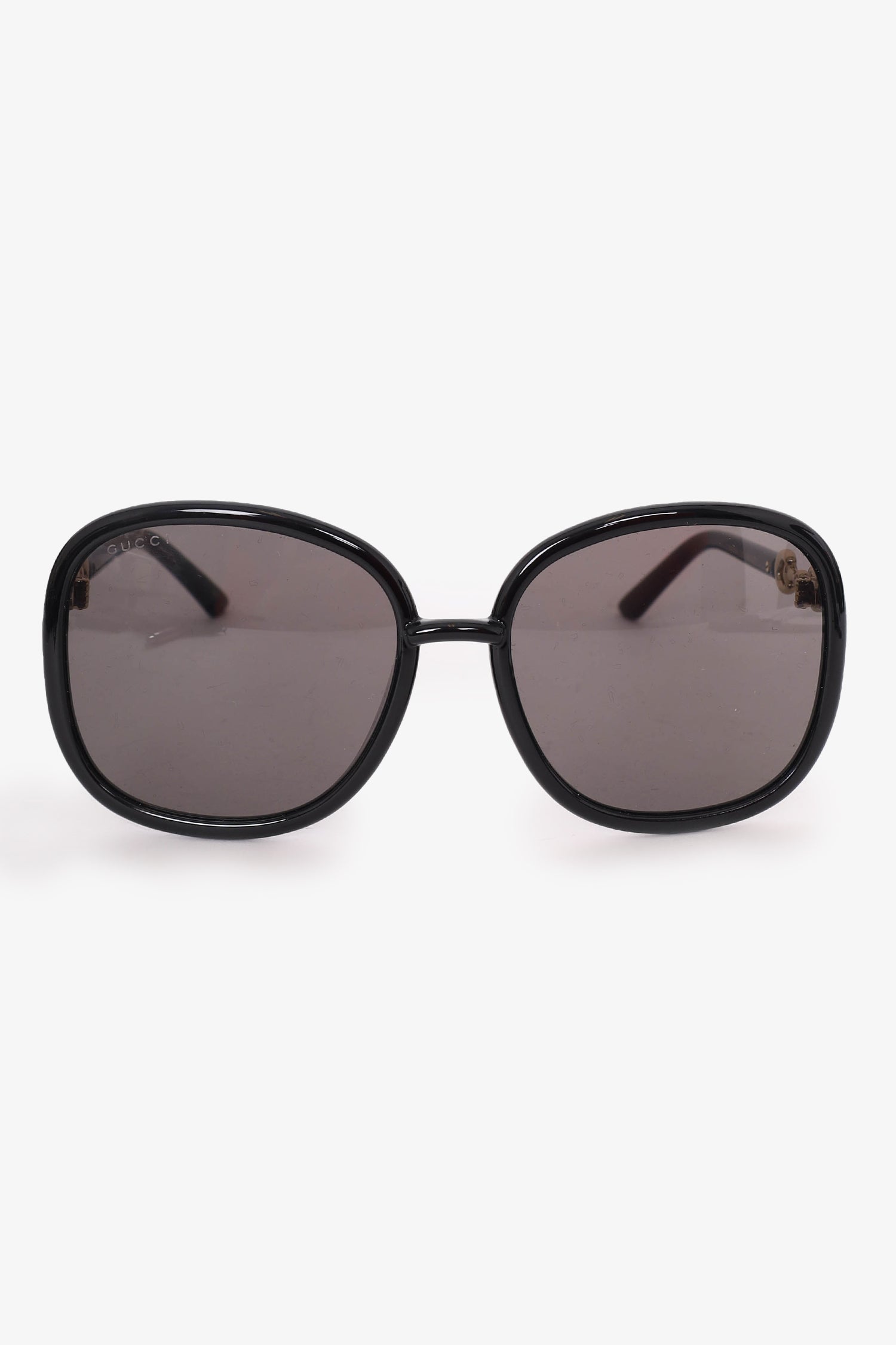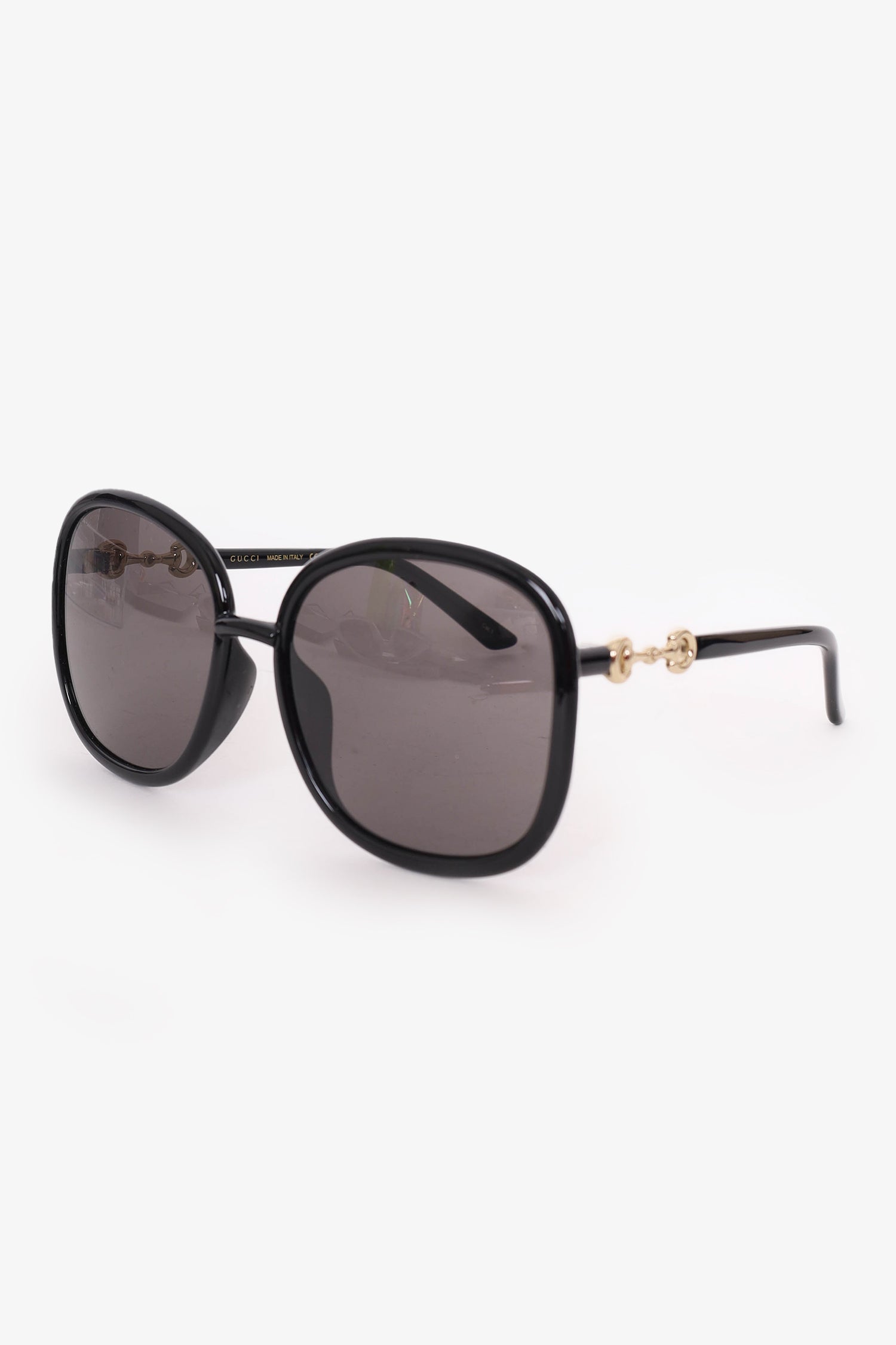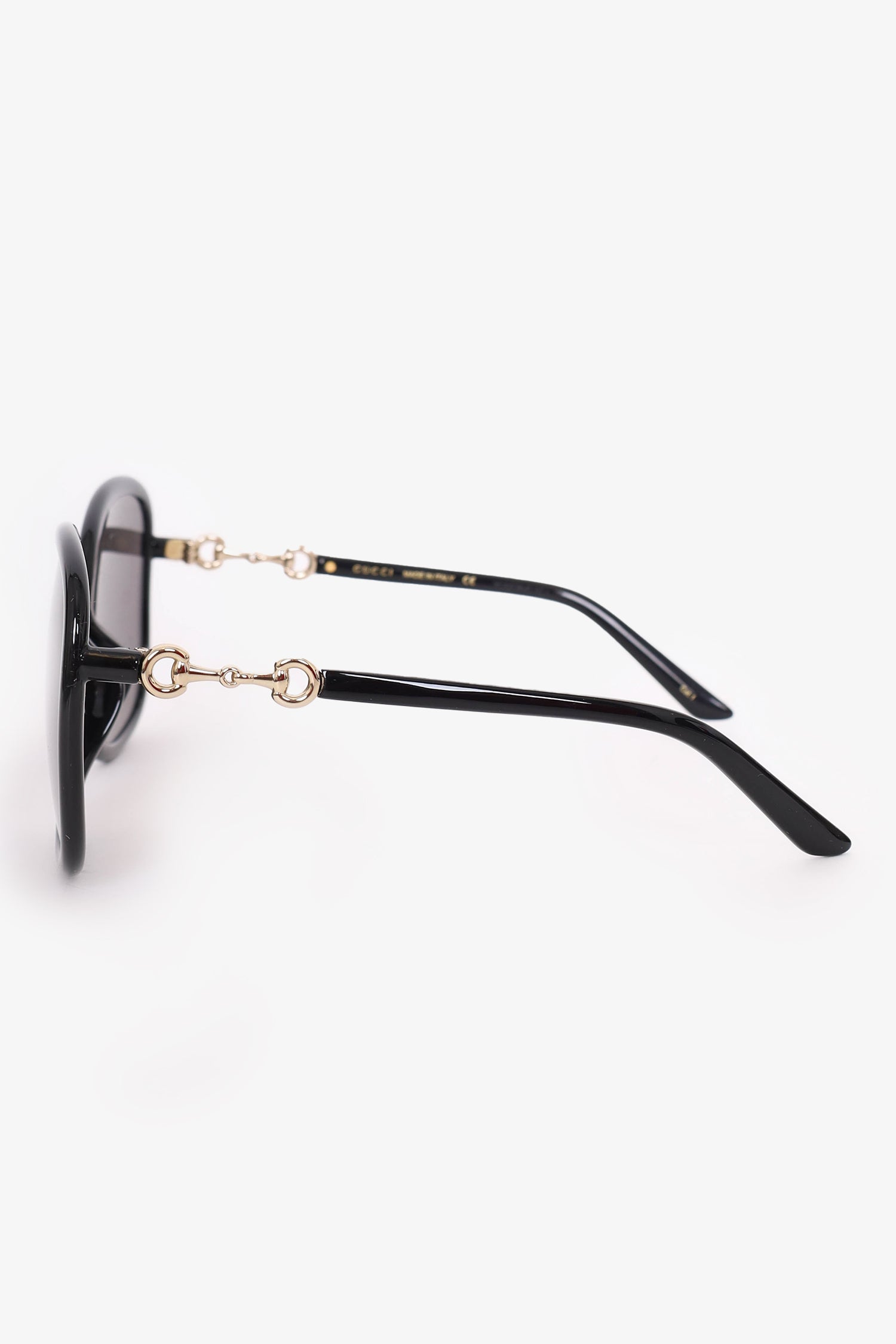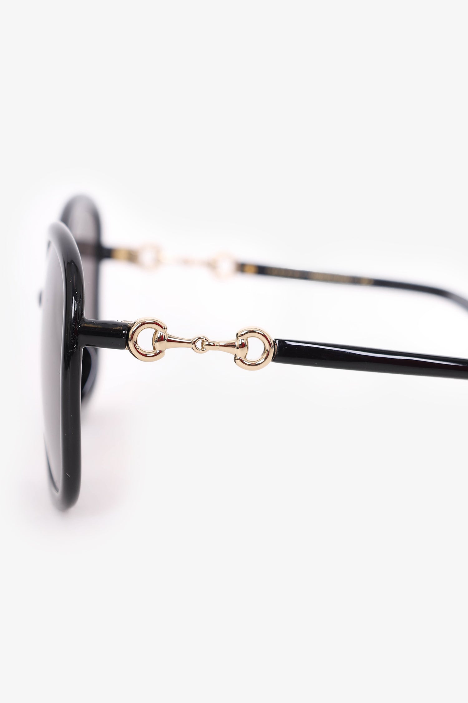 Refresh availabilityGucci Black Frame Horsebit Round Sunglasses. Built-in nose pads. Gold-tone hardware.
