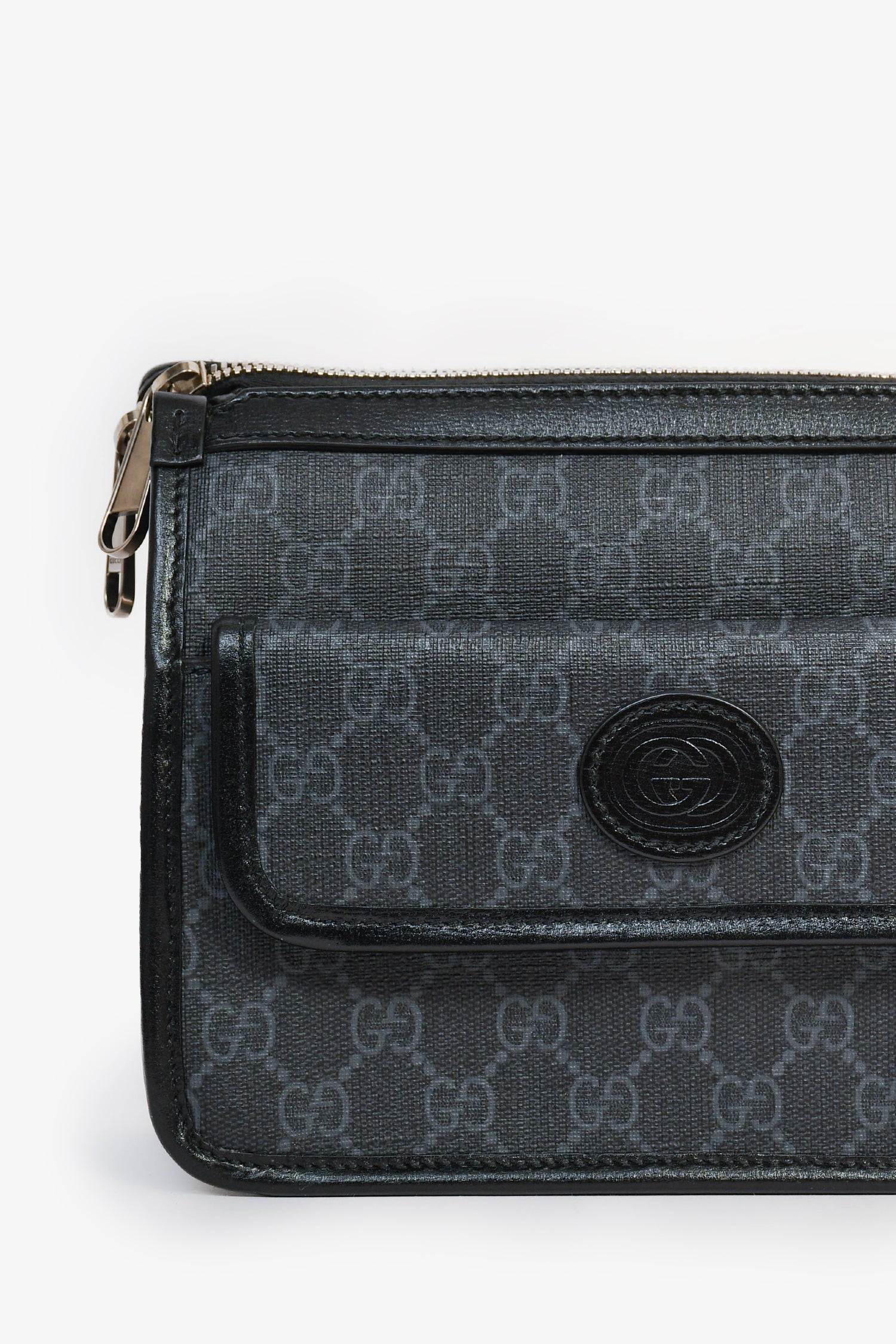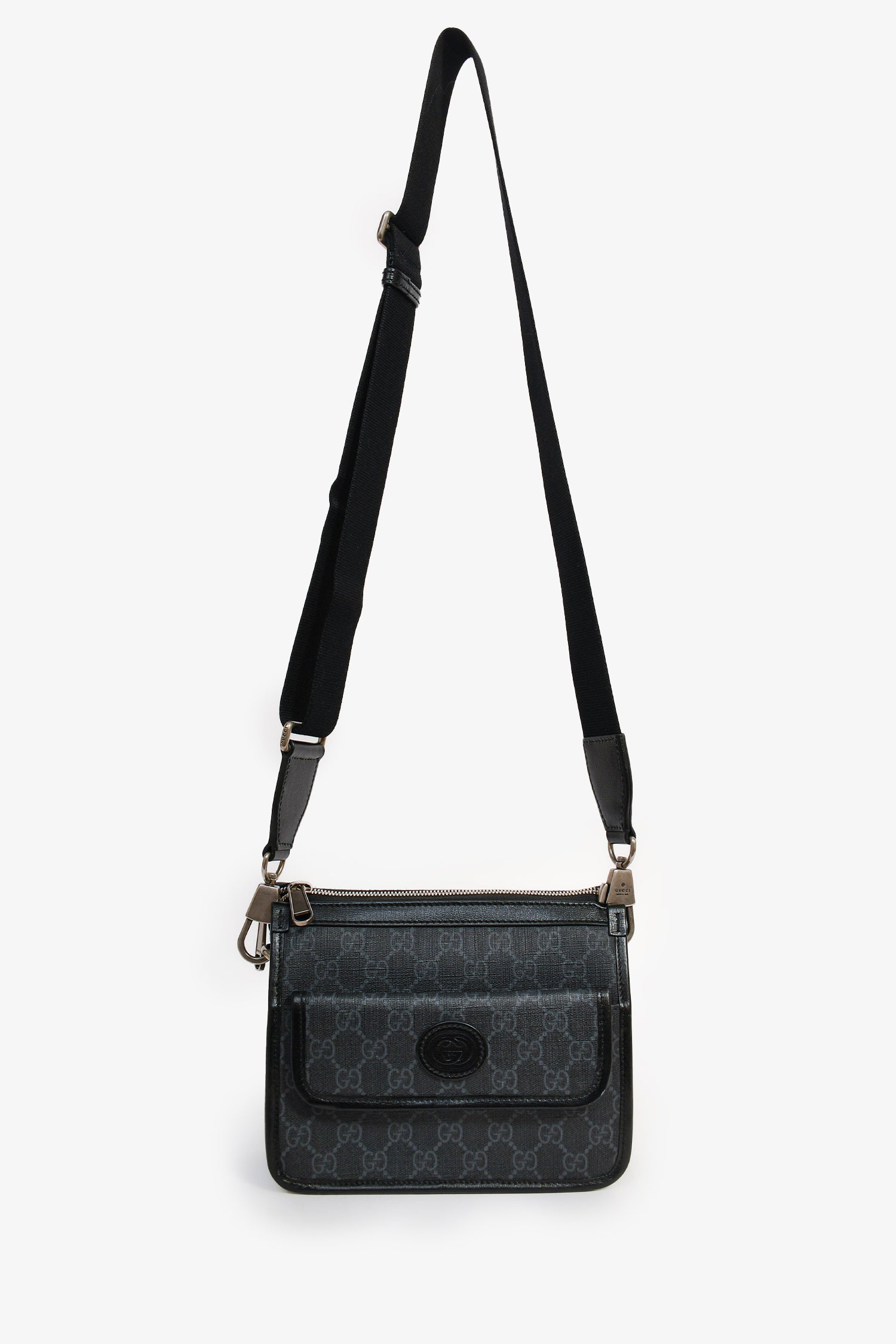 Refresh availabilityGucci Black GG Canvas Messenger Bag. Top zipper closure. Front exteiror fold-over pocket with magnetic closure. Single interior compartment with a wall zip pocket. Detachable strap. Textile lining. Antiqued silver-tone hardware. Tonal stitching.