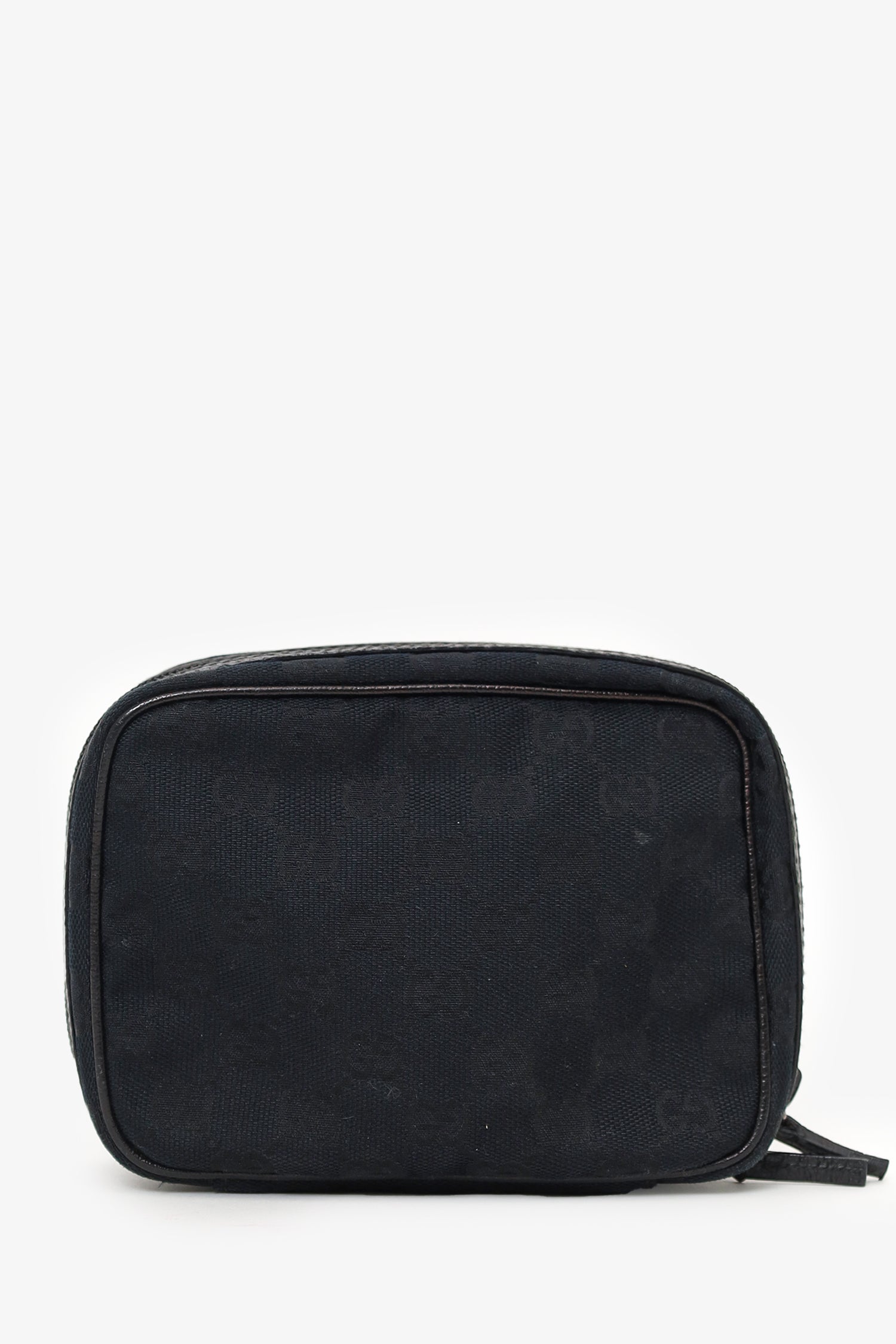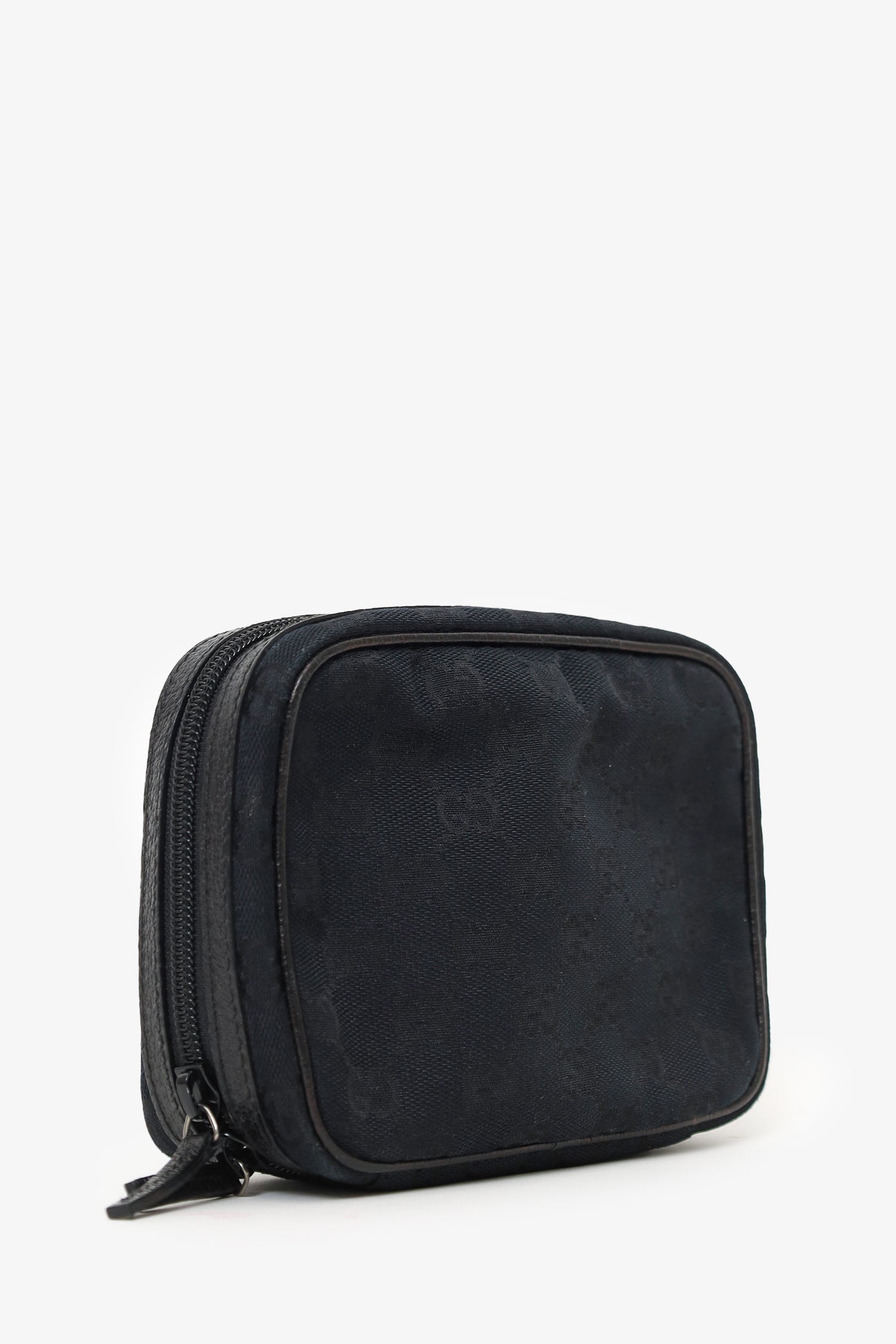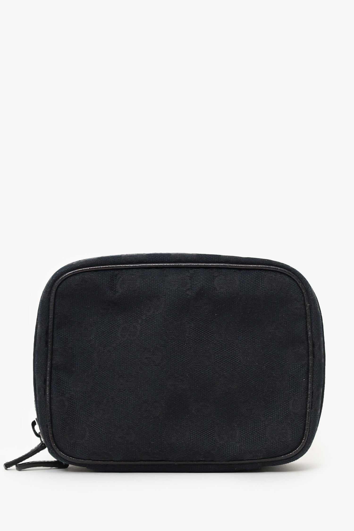 Refresh availabilityGucci Black GG Canvas Pouch. Top 3/4 zip closure. Lined interior. Single interior zip pocket. Tonal stitching.