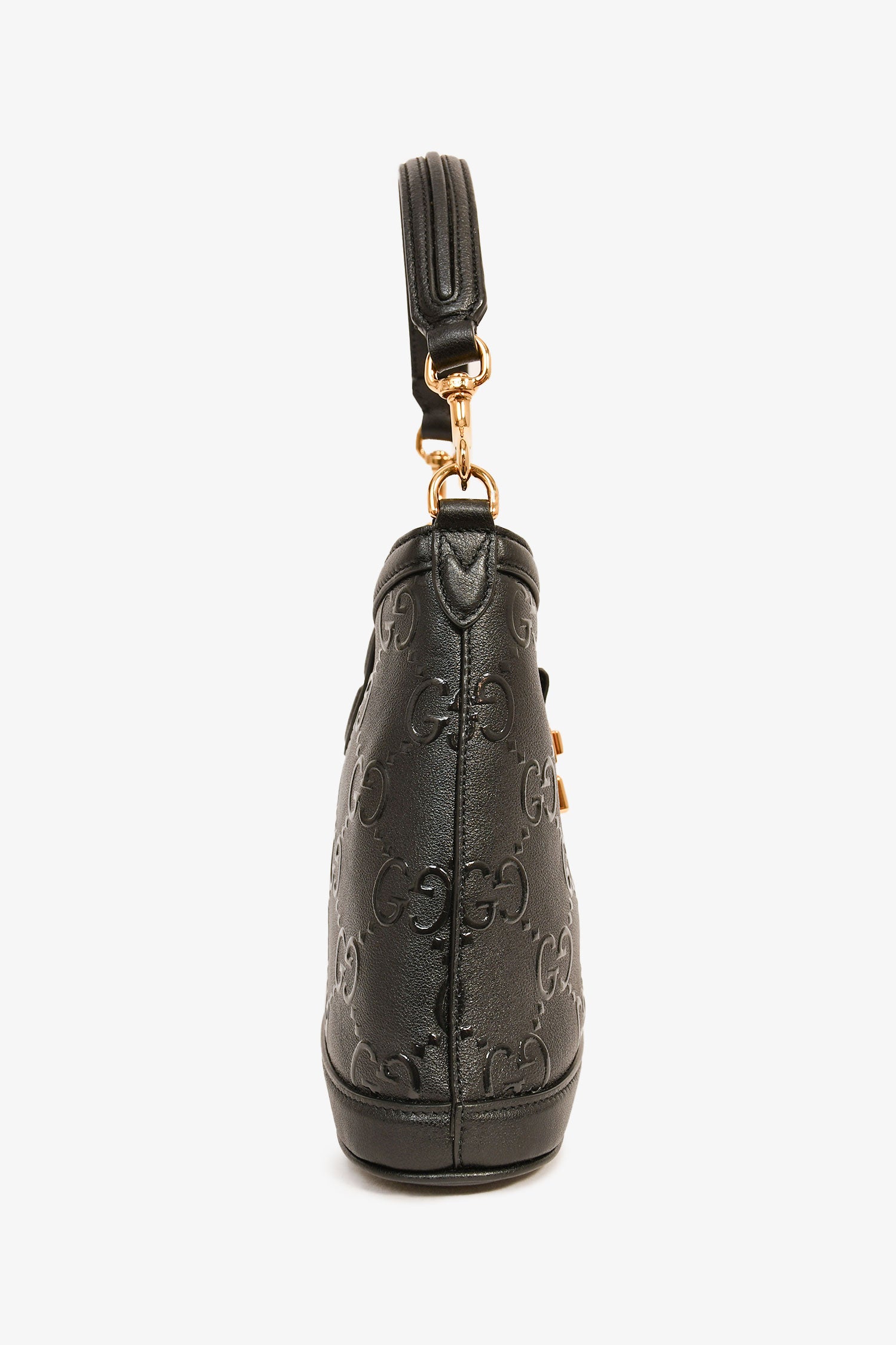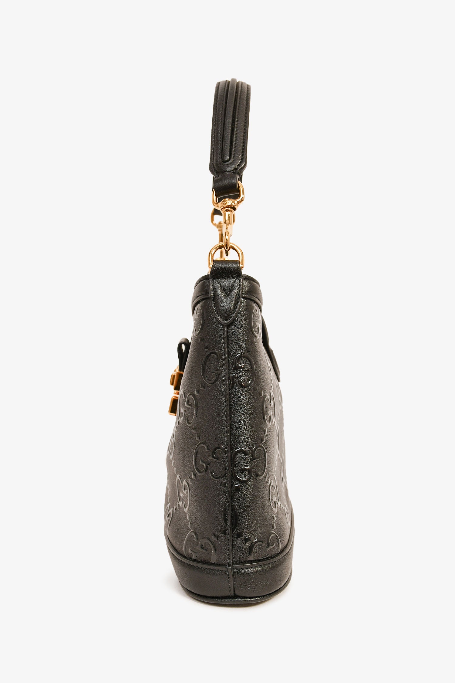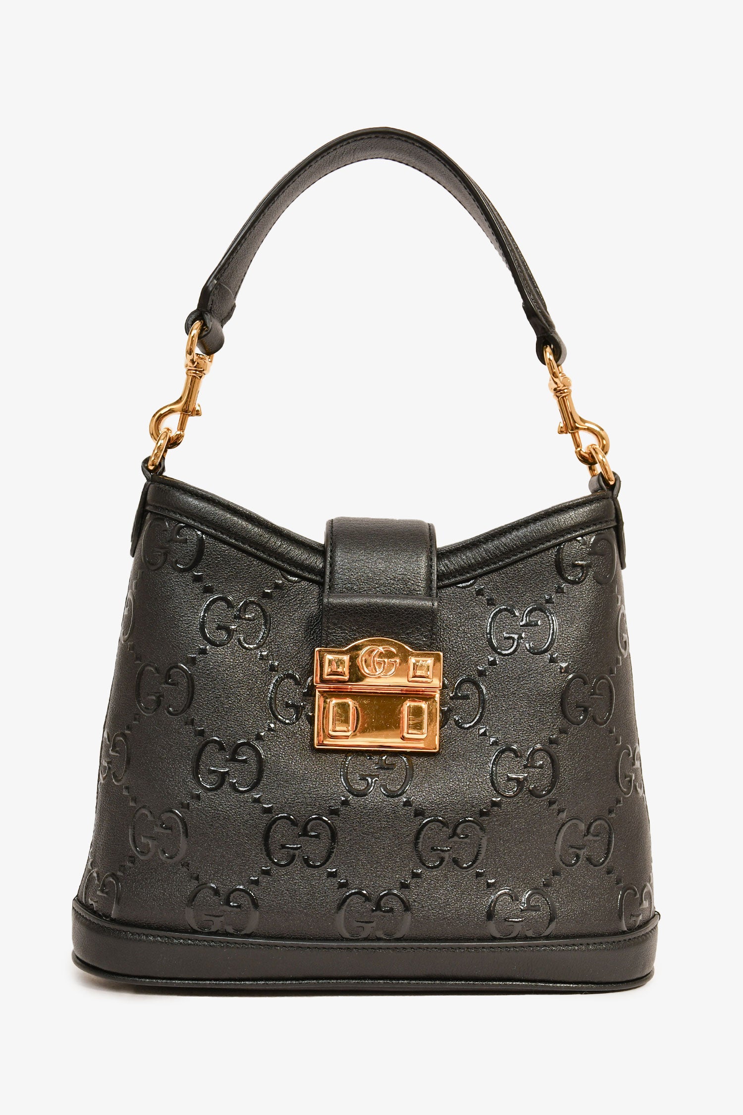 Refresh availabilityGucci Black GG Leather Small Wonka Top Handle. Front fold-over strap with a push-release closure. Single interior compartment with a wall slip pocket. Detachable strap. Textile lining. Gold-tone hardware. Tonal stitching.