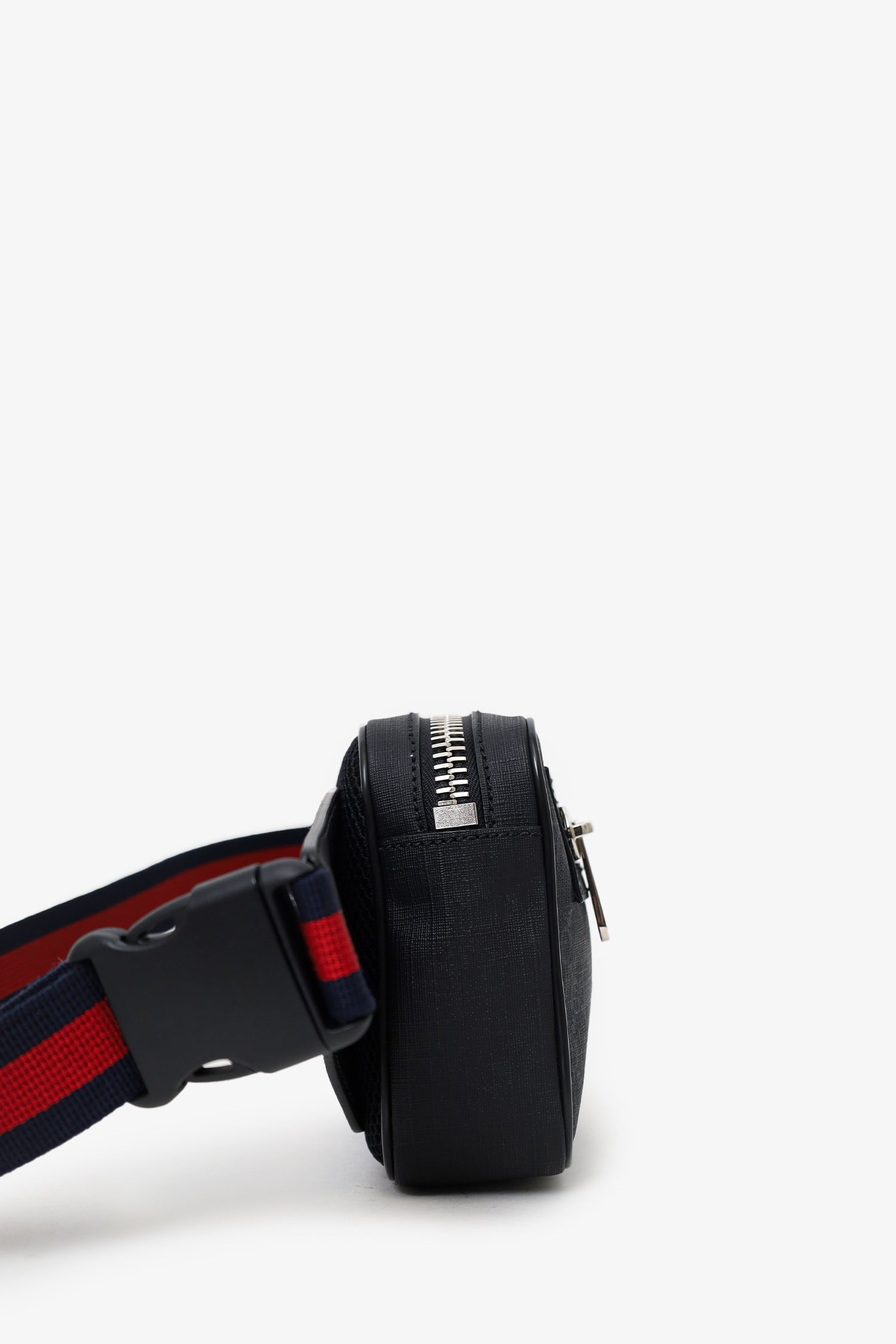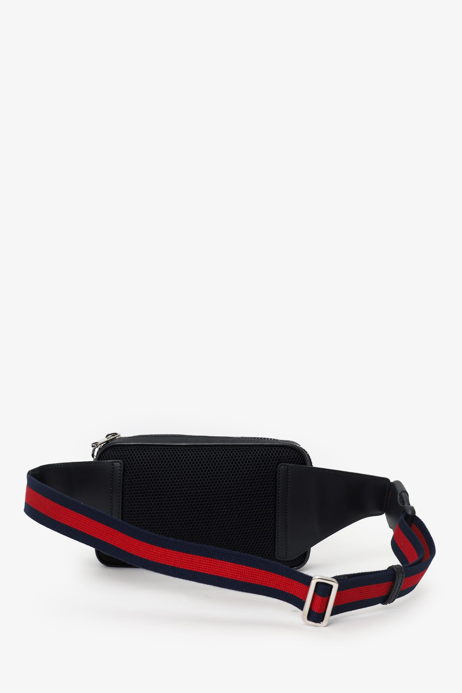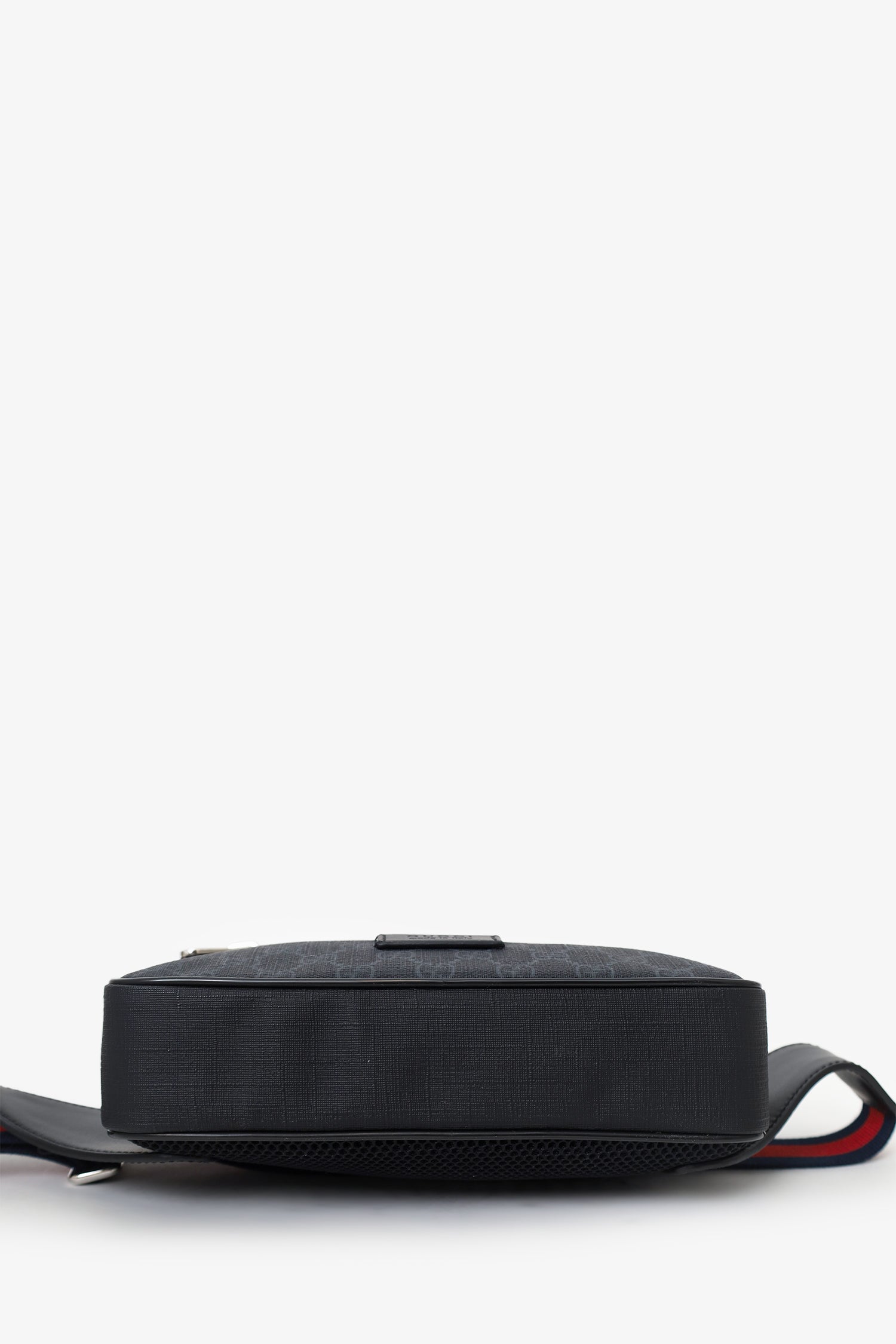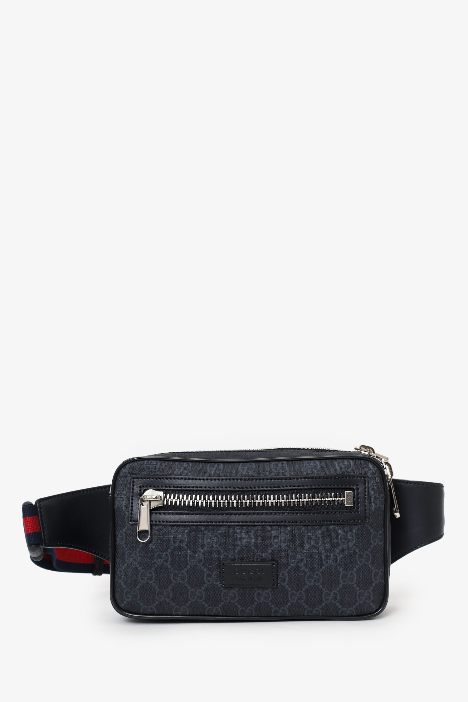 Refresh availabilityGucci Black GG Monogram Coated Canvas Web Belt Bag. Top-zip closure. Single belt-strap. Exterior front-zip pocket. Leather-lined interior. Single rear wall zip pocket. Silver-tone hardware. Tonal stitching.