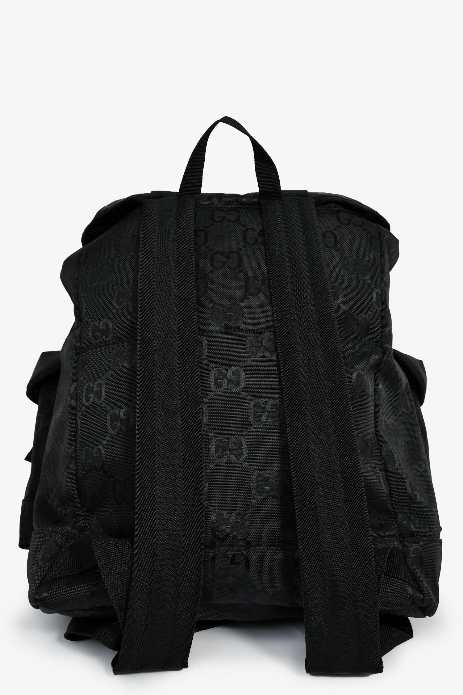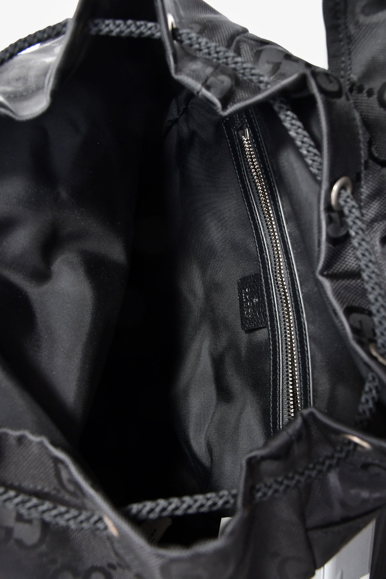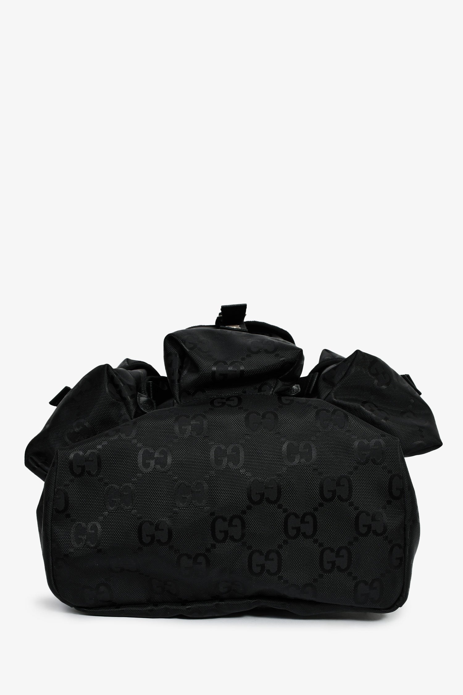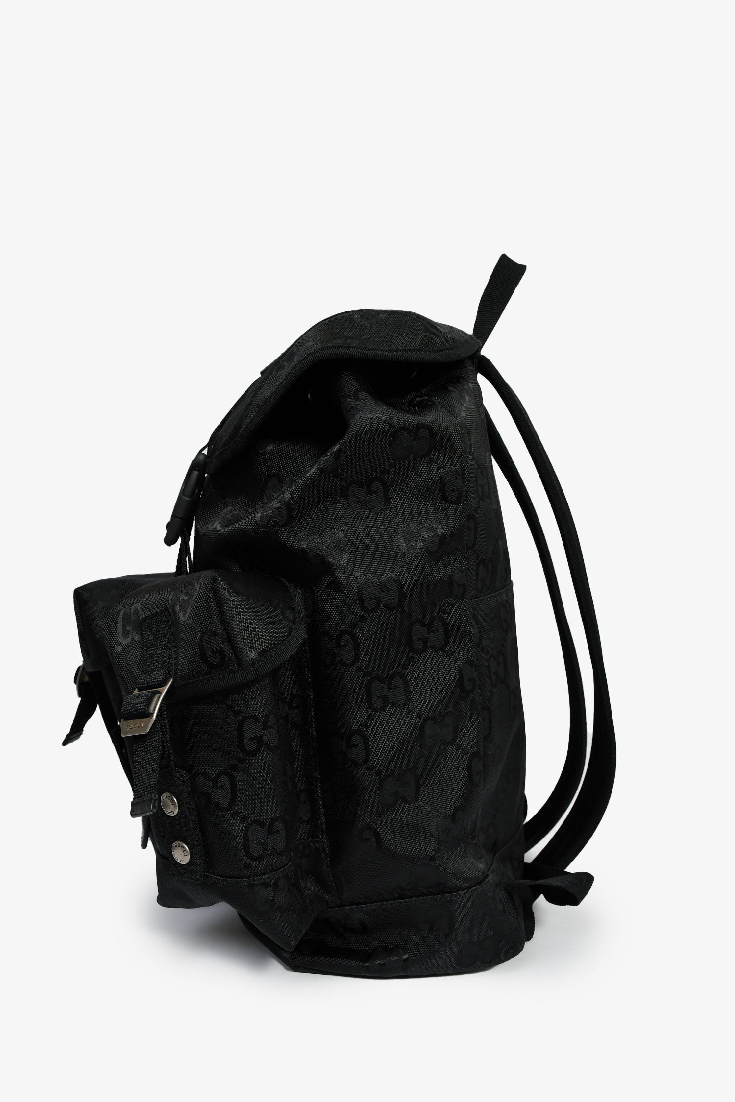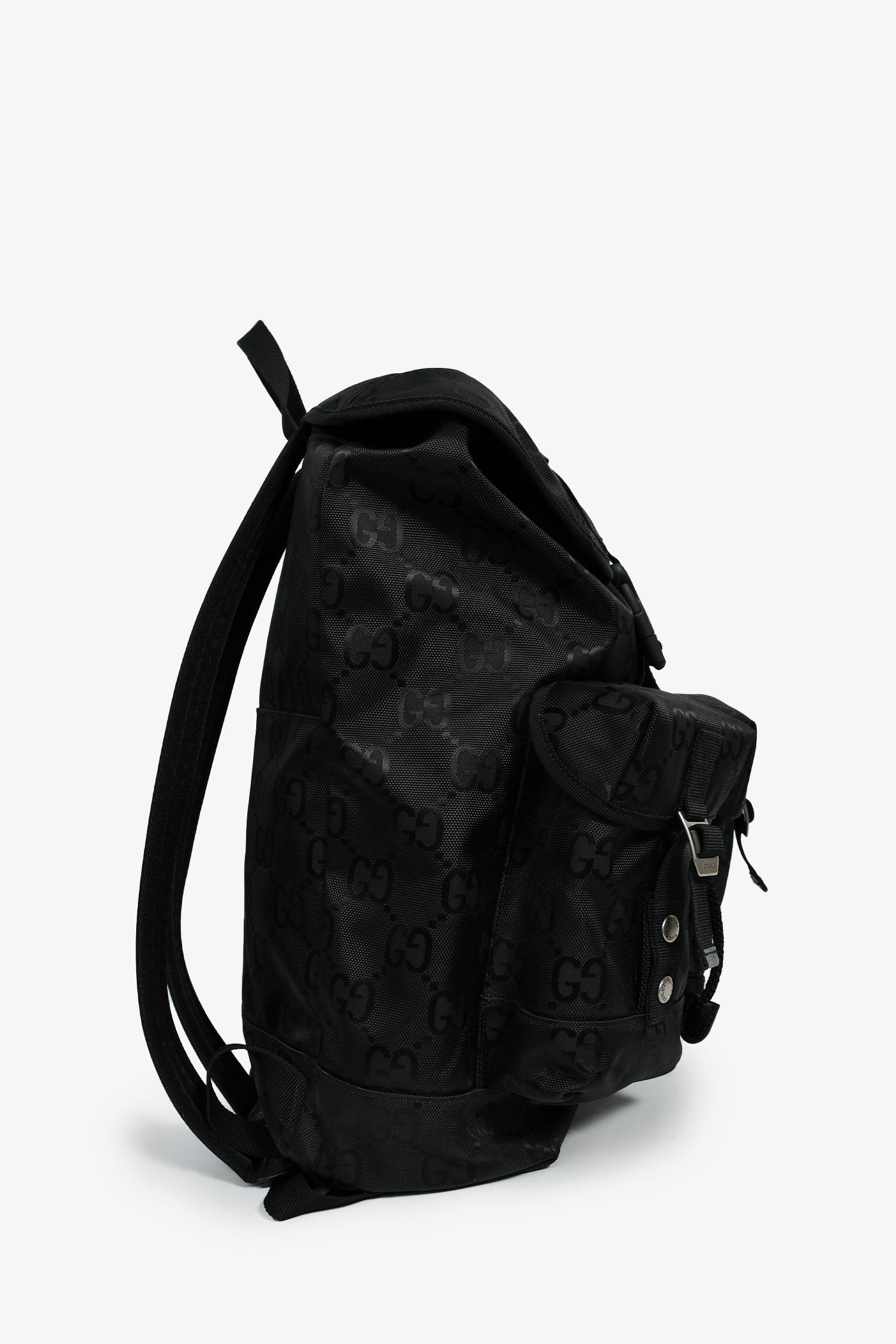 Refresh availabilityGucci Black GG Nylon Off The Grid Backpack. Front fold-over flap with snap-button closures. Front interior drawstring closure. Adjustable shoulder straps. 3 exterior front pockets with fold-over flap and buckle closure. Single interior wall zip pocket. Silver-tone hardware. Tonal stitching.