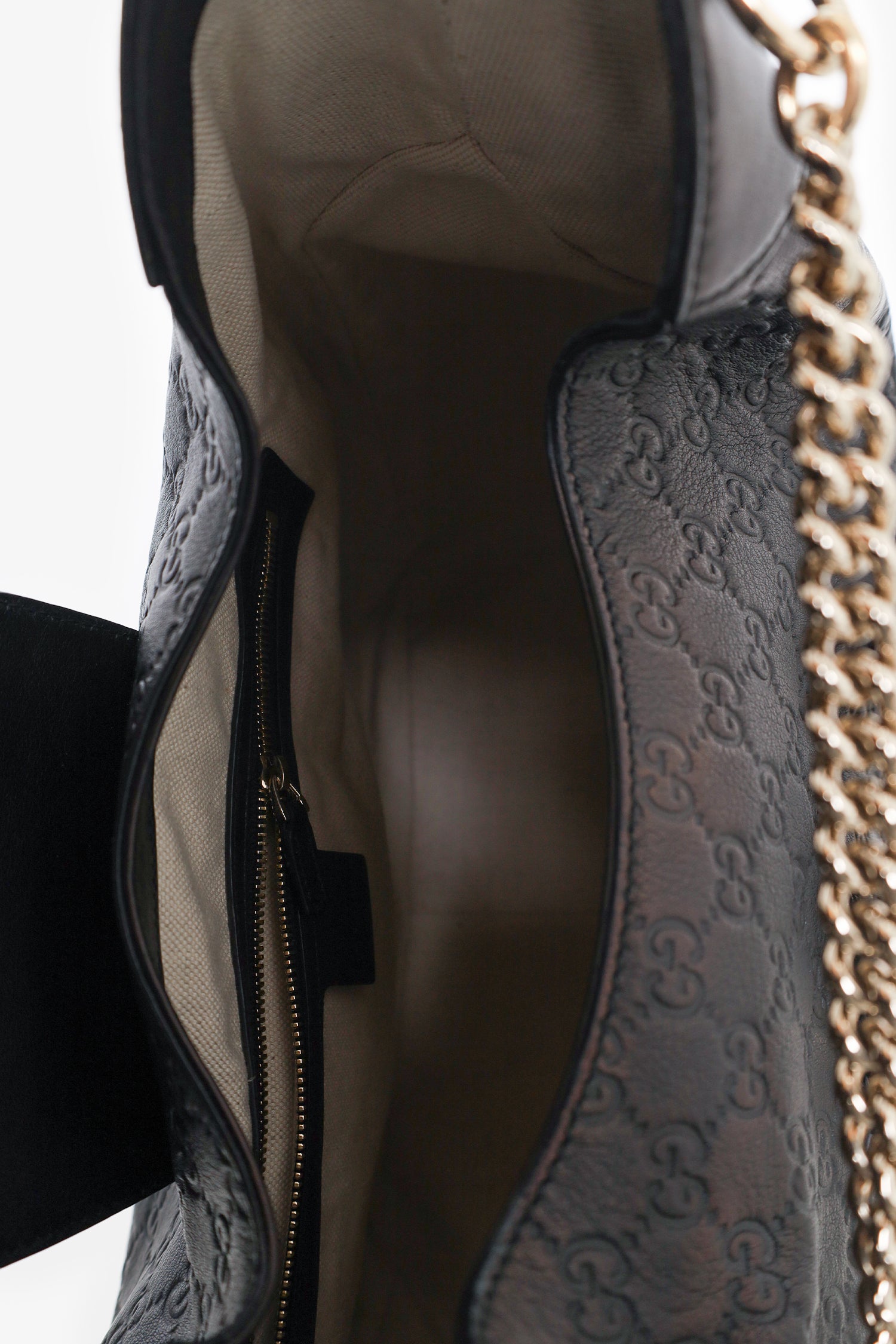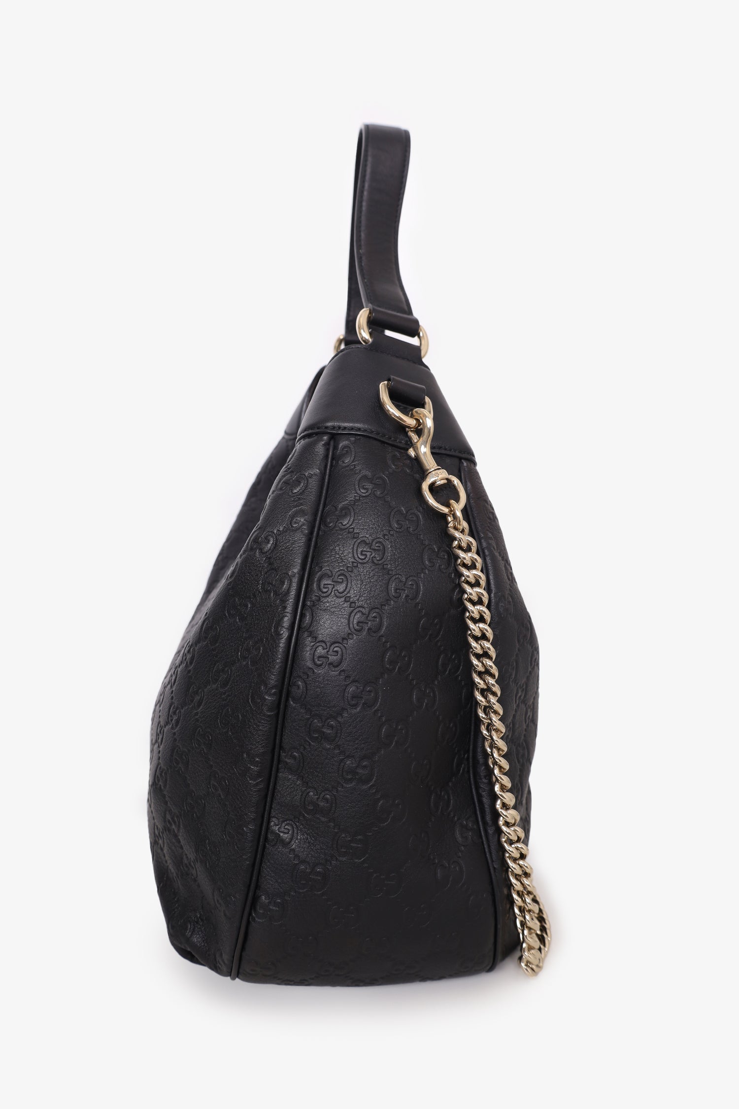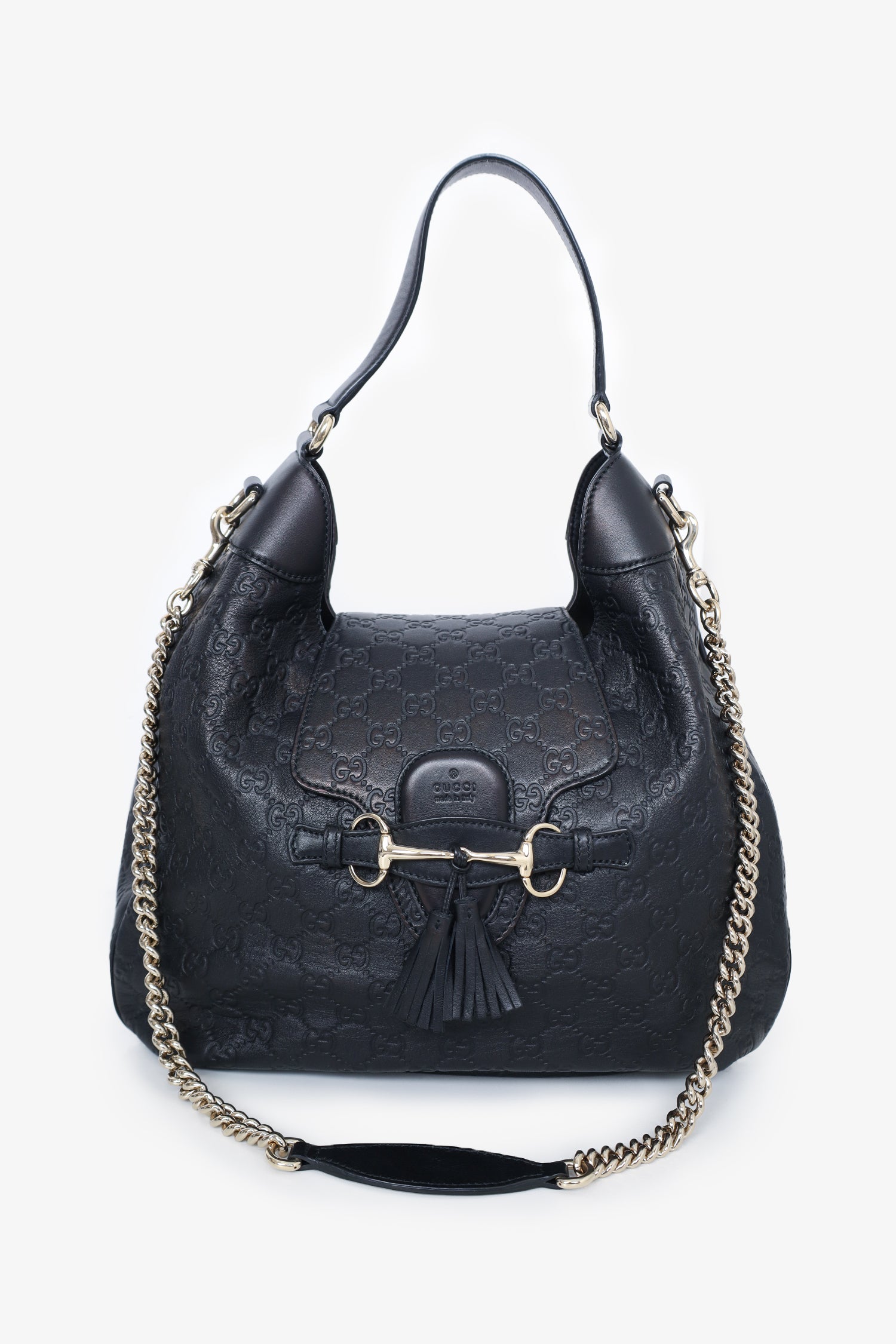 Refresh availabilityGucci Black GG Signature Medium Emily Flap Hobo Shoulder Bag. Flap closure. Removable crossbody chain. Interior zip pocket. Gold-tone hardware. Tonal stitching.