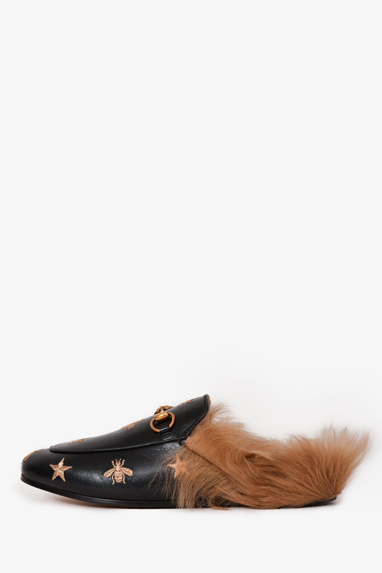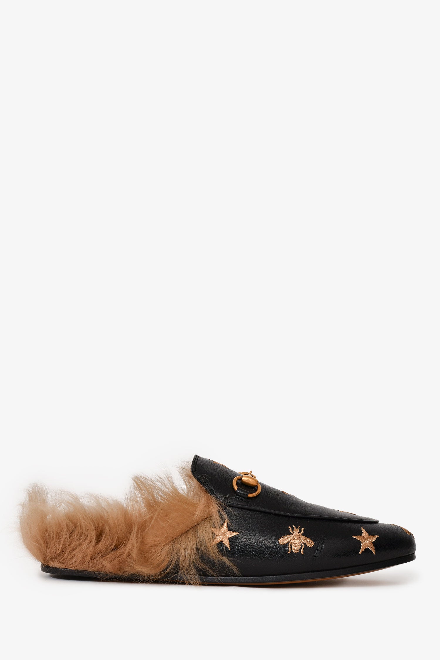 Refresh availabilityGucci Black/ Gold Bee Embroidered 'Princeton' Fur Mules. Slip on. Fur interior. Embroidered bees and stars. Horsebit hardware at front. Gold-toned hardware. Tonal stitching.