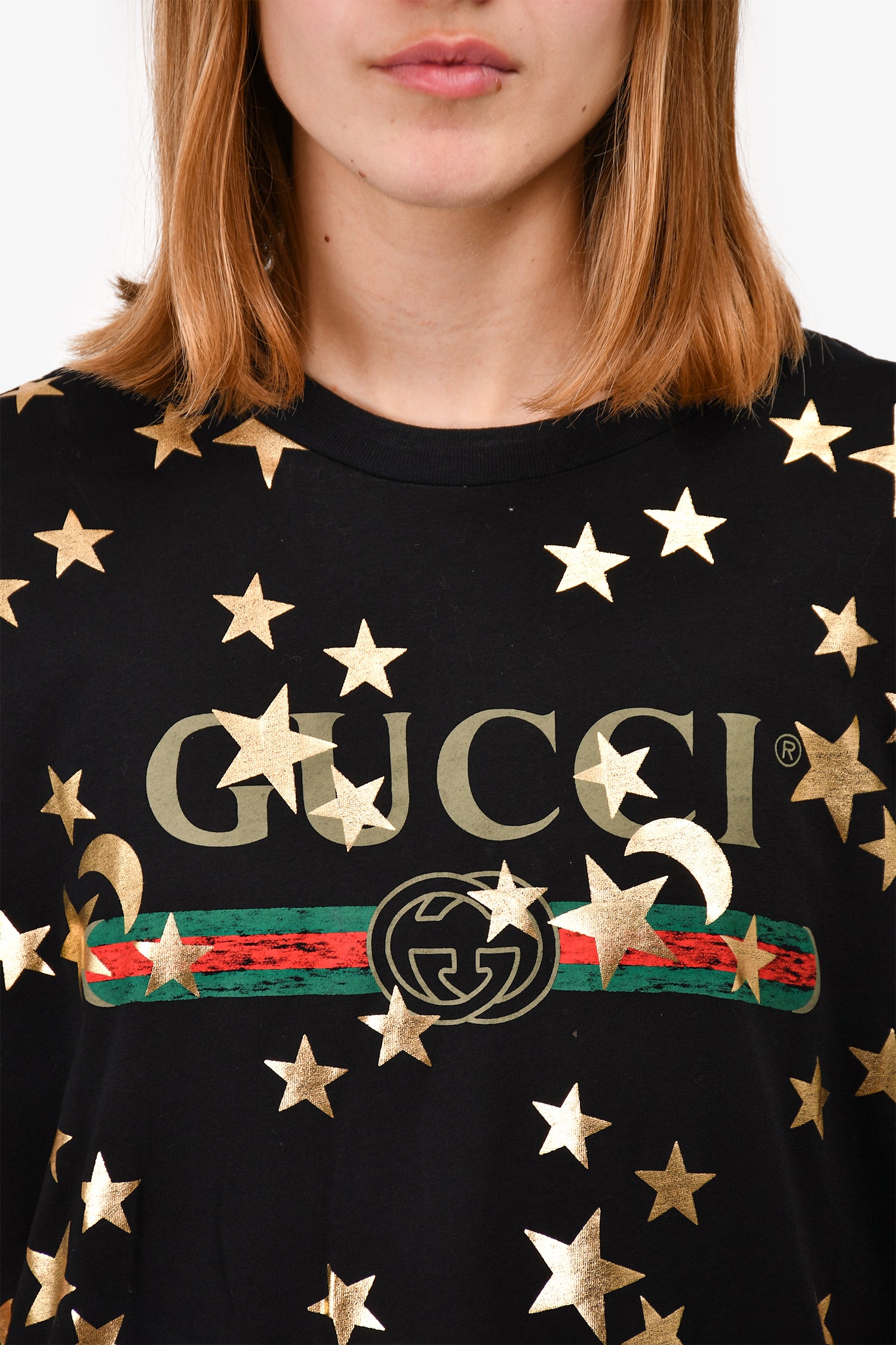 Refresh availabilityGucci Black/Gold Star Logo T-Shirt. Round neckline. Tonal stitching.
