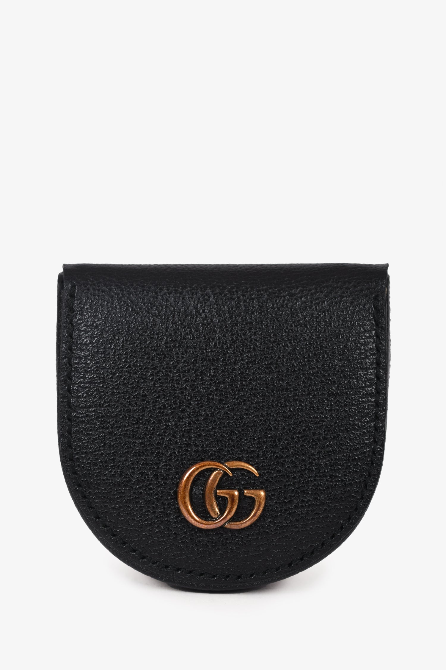 Refresh availabilityGucci Black Grained Leather 'GG' Logo Coin Purse. 2 interior compartments; separated by a divider. Gold-tone hardware. Tonal stitching.