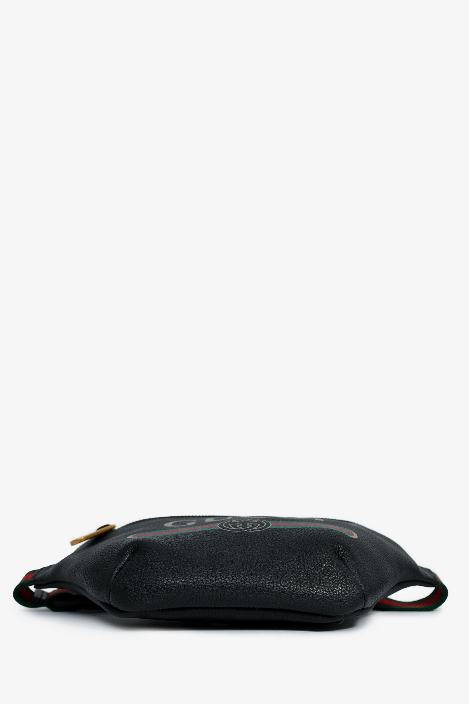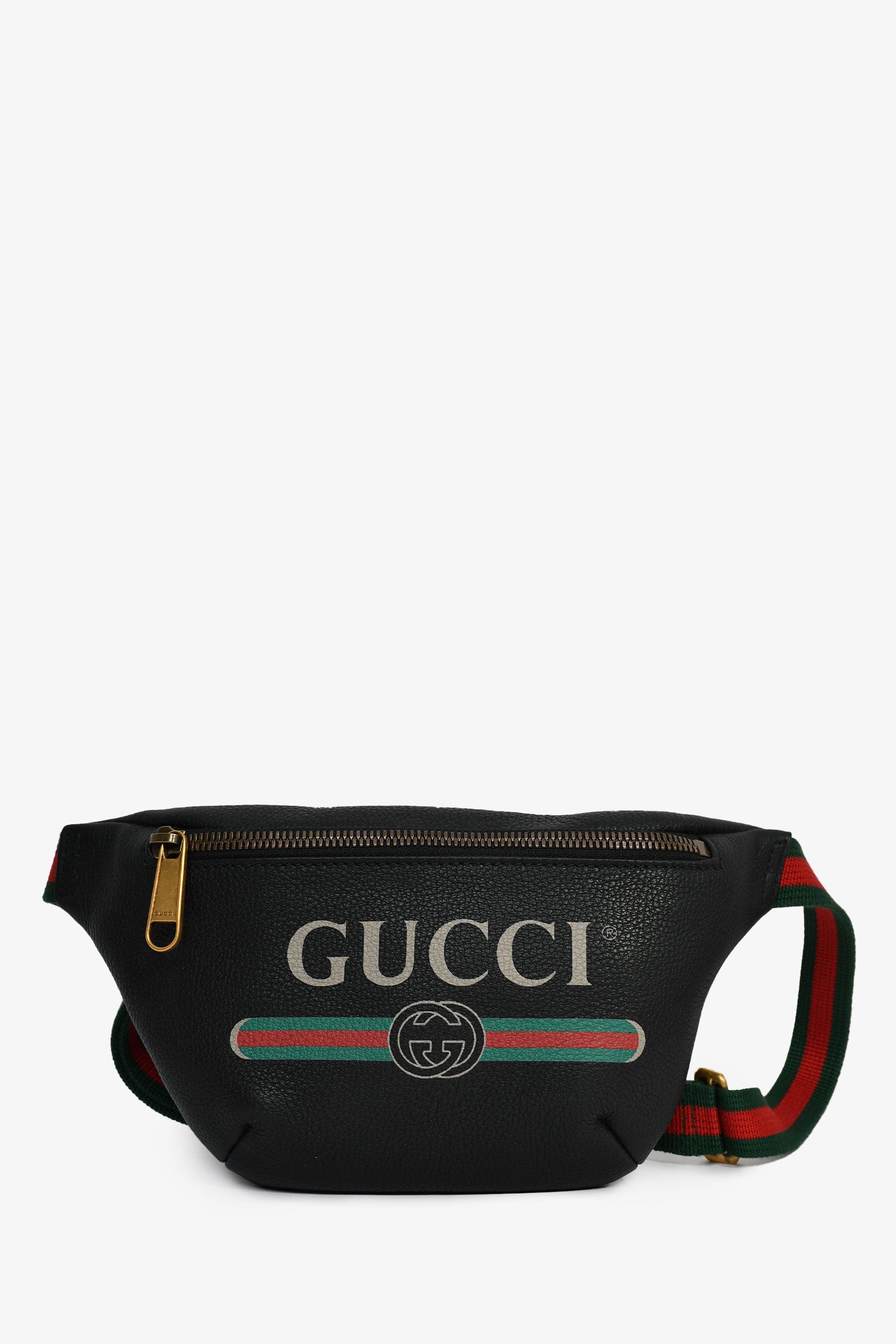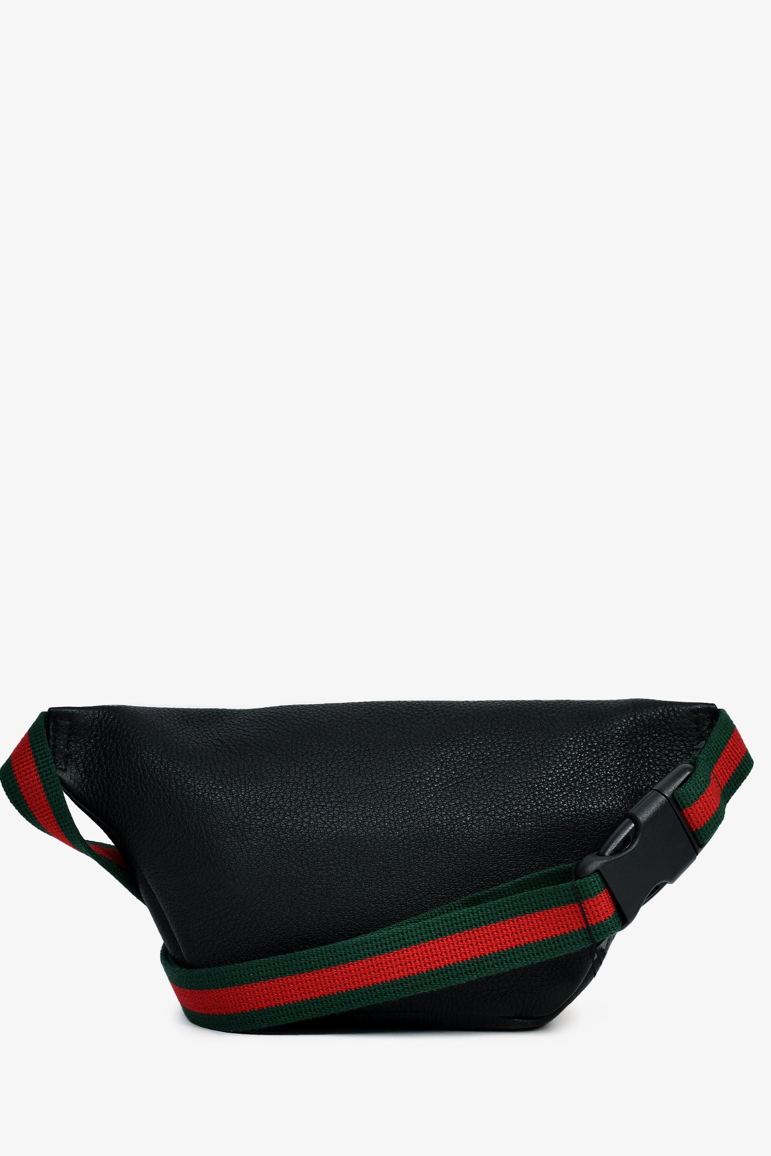 Refresh availabilityGucci Black Grained Leather Small Web Belt Bag. Gold-tone hardware. Zipped front. Lined canvas interior. Webbed green/red straps with a buckle. Tonal stitching.