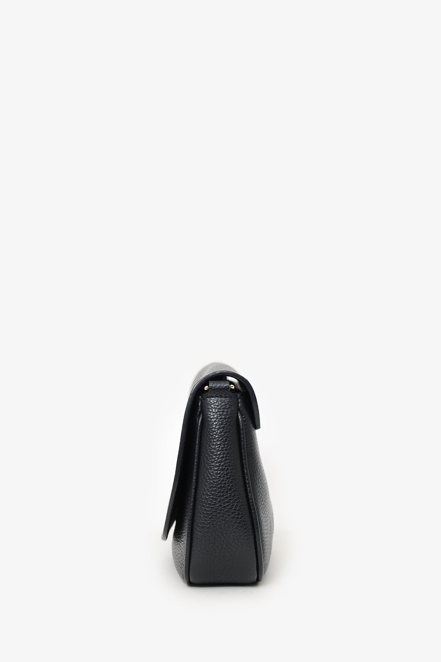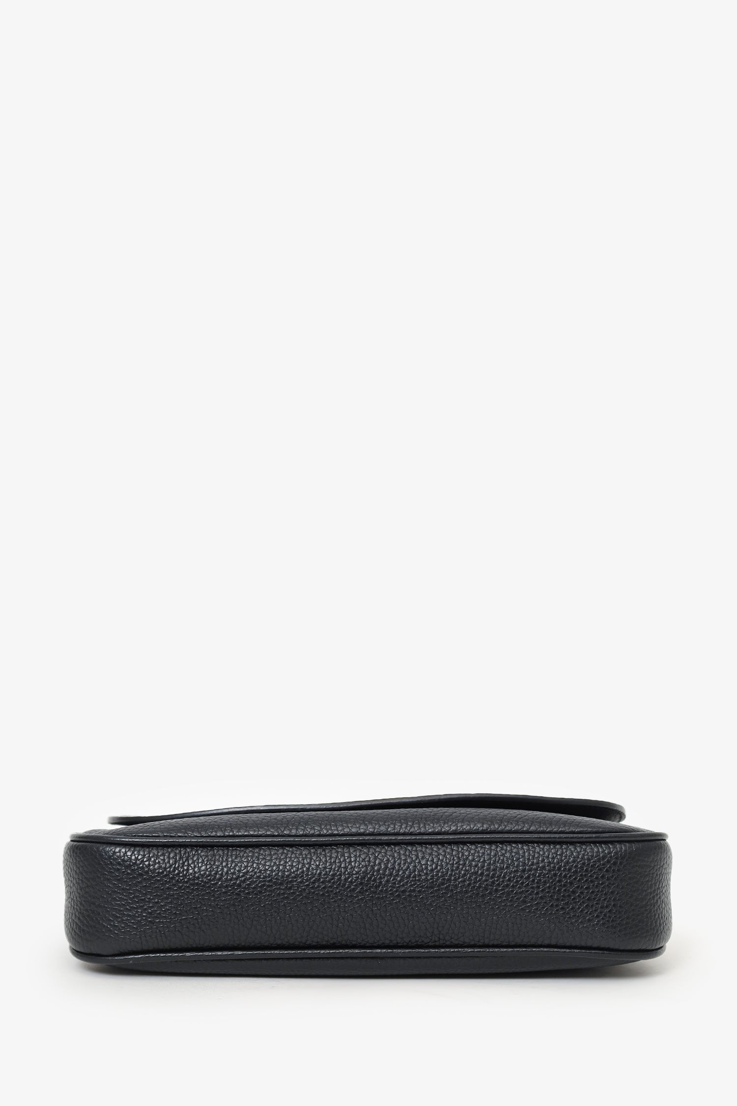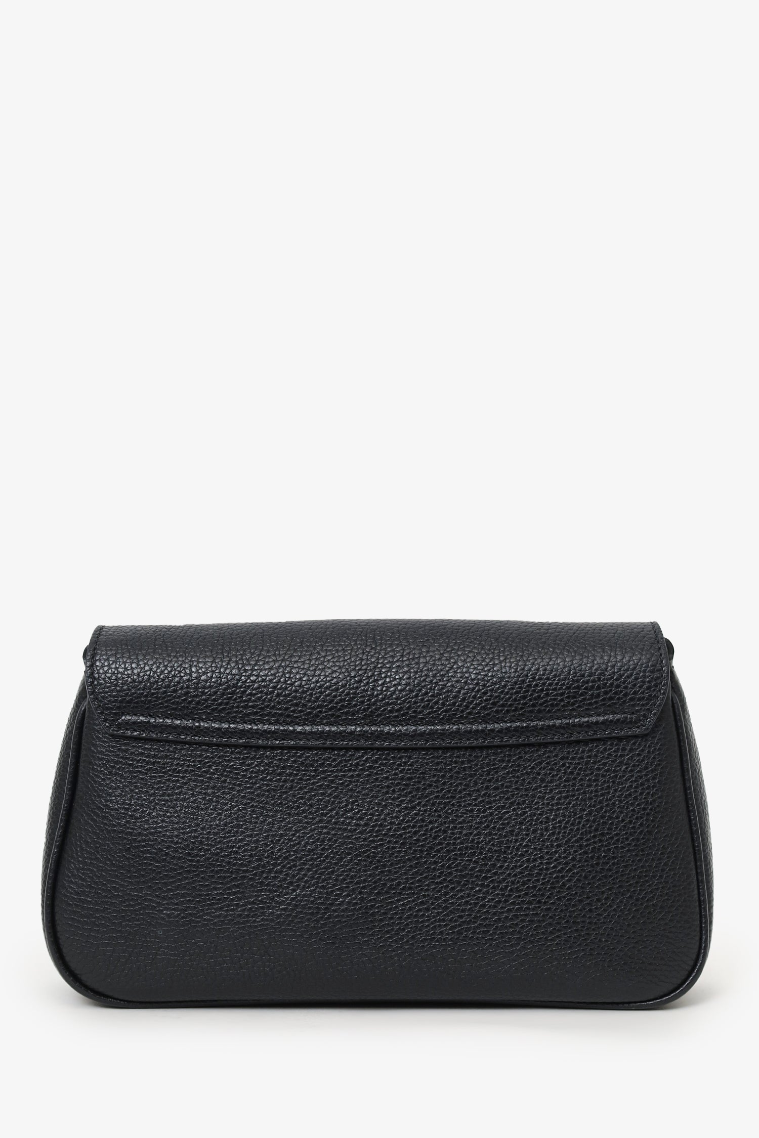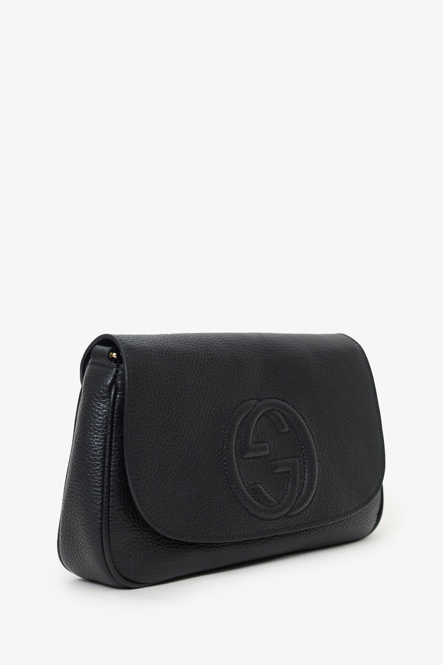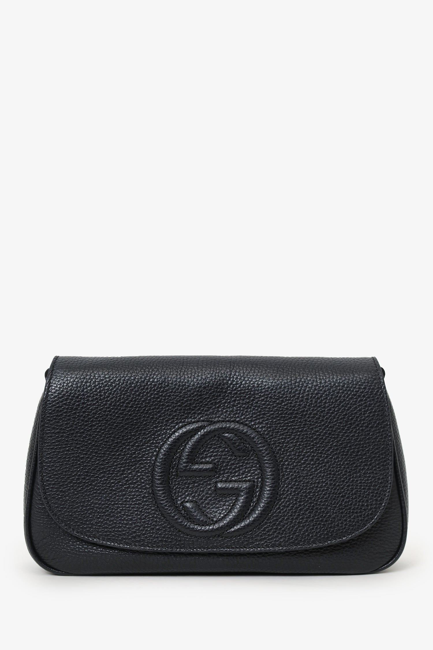 Refresh availabilityGucci Black Grained Leather 'Soho' Medium Flap Crossbody. Front fold-over flap with magnetic snap-button closure. Chainlink strap. Lined interior. 2 interior pockets; 1 slip and 1 zip. Silver-tone hardware. Tonal stitching.