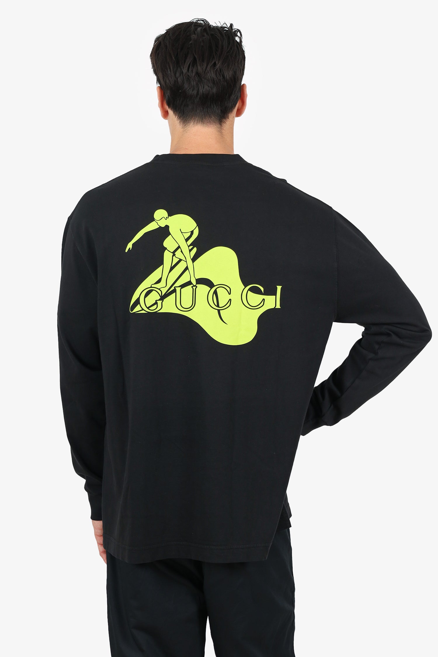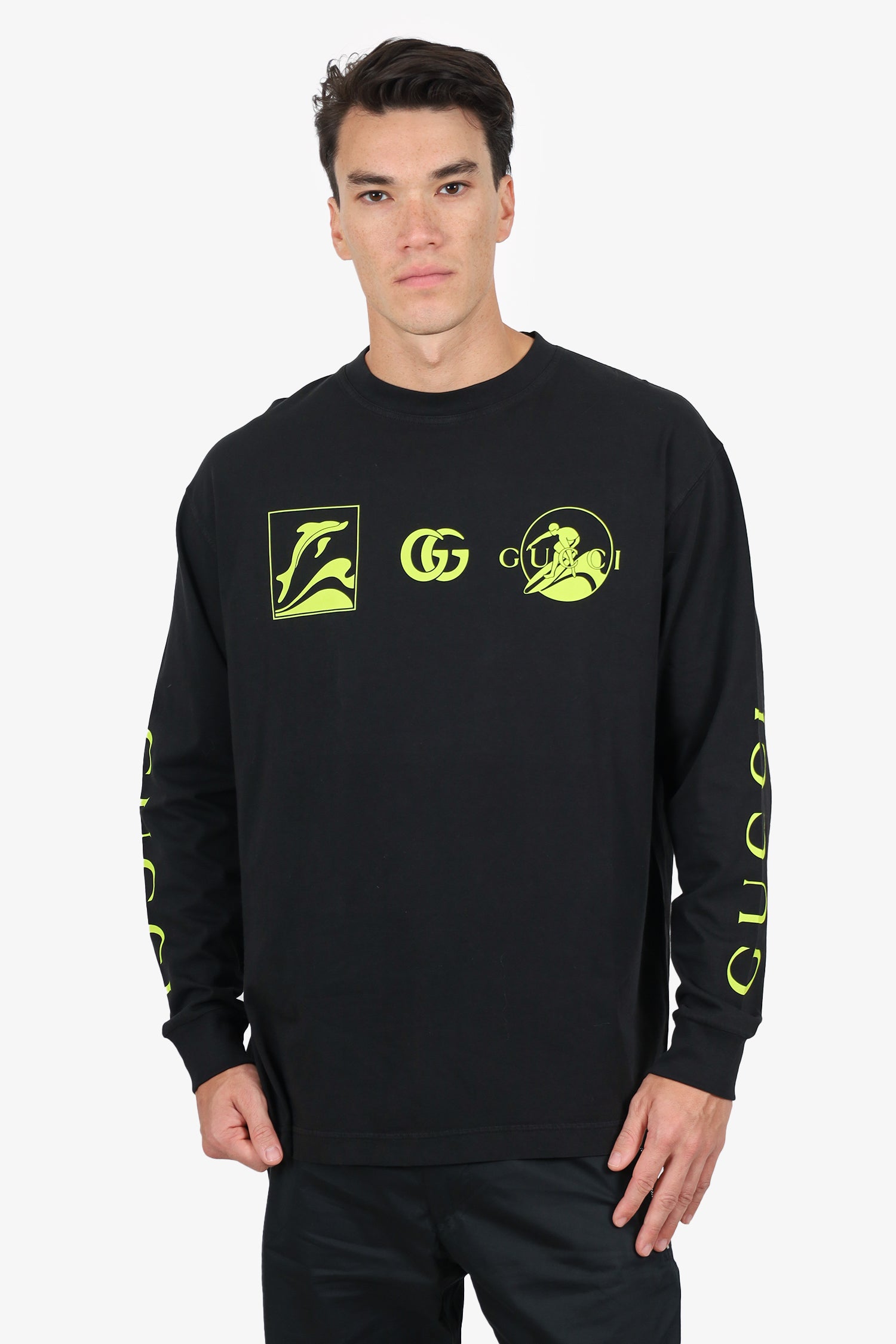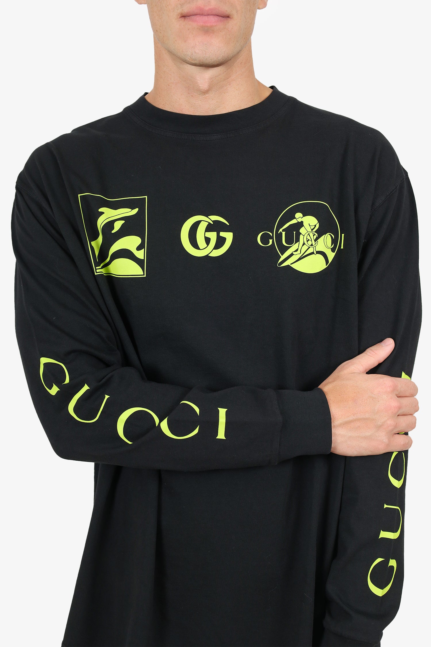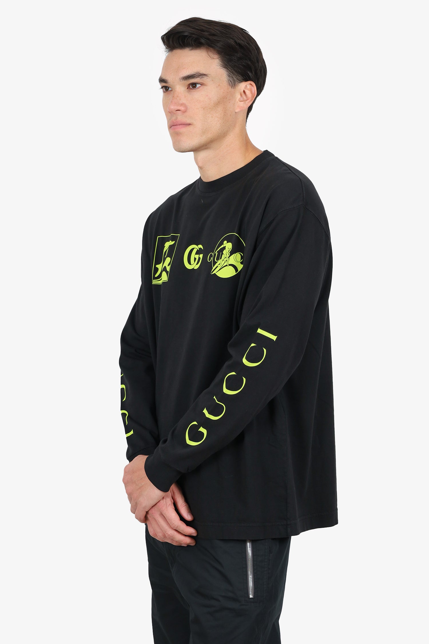 Refresh availabilityGucci Black/Green Printed Long Sleeve T-shirt. Pull-on. Round neckline. Graphic printed at front, rear and sleeves. Tonal stitching.