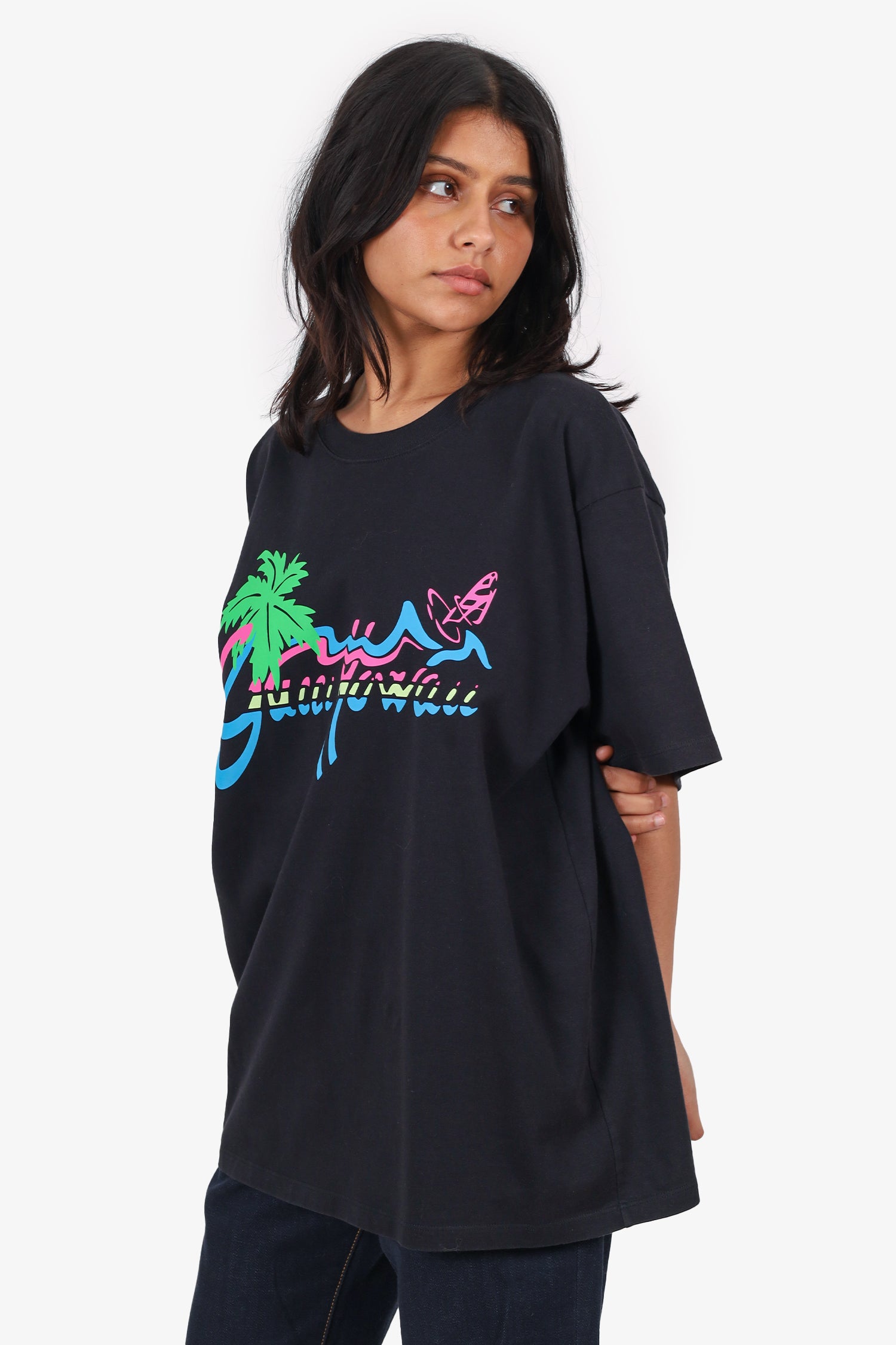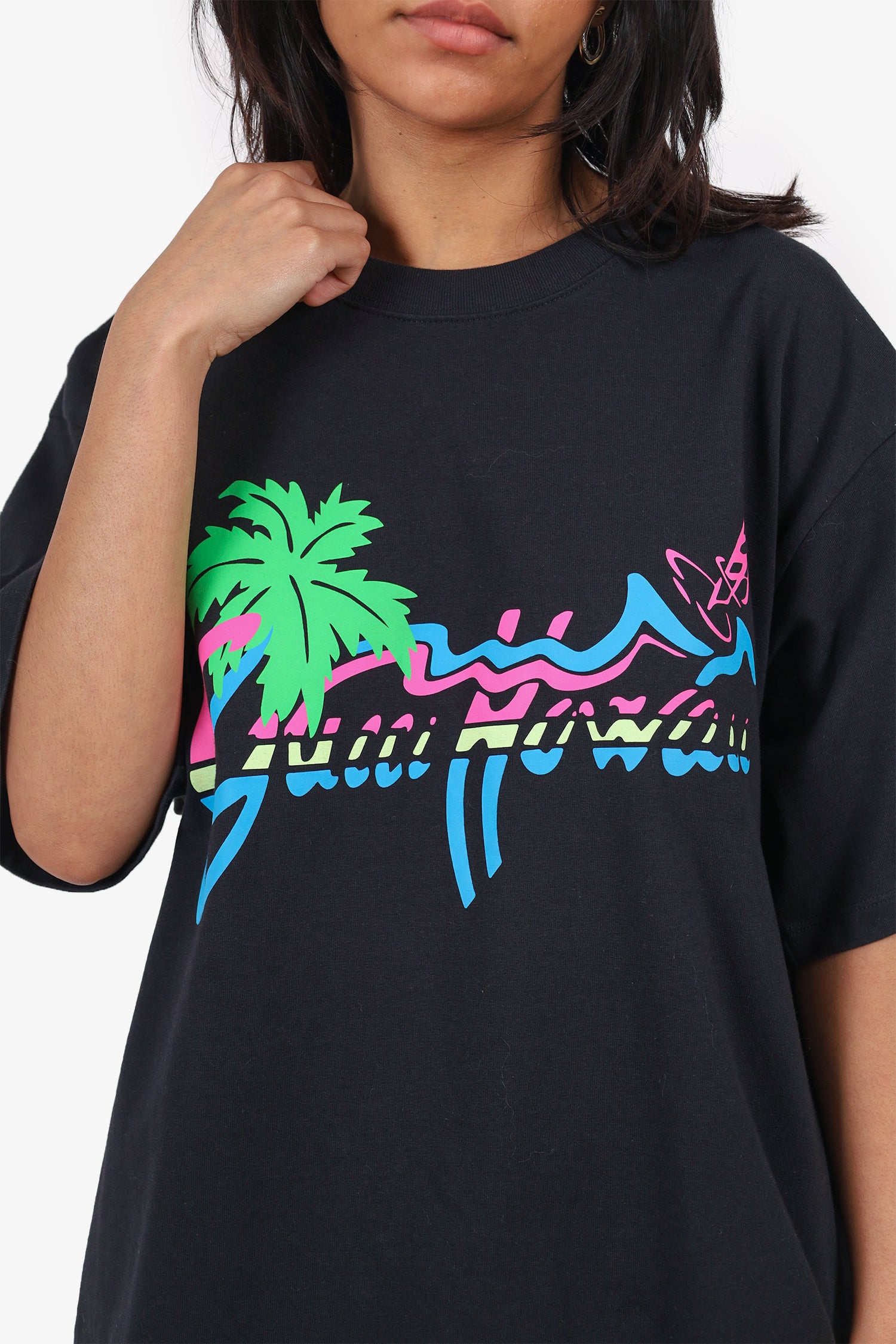 Refresh availabilityGucci Black 'Gucci Hawaii' Print T-Shirt. Pull-on. Round neckline. Front graphic. Tonal stitching.