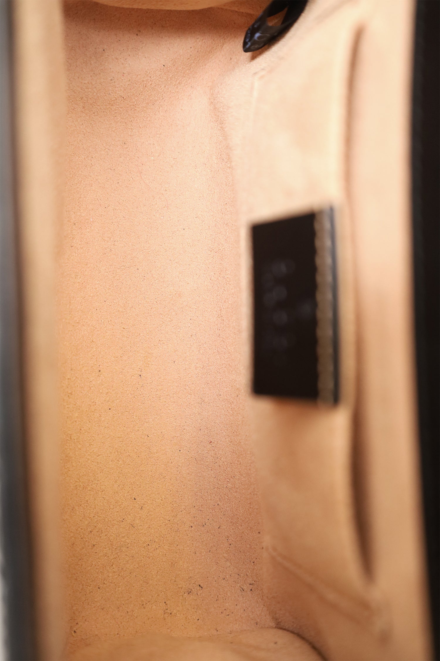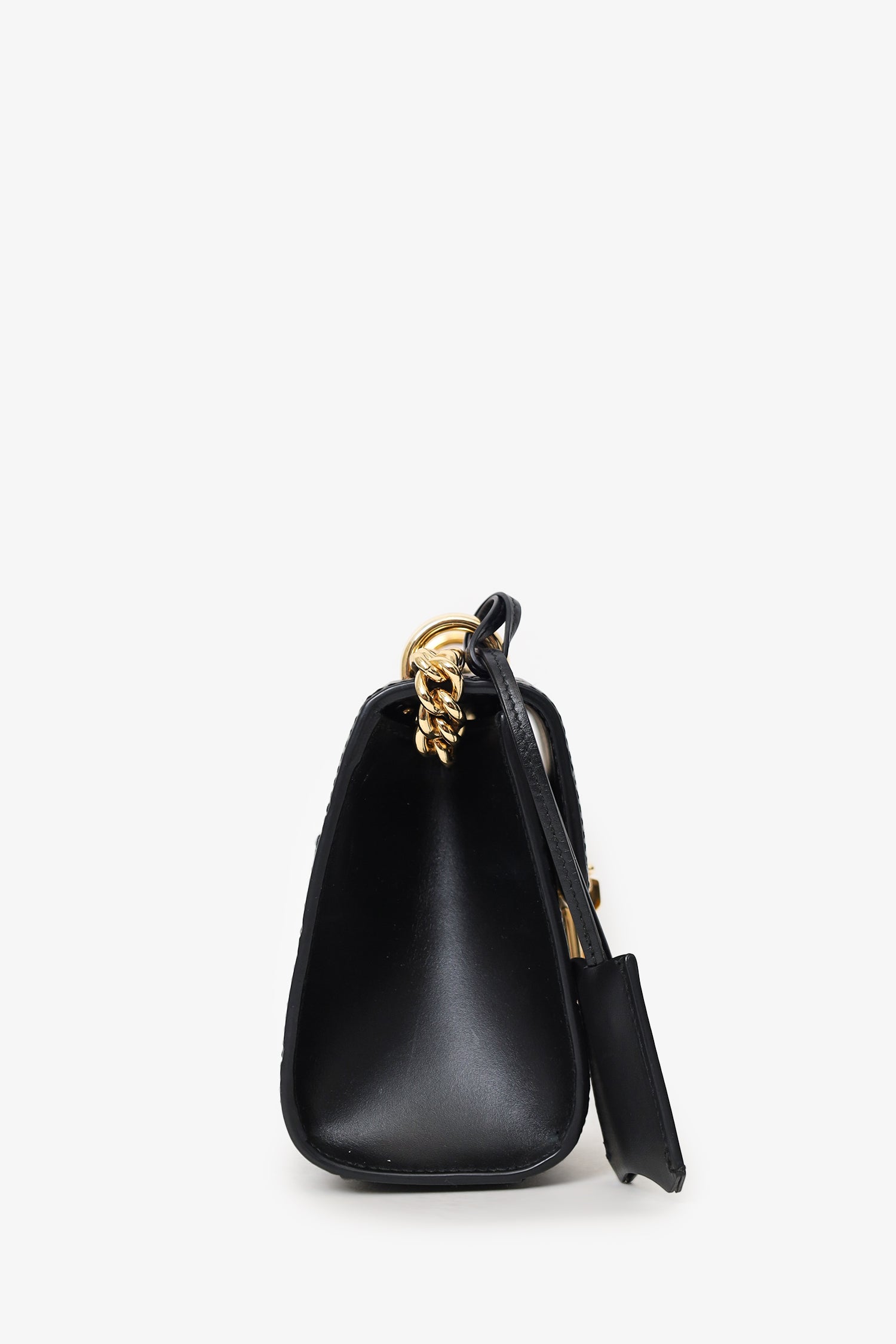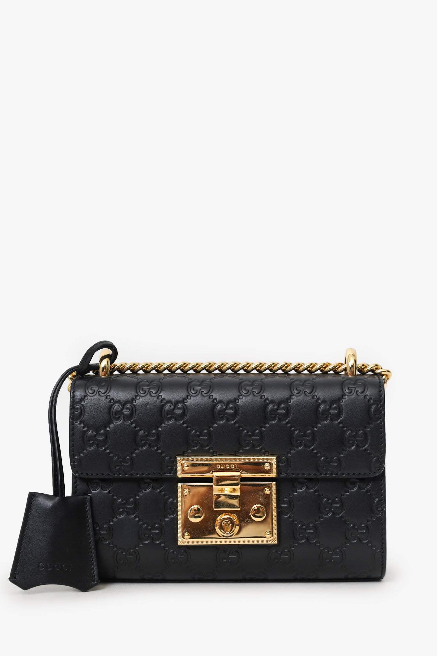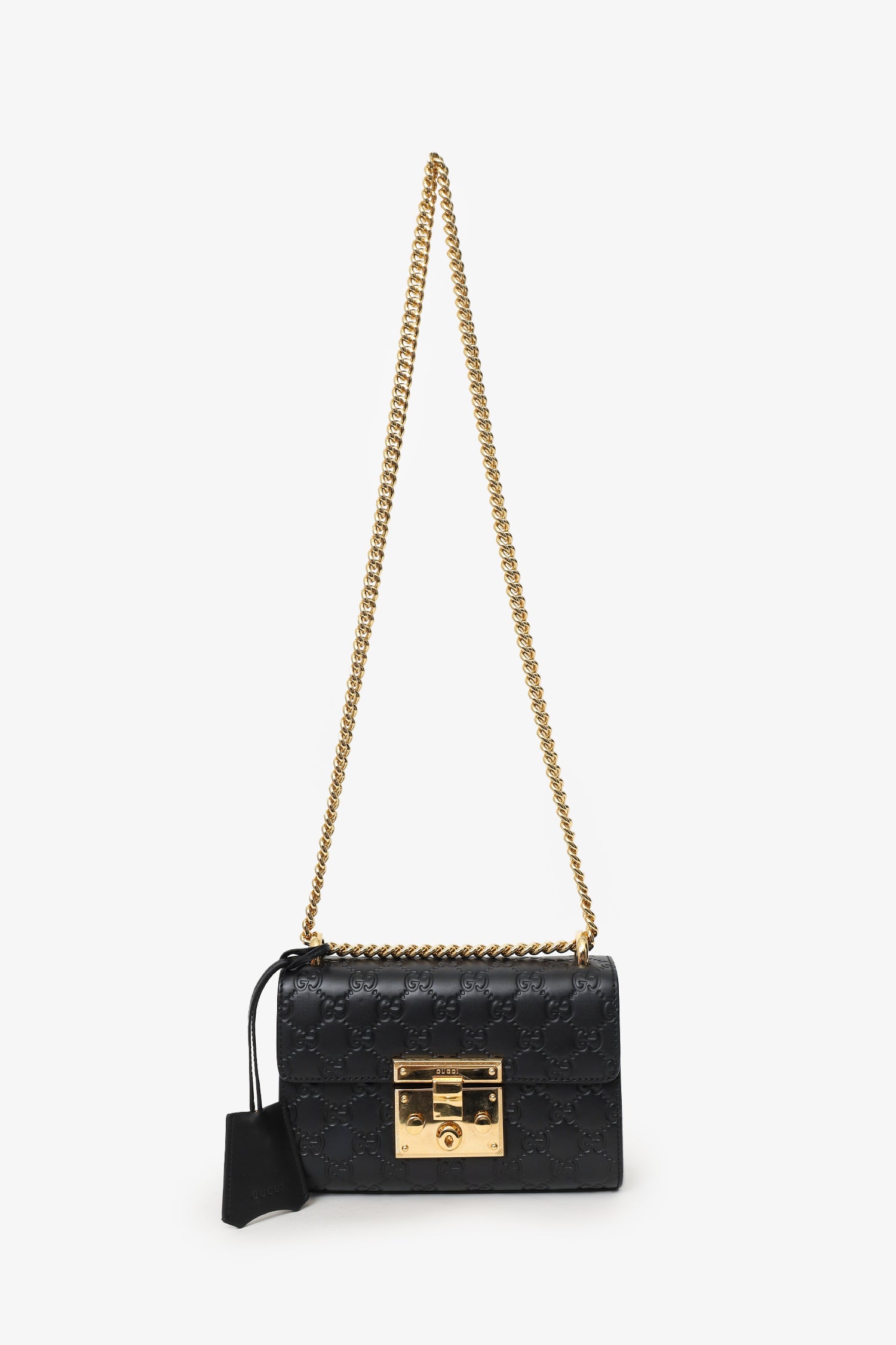 Refresh availabilityGucci Black Guccissima Leather Small Padlock Bag. Front fold-over flap with push-lock closure. Chainlink strap that can be doubled as shoulder straps. Single rear slip pocket. Removable clochette. Suede-lined interior. Single interior slip pocket. Gold-tone hardware. Tonal stitching.