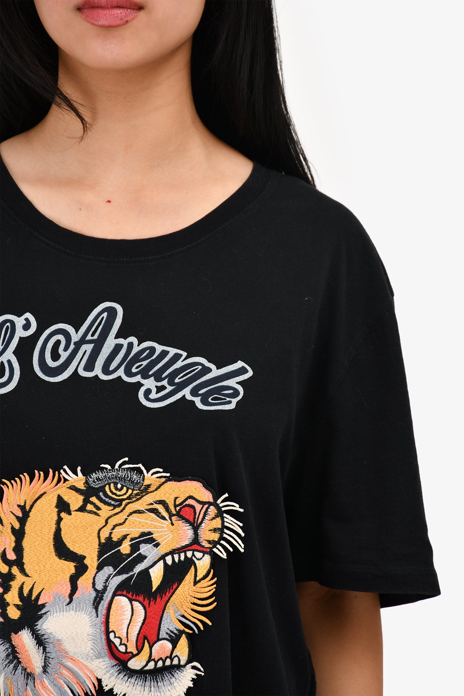 Refresh availabilityGucci Black 'L'Aveugle Par Amour' Tiger Embroidered T-Shirt. Round neck. Pull-on.