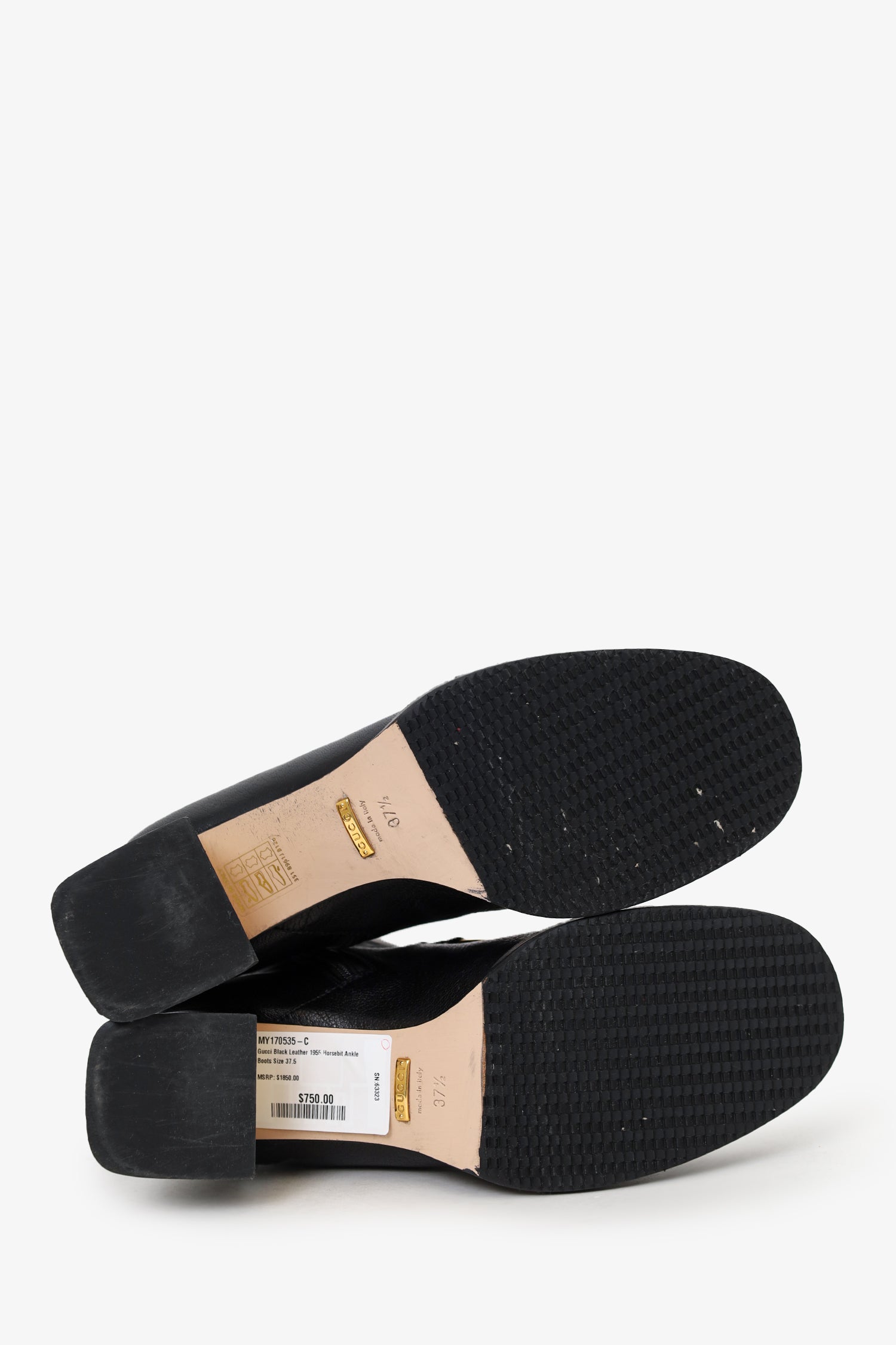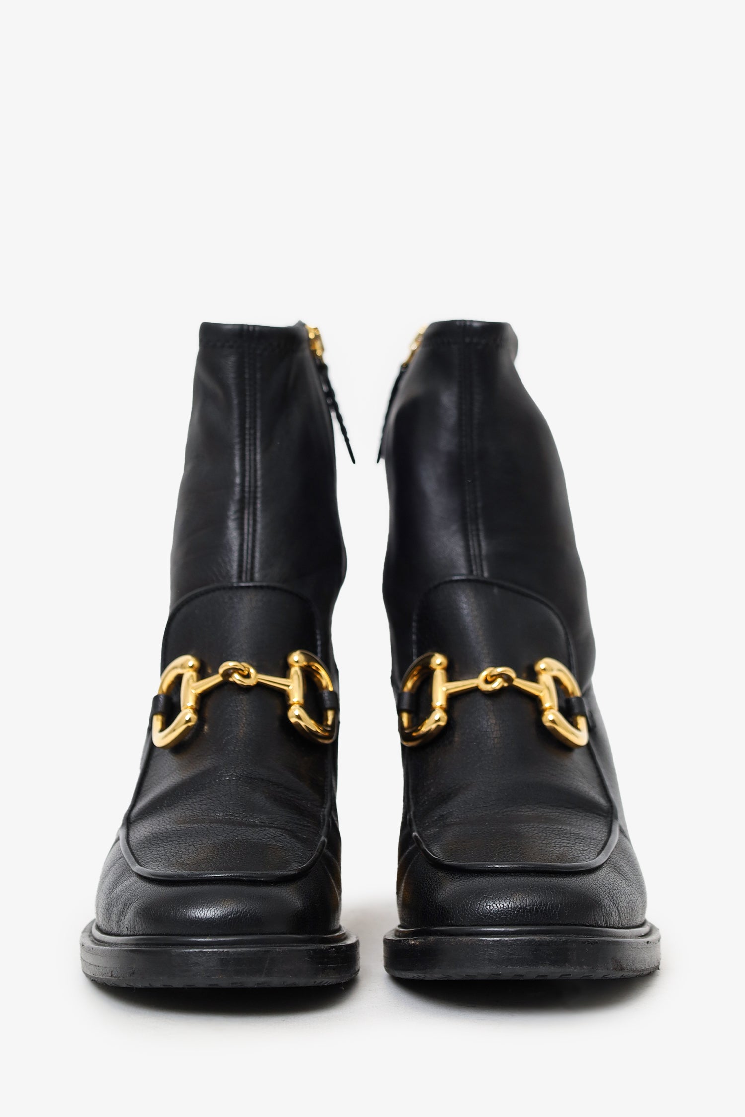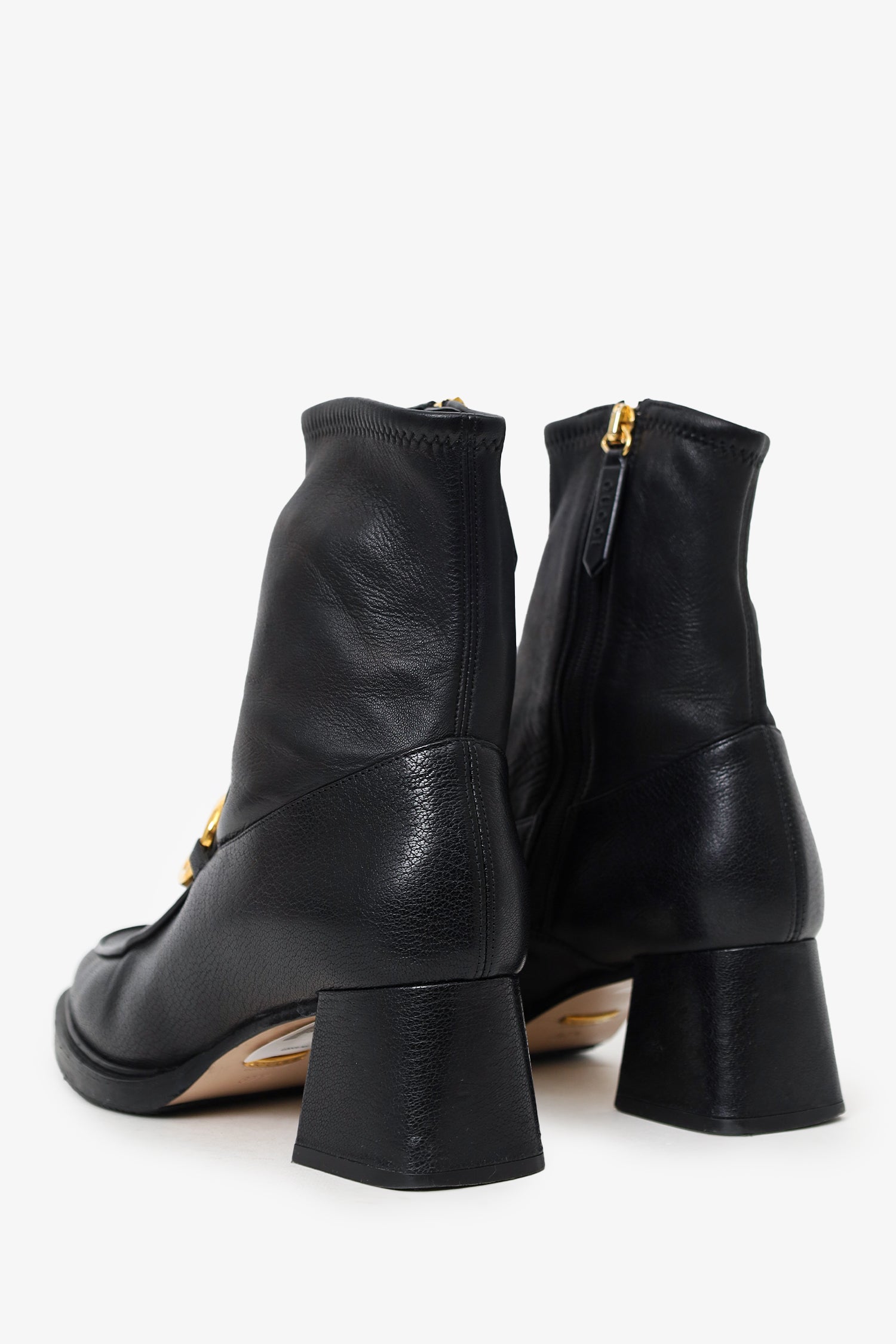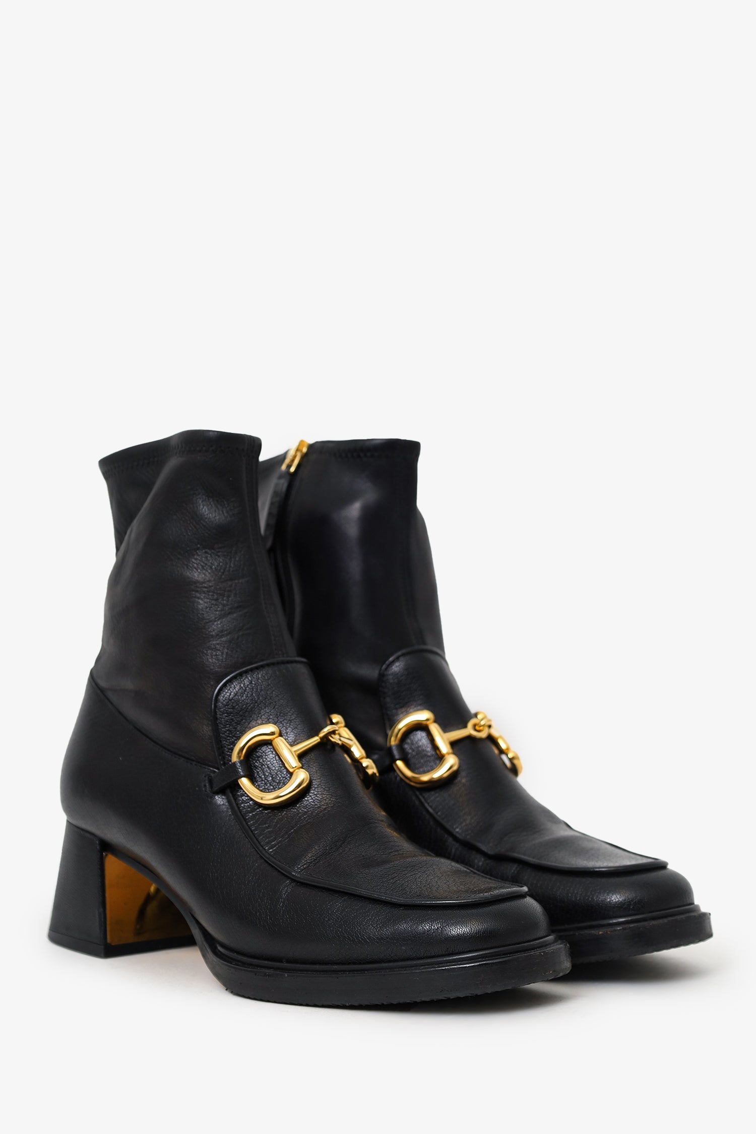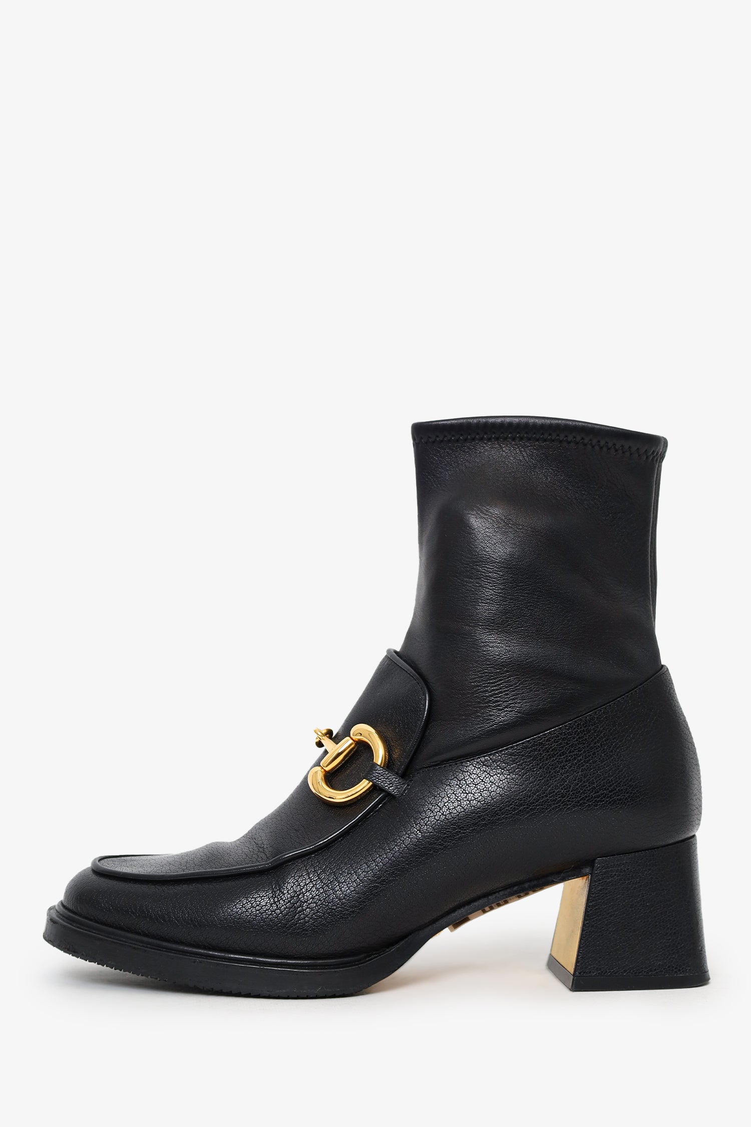 Refresh availabilityGucci Black Leather 1955 Horsebit Ankle Boots. Pull-on. Round-toe. Side zip closure. Gold-tone hardware. Tonal stitching.
