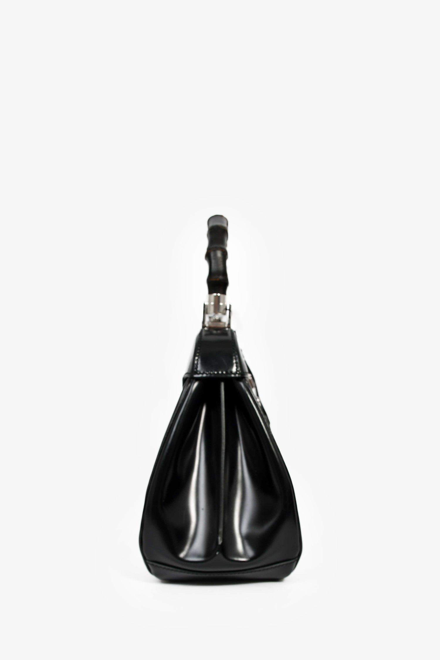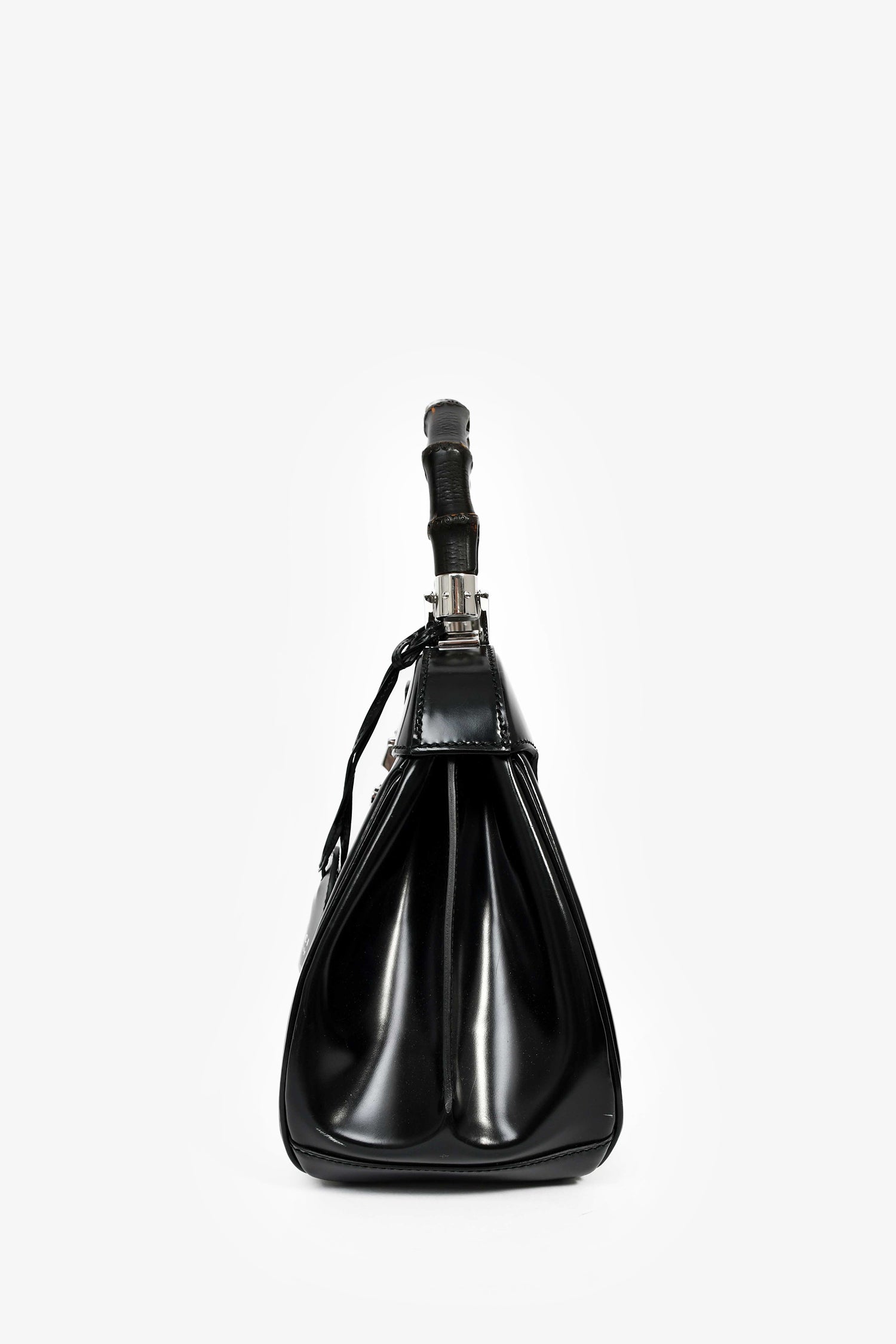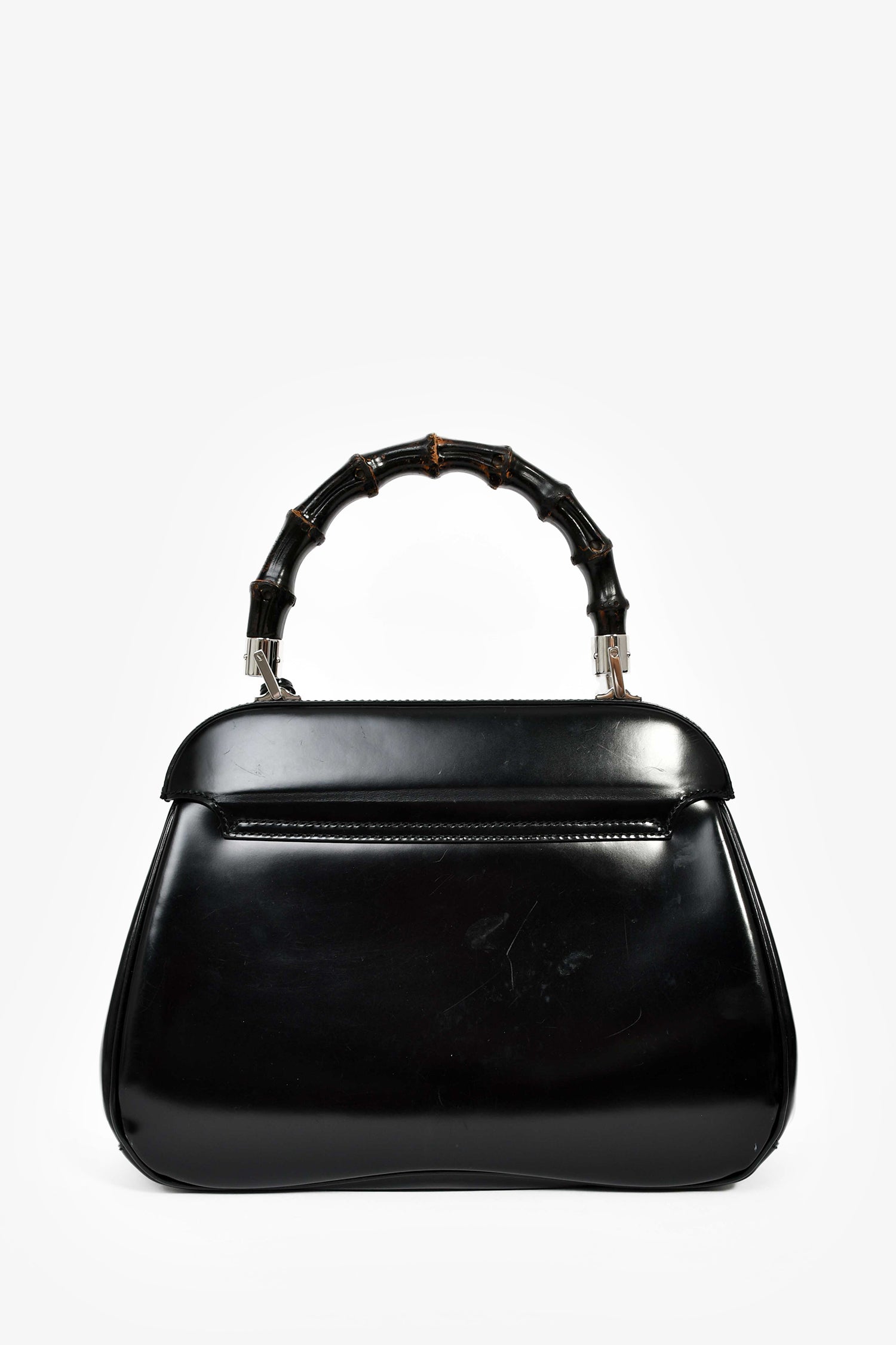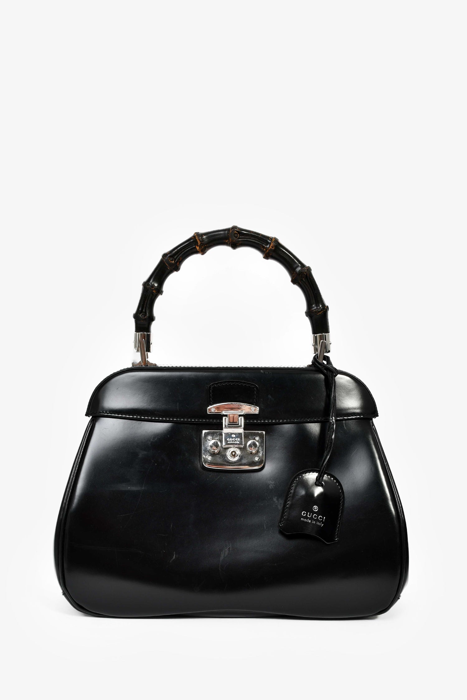 Refresh availabilityGucci Black Leather Bamboo Medium 'Lady Lock' Top Handle Bag. Push-lock closure. Bamboo top handle. Attached clochette. Suede-lined interior with 2 compartments, 1 wall pocket, and 1 zipped pocket. Silver-tone hardware. Tonal stitching.