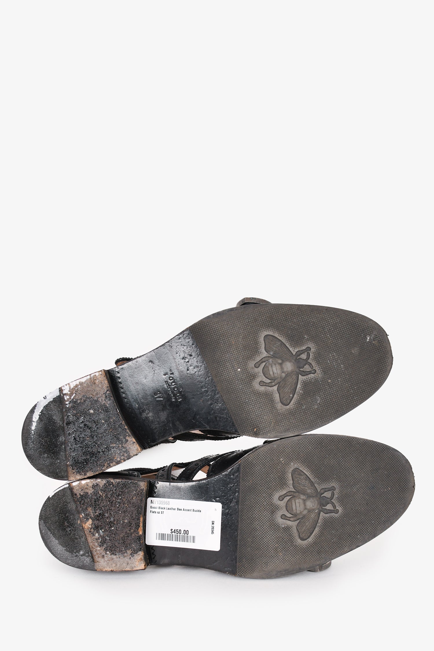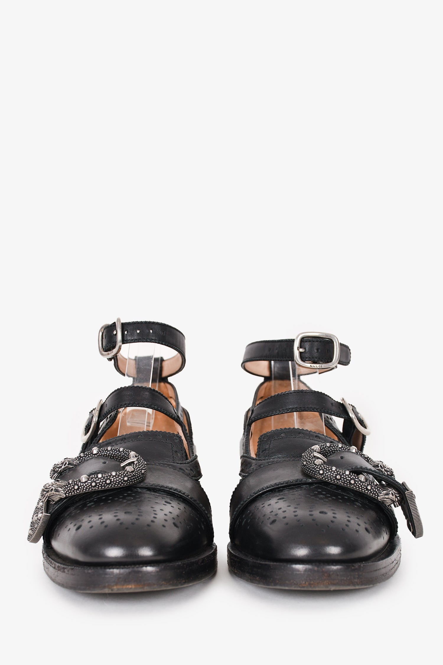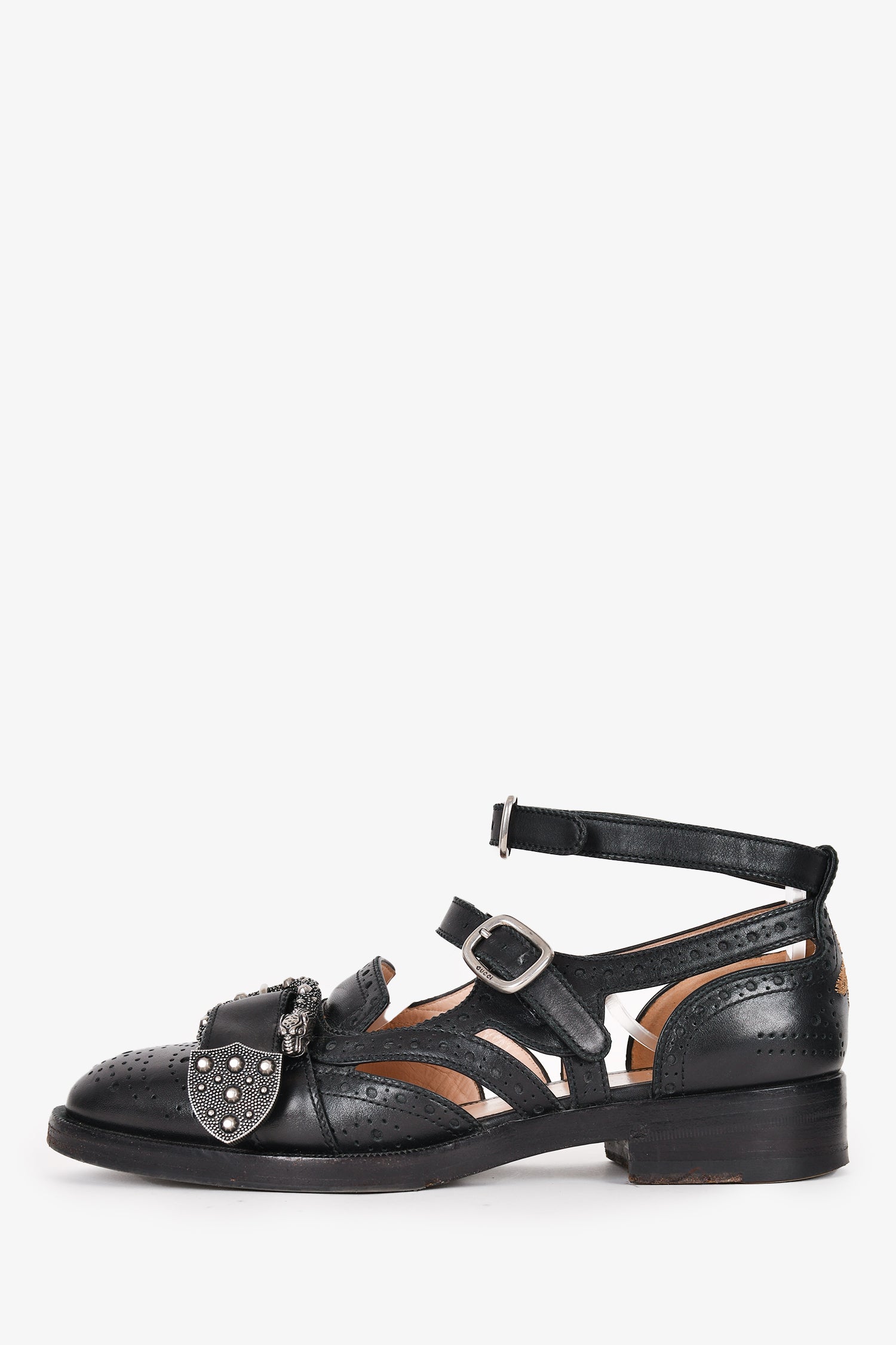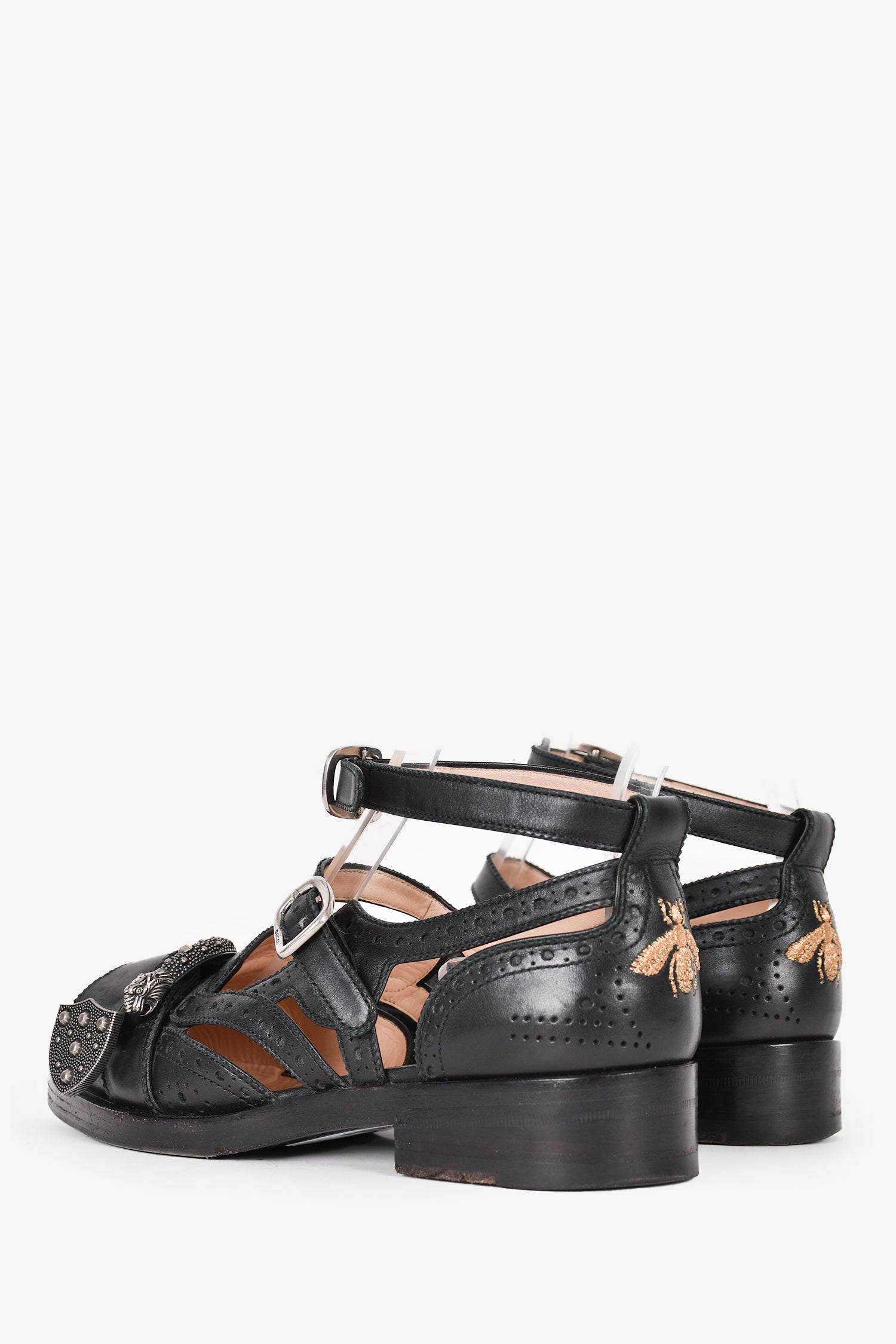Refresh availabilityGucci Black Leather Bee Accent Buckle Flats. Round toe. Strap with buckle closures. Silver-tone hardware. Perforated detailing throughout. Topy soles with Gucci bee motif.