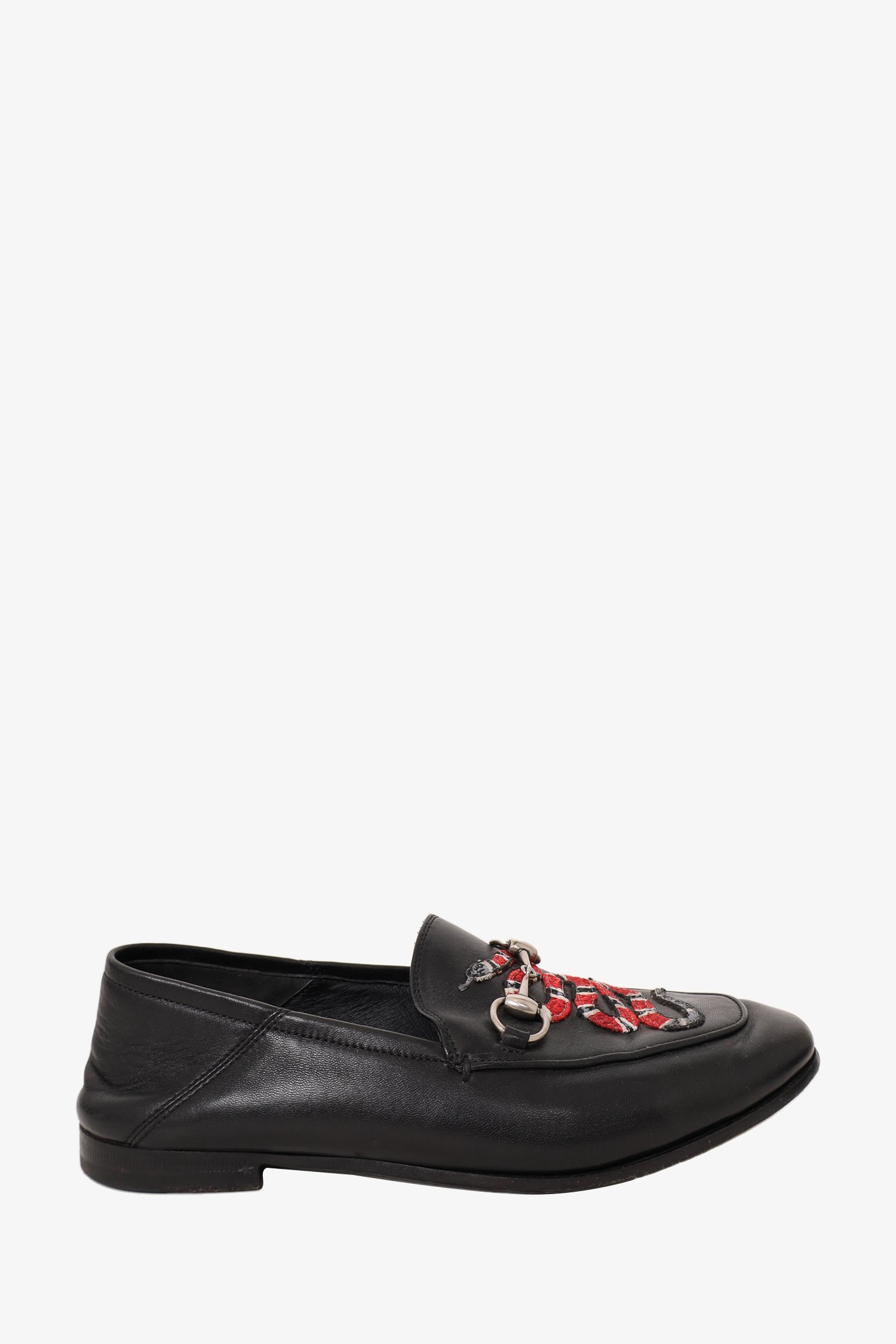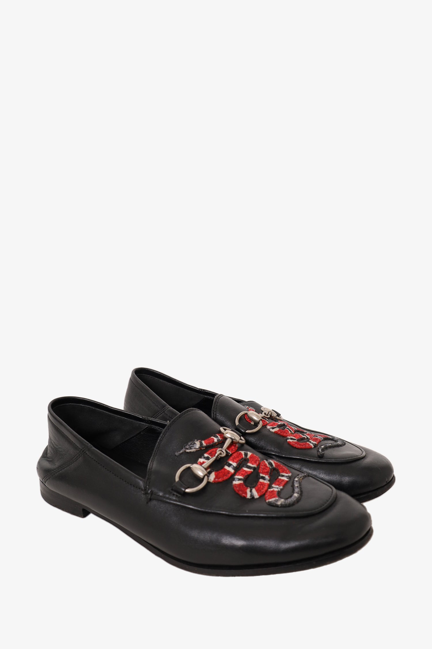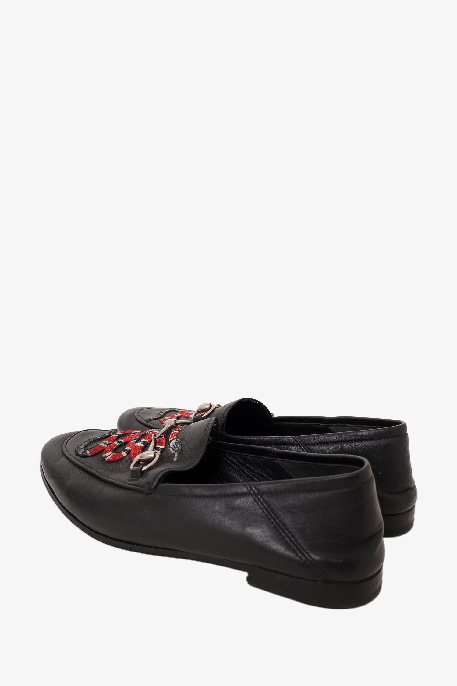 Refresh availabilityGucci Black Leather Brixton Snake Loafers. Slip-on. Silver-toned hardware. Tonal stitching.
