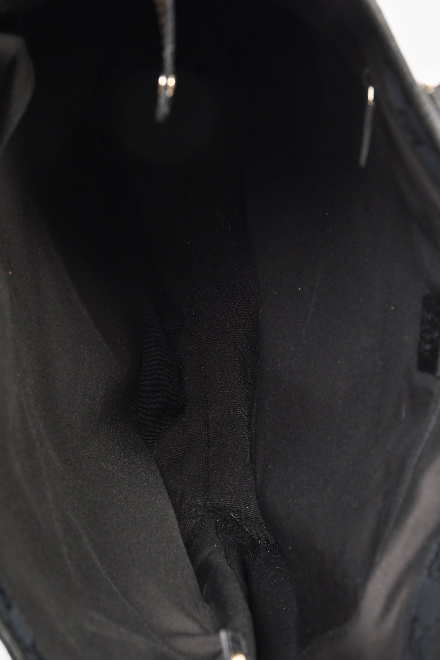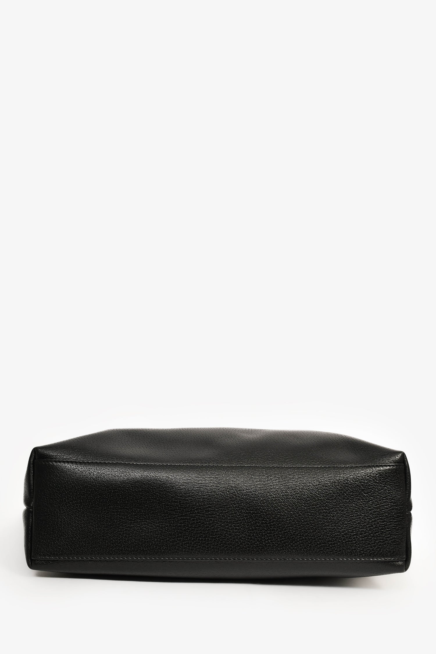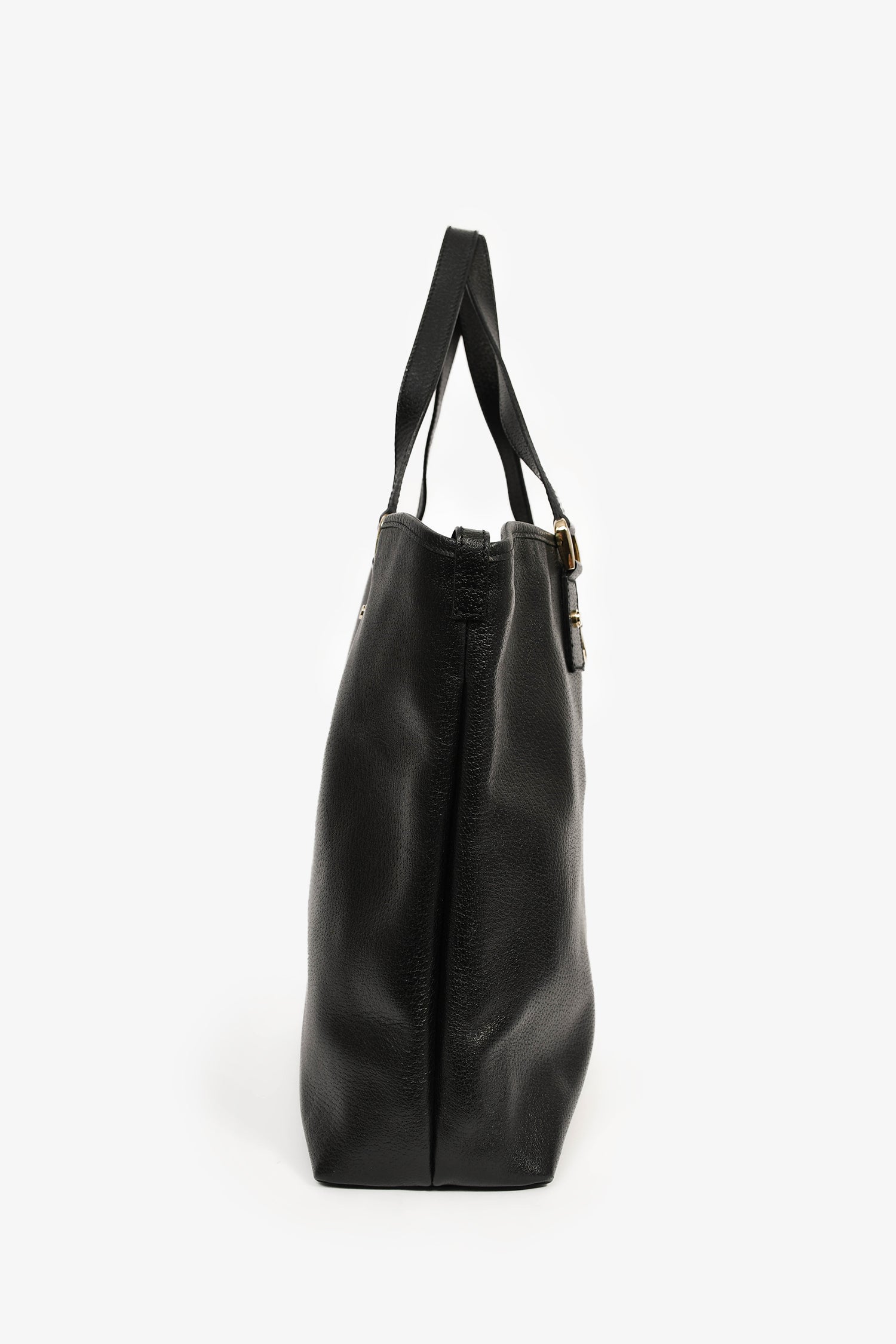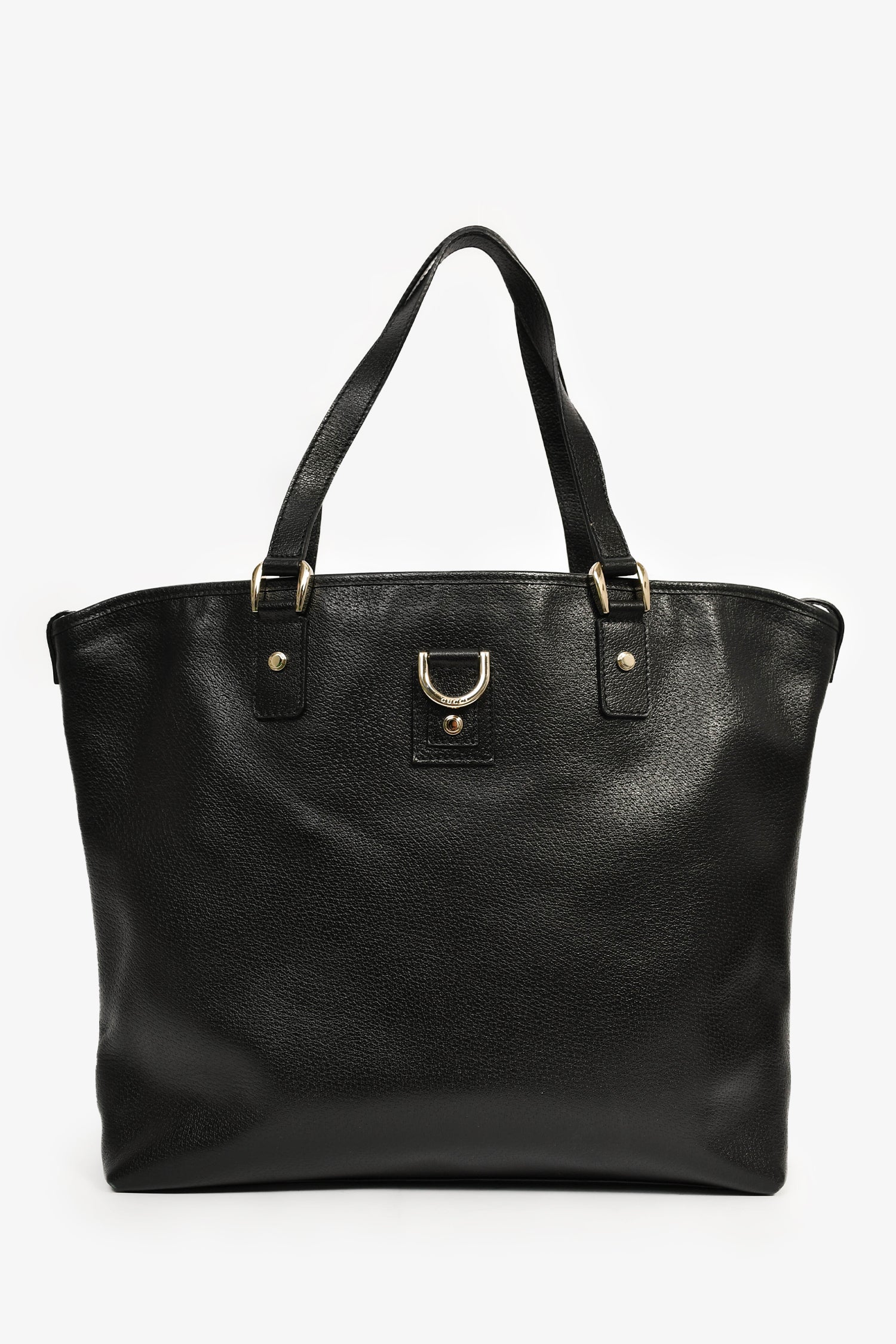 Refresh availabilityGucci Black Leather D Ring Tote Bag. Dual handles. Open top. Two interior wall pockets; one slip and one with zip closure. Gold-tone hardware.