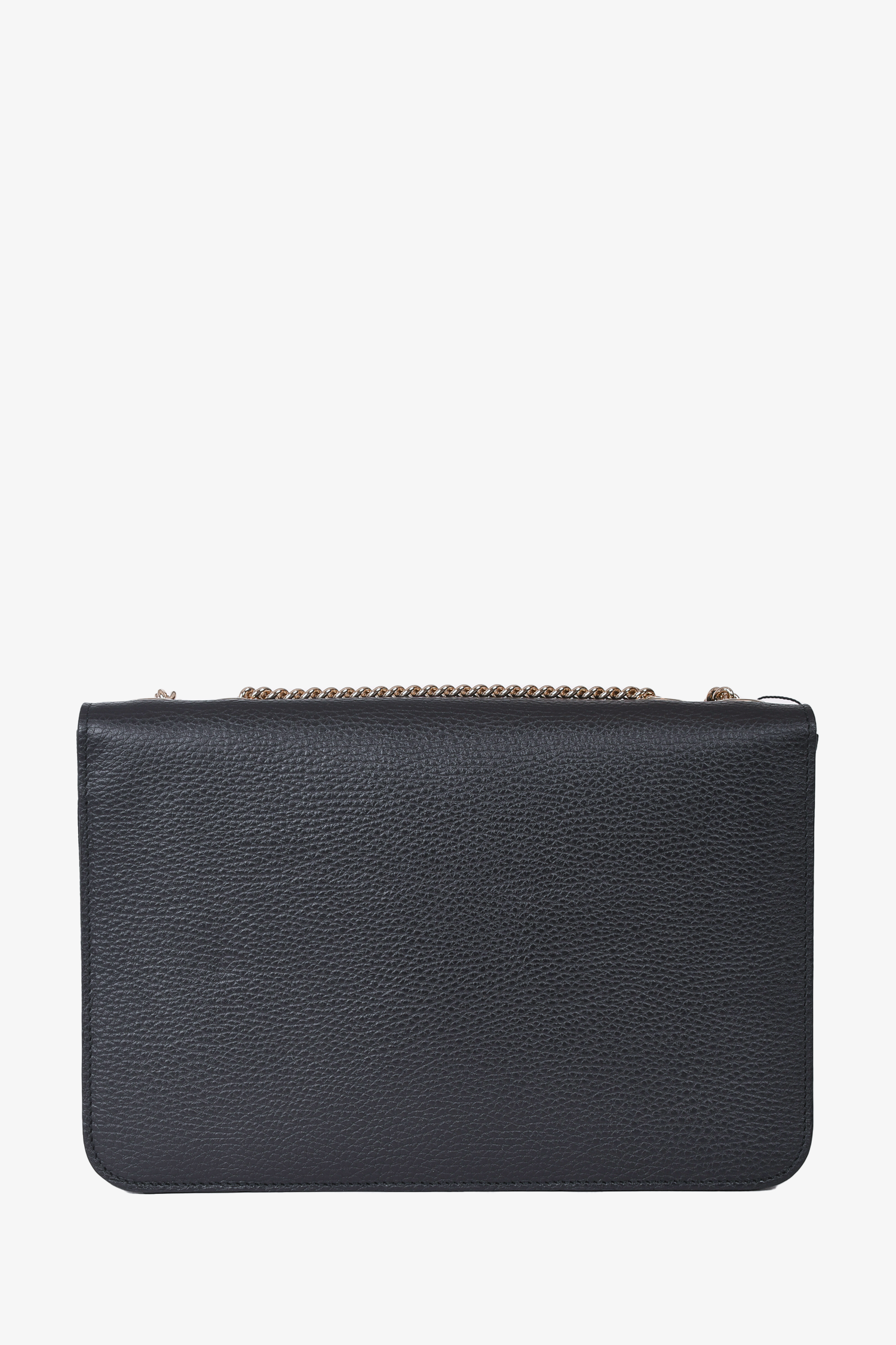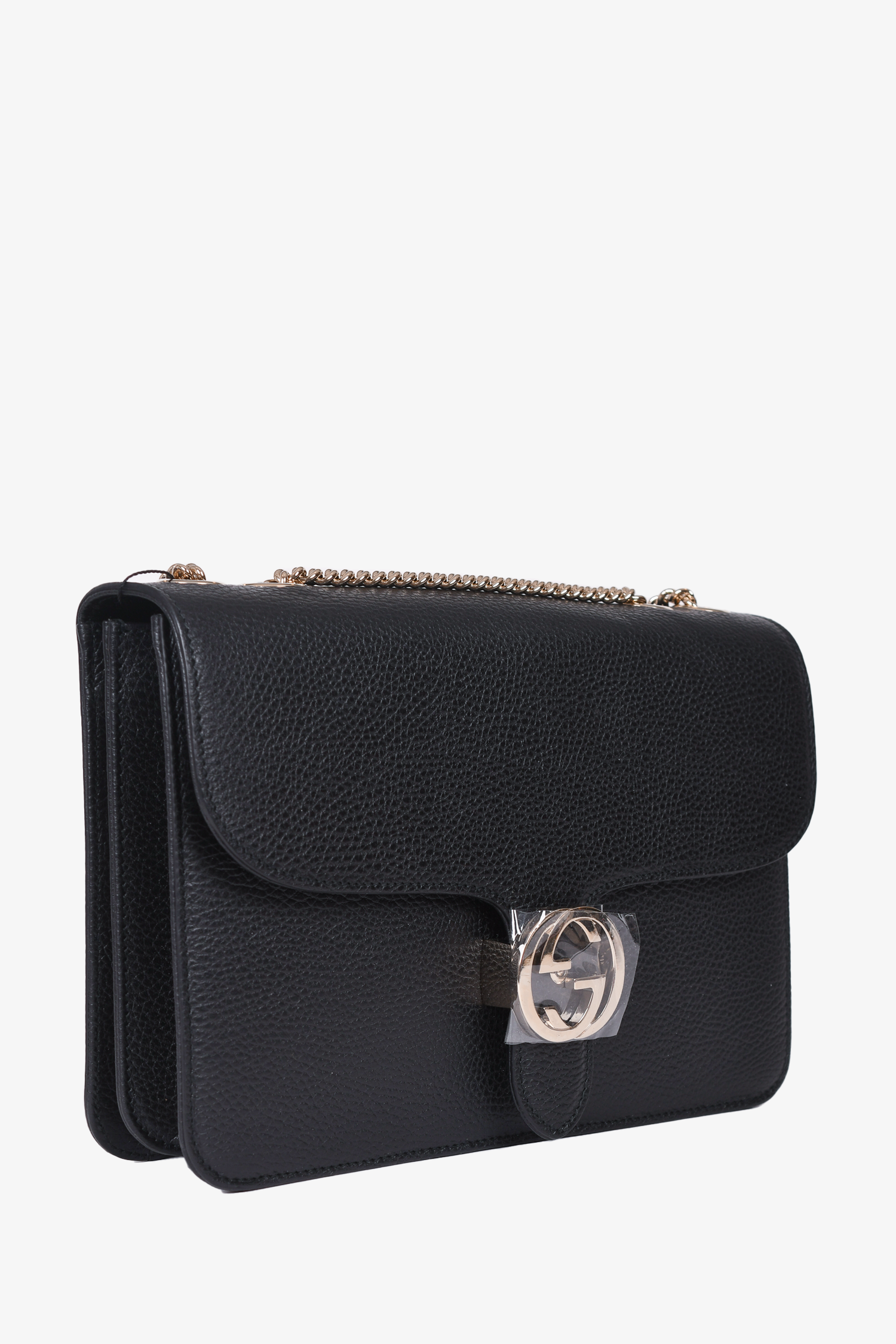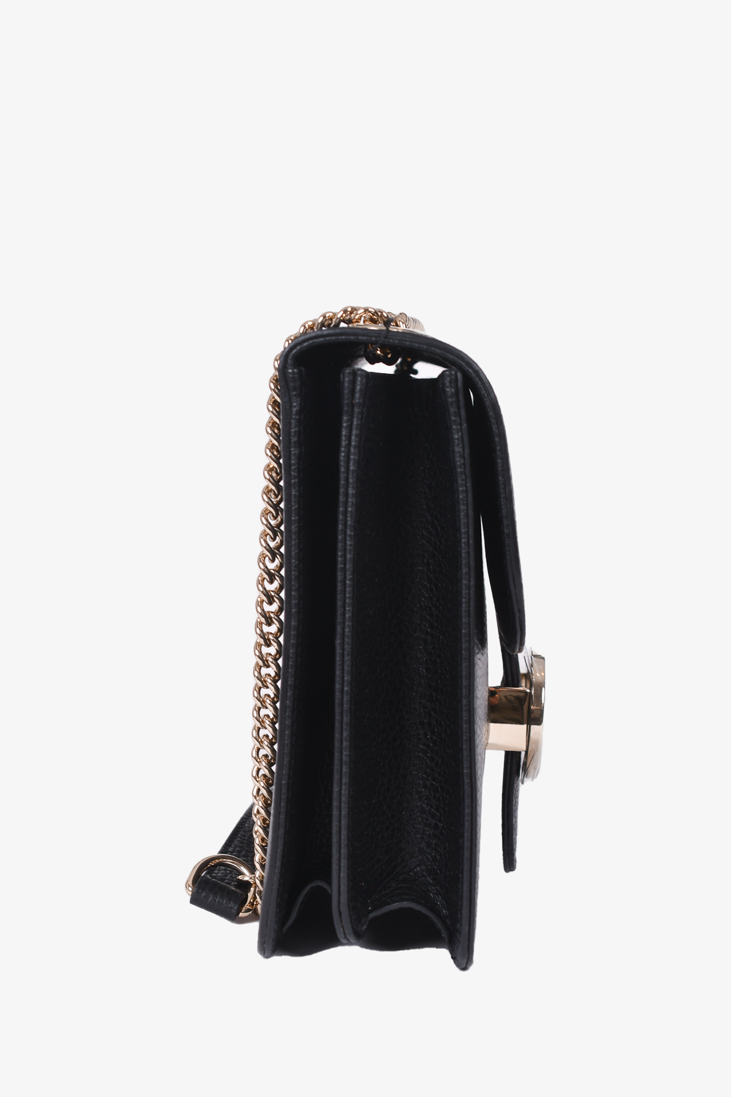Refresh availabilityGucci Black Leather 'Dollar' Crossbody Bag. Front fold-over flap with flip-lock closure. 2 interior compartments; separated by a divider. Single interior wall zip pocket. Slide-around chain strap. Gold-tone hardware. Tonal stitching.
