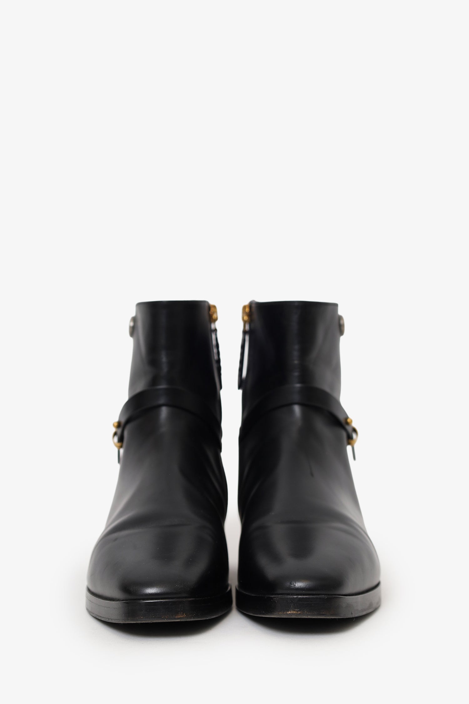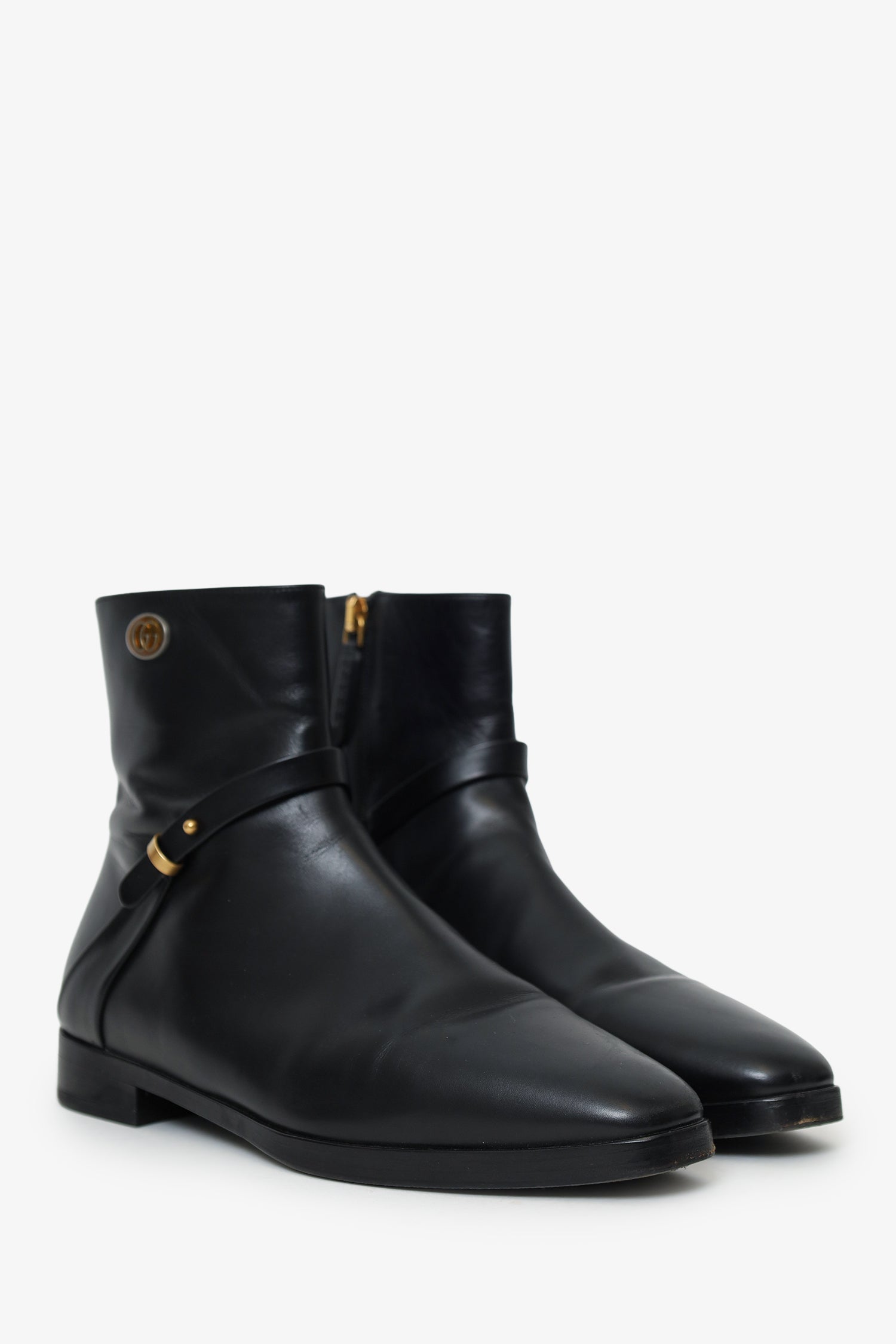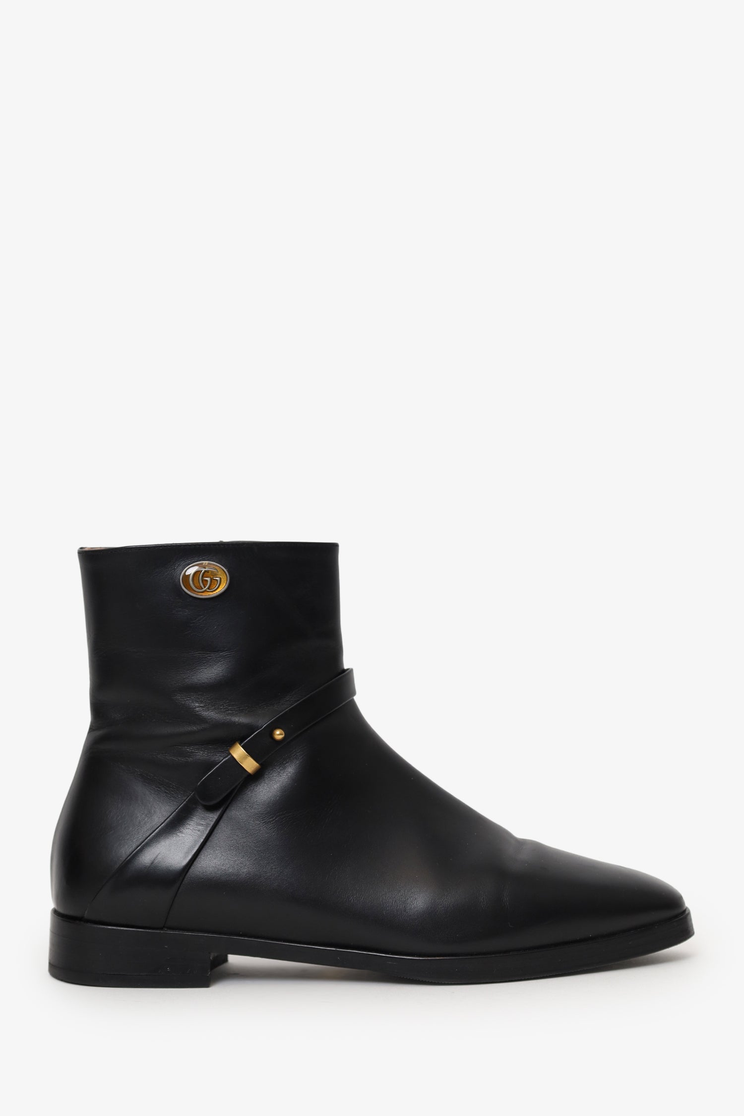 Refresh availabilityGucci Black Leather Double G Boots. Slip-on. Round toe. Inner side zip-up closure. Block heel. Leather-lined interior. Gold-tone hardware. Tonal stitching.