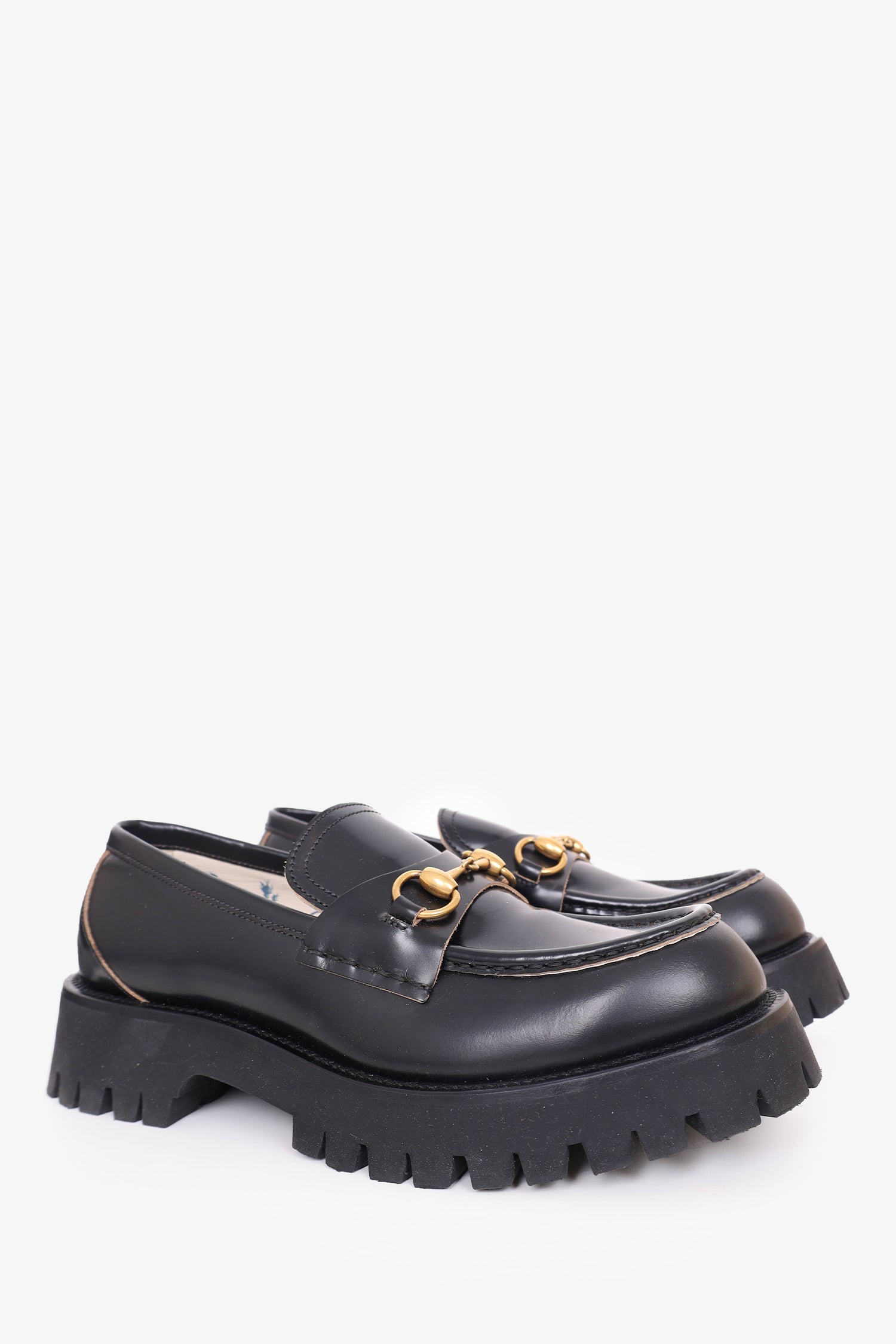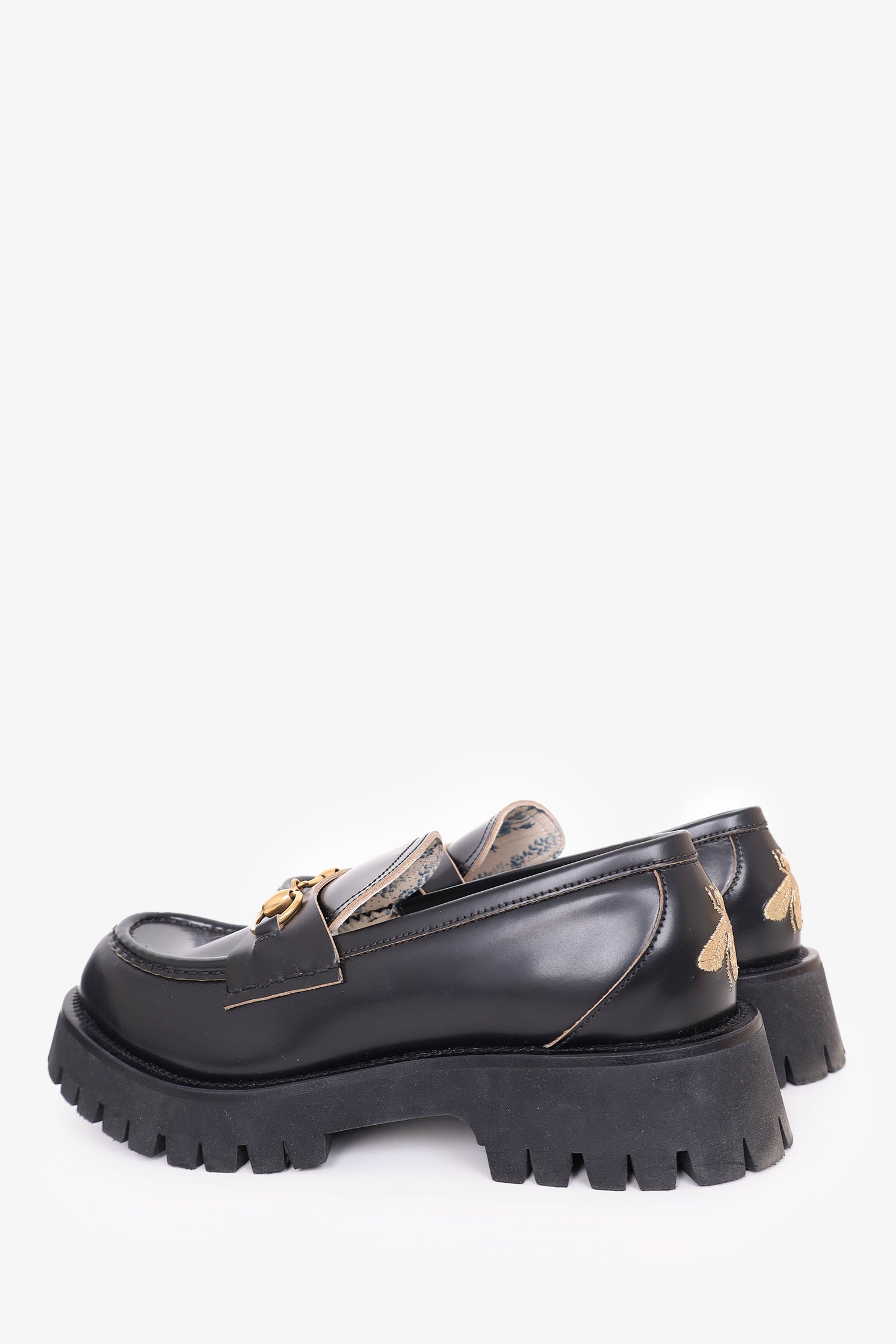 Refresh availabilityGucci Black Leather Embroidered Lug Sole Loafer. Gold-tone hardware. Slip-on. Tonal stitching.