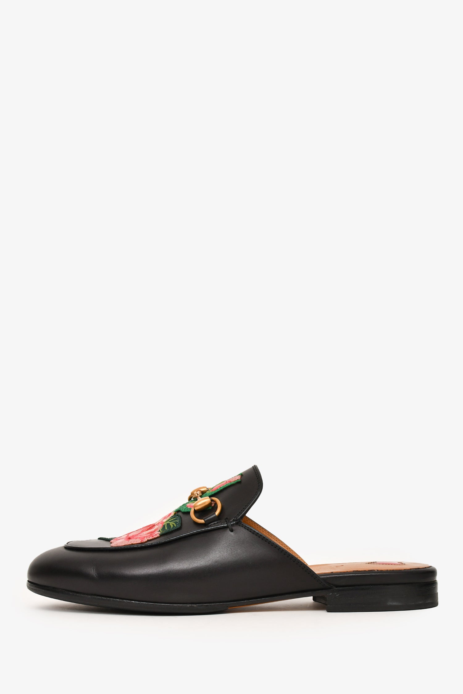 Refresh availabilityGucci Black Leather Floral Embroidered Princeton Mules. Round-toe. Gold-tone hardware. Tonal stitching.