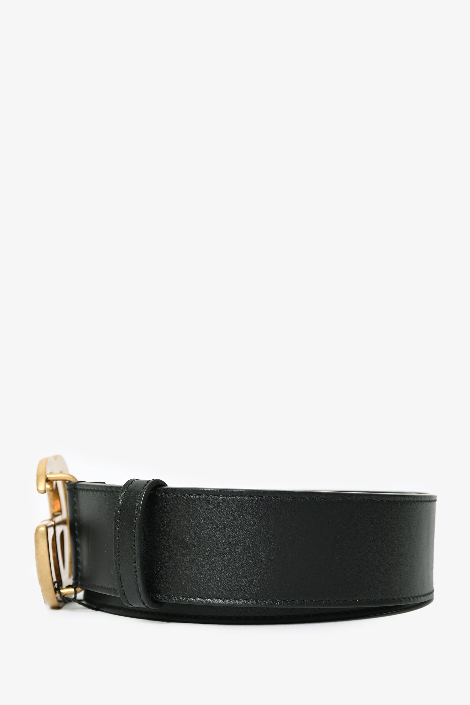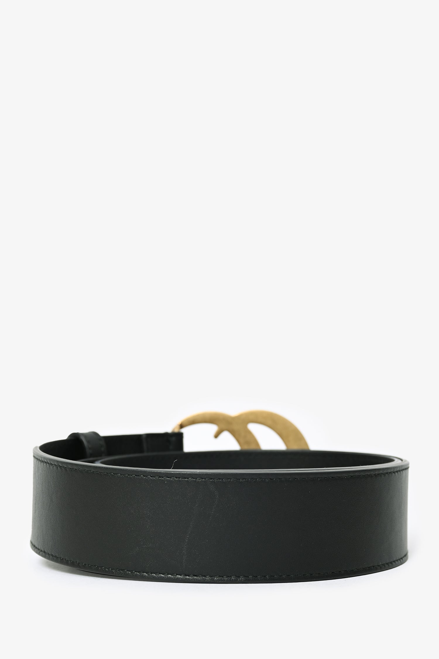 Gucci Black Leather 'GG" Belt. Push tab closure. Gold-toned hardware. Tonal stitching.