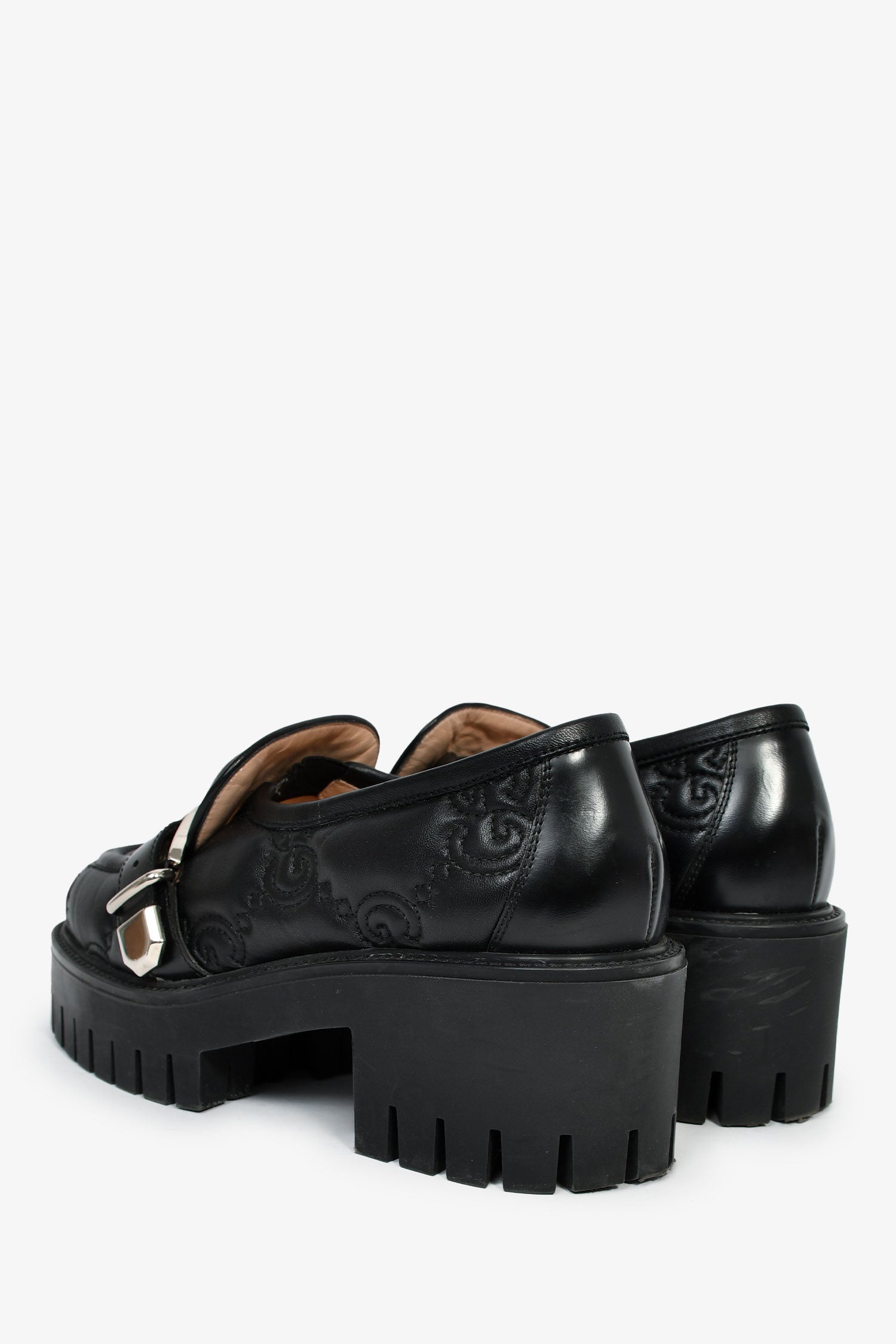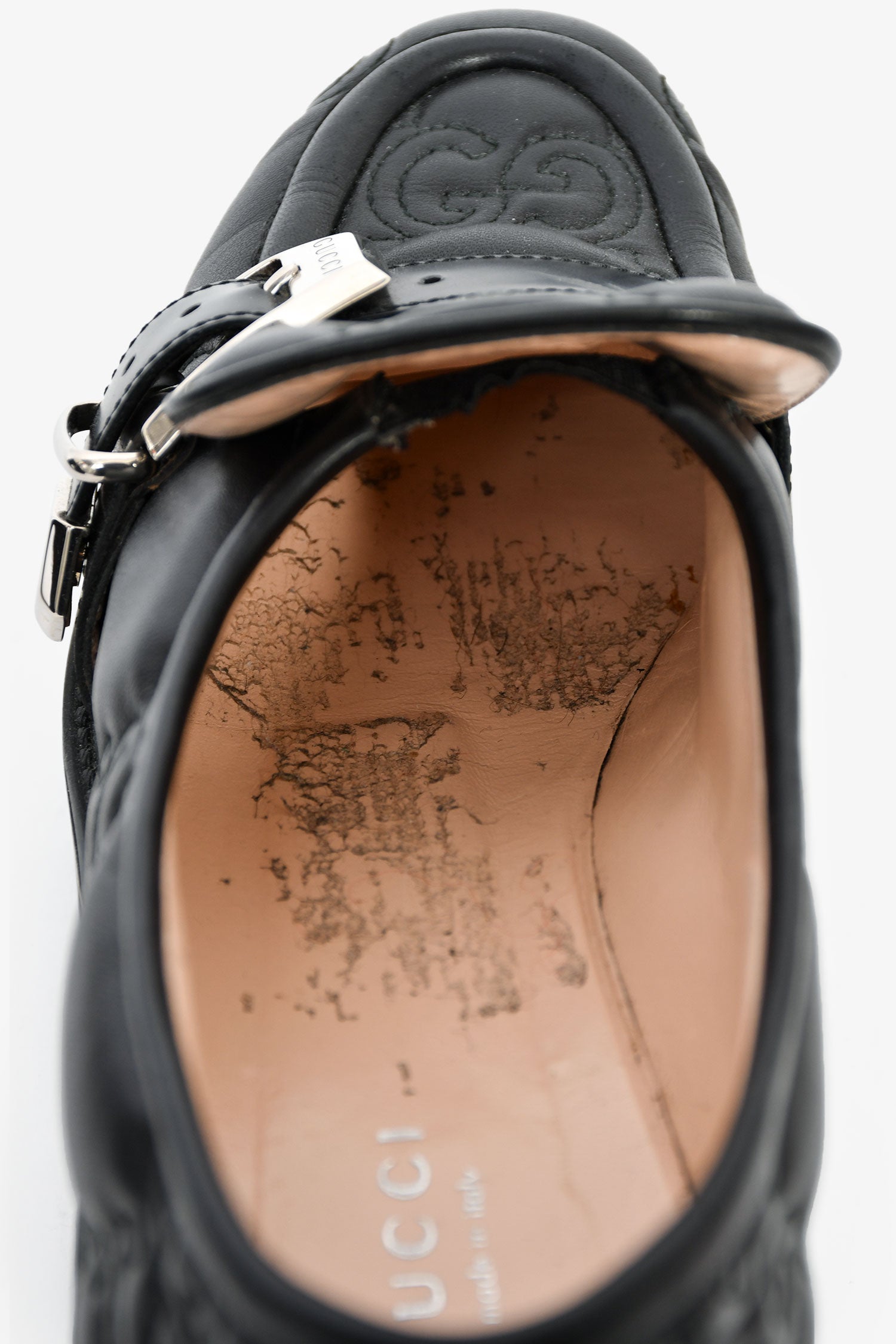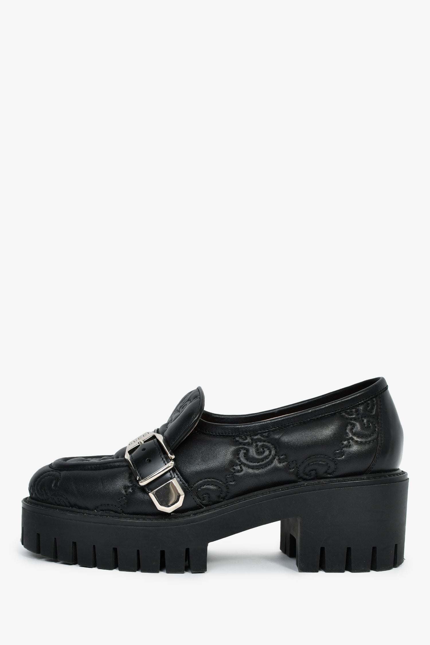 Refresh availabilityGucci Black Leather GG Embossed Buckle Detail Platform Loafers. Slip-on. Round-toe. Silver-tone hardware. Leather-lined interior. Rubber soles. Silver-tone hardware. Tonal stitching.