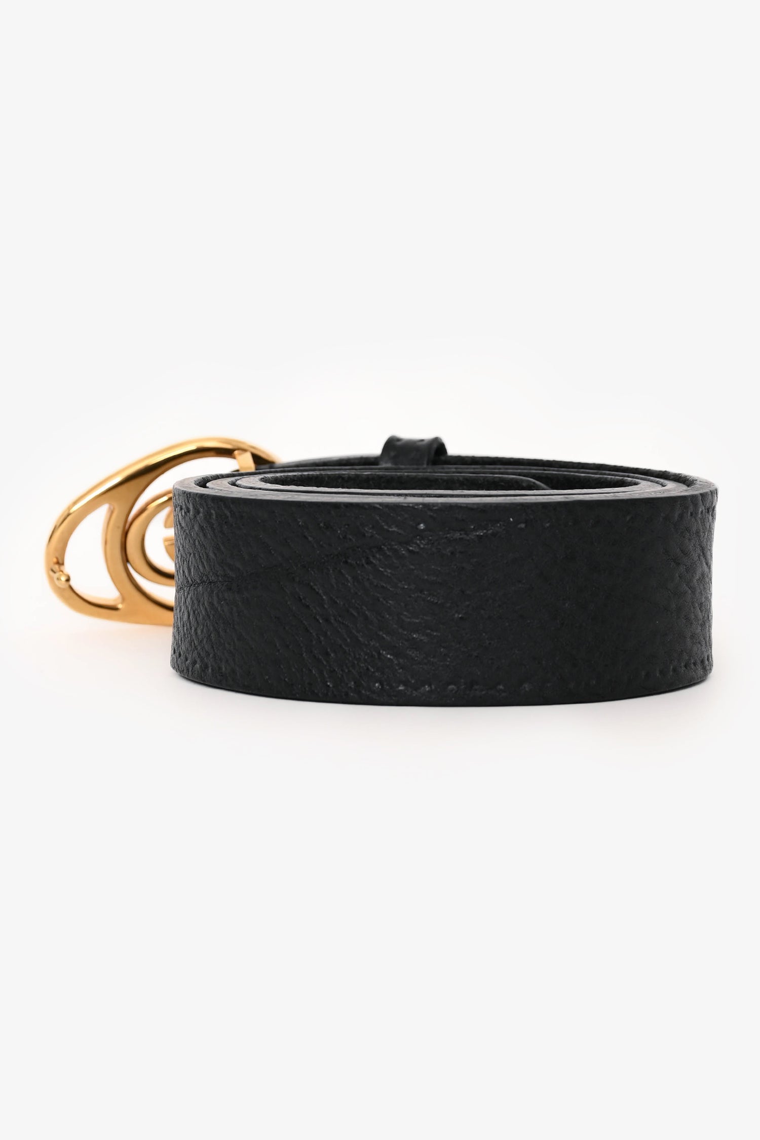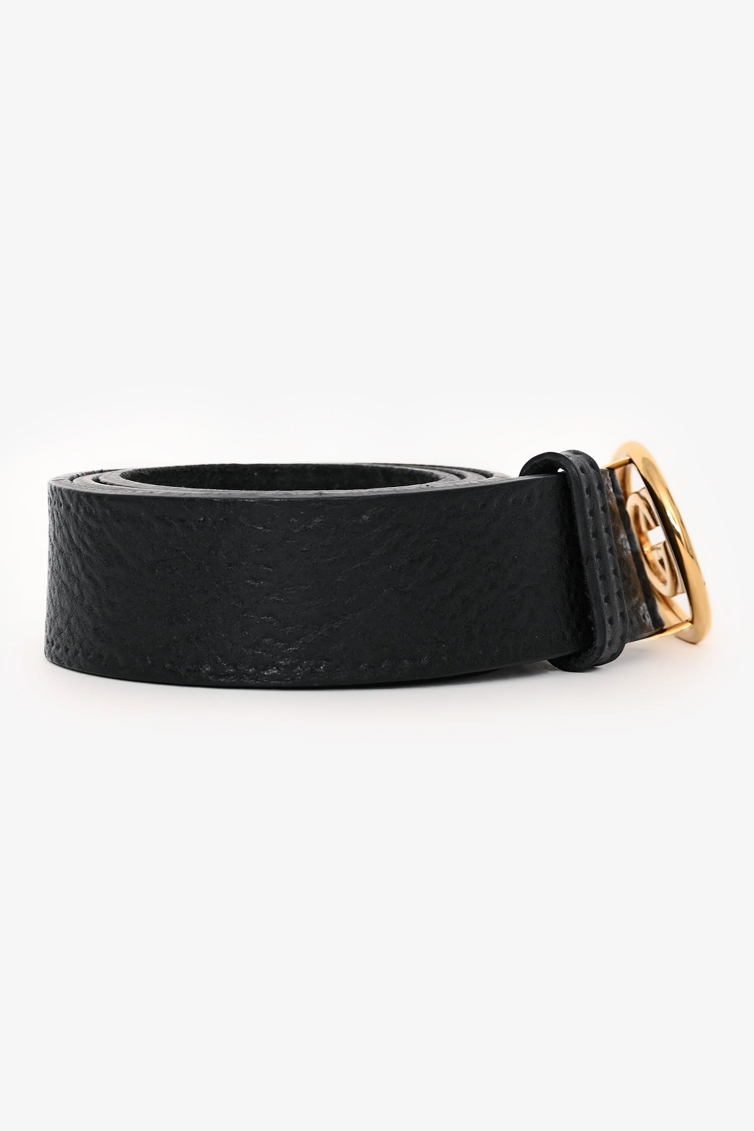 Refresh availabilityGucci Black Leather GG Logo Belt. Interlocking GG buckle. Gold-tone hardware. Tonal stitching.
