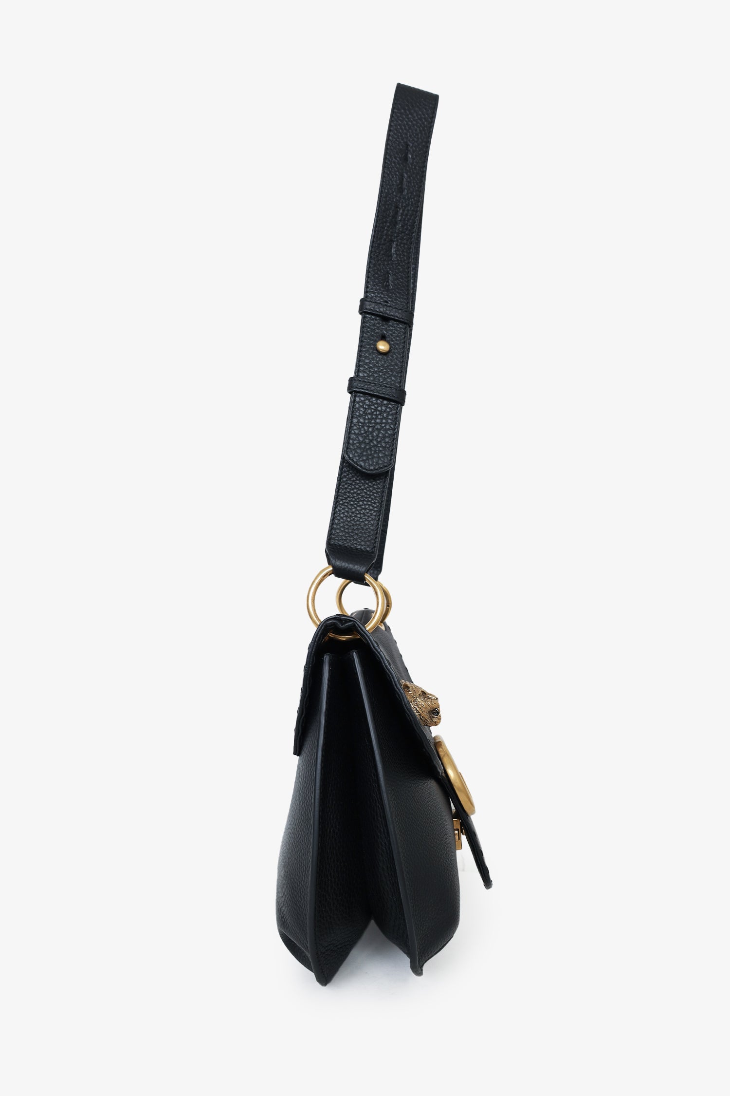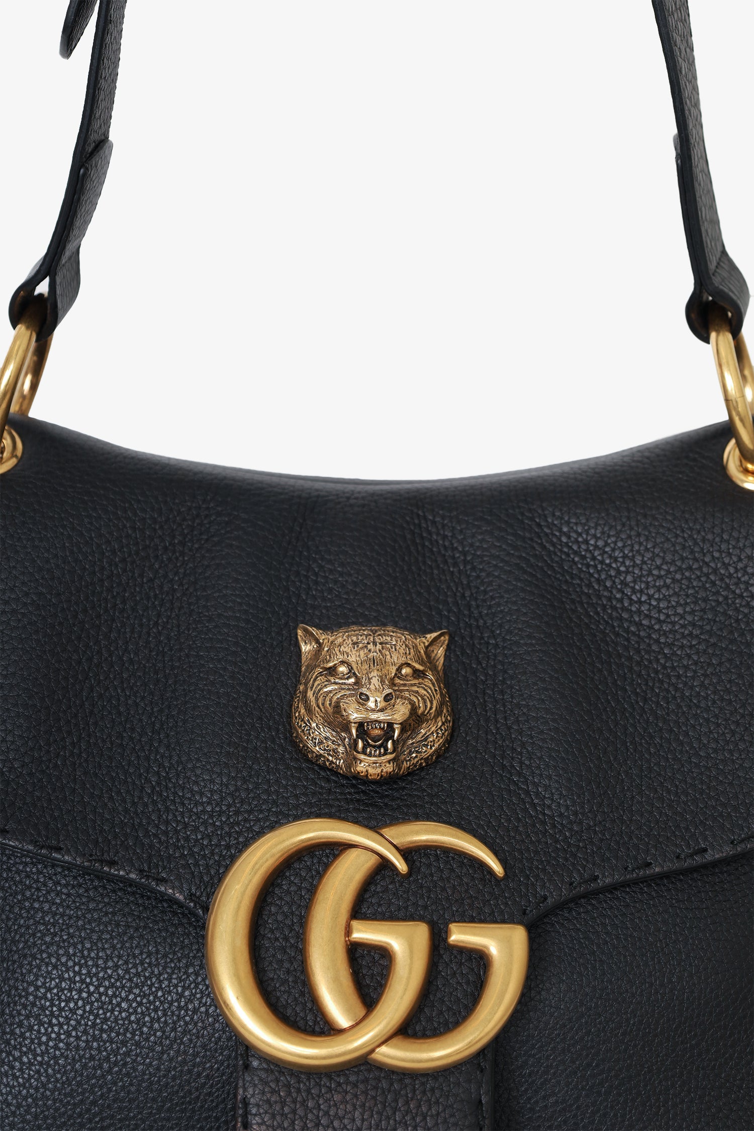 Refresh availabilityGucci Black Leather GG Marmont Animalier Shoulder Bag. Fold-over flap with push closure. Accordion interior with canvas lining. 1 interior zip pocket. 2 interior slip pockets. Adjustable strap. Gold-tone hardware. Tonal stitching.