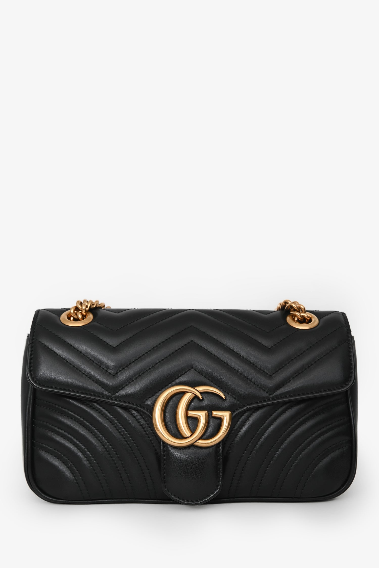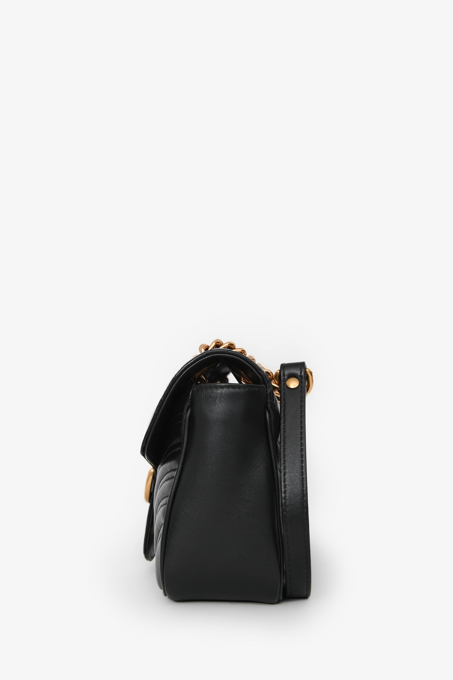 Refresh availabilityGucci Black Leather GG Marmont Small Crossbody Bag. Front fold-over flap with push-lock closure. Slide-around chain. Suede-lined interior. Single interior wall zip pocket. Gold-tone hardware. Tonal stitching.