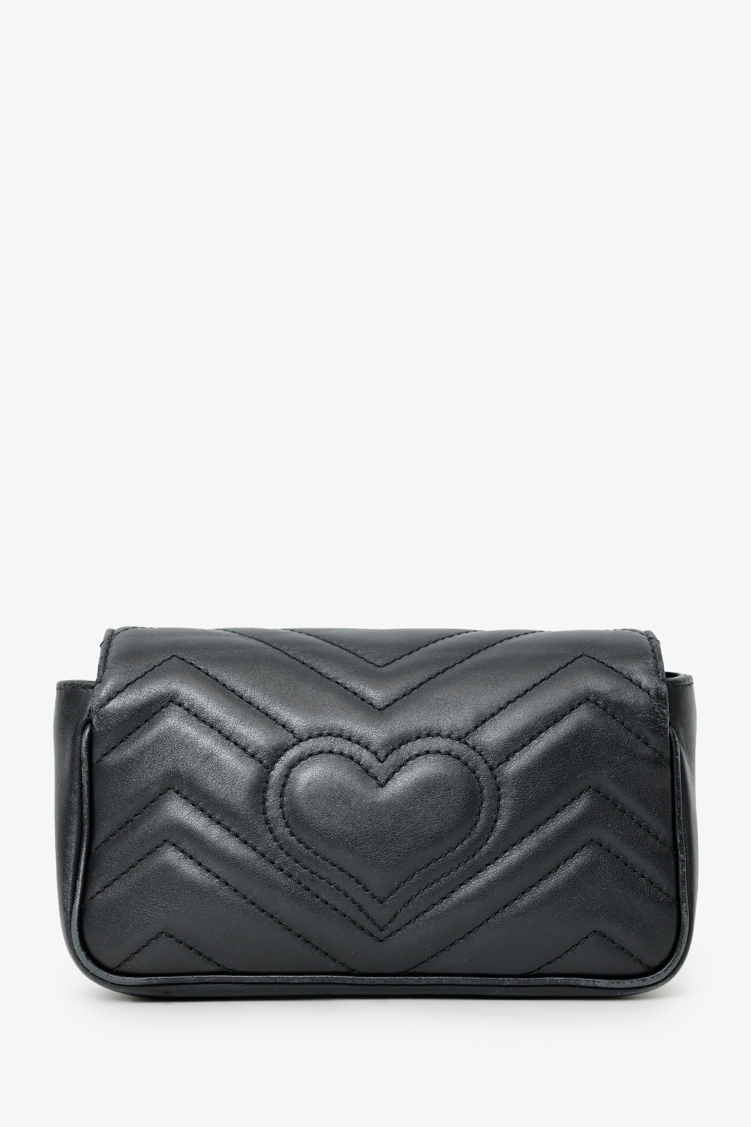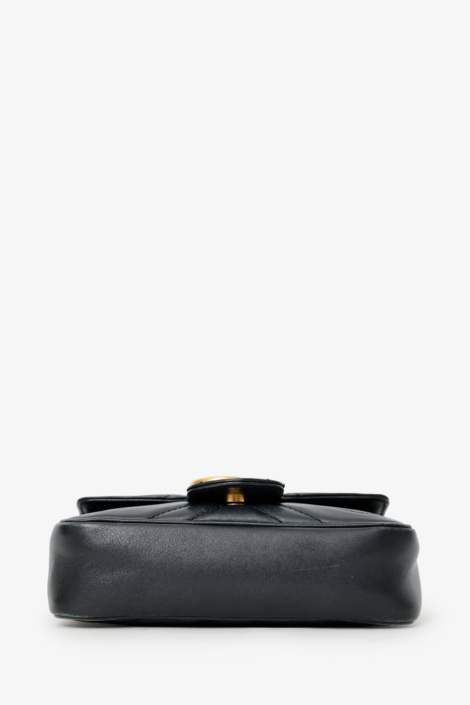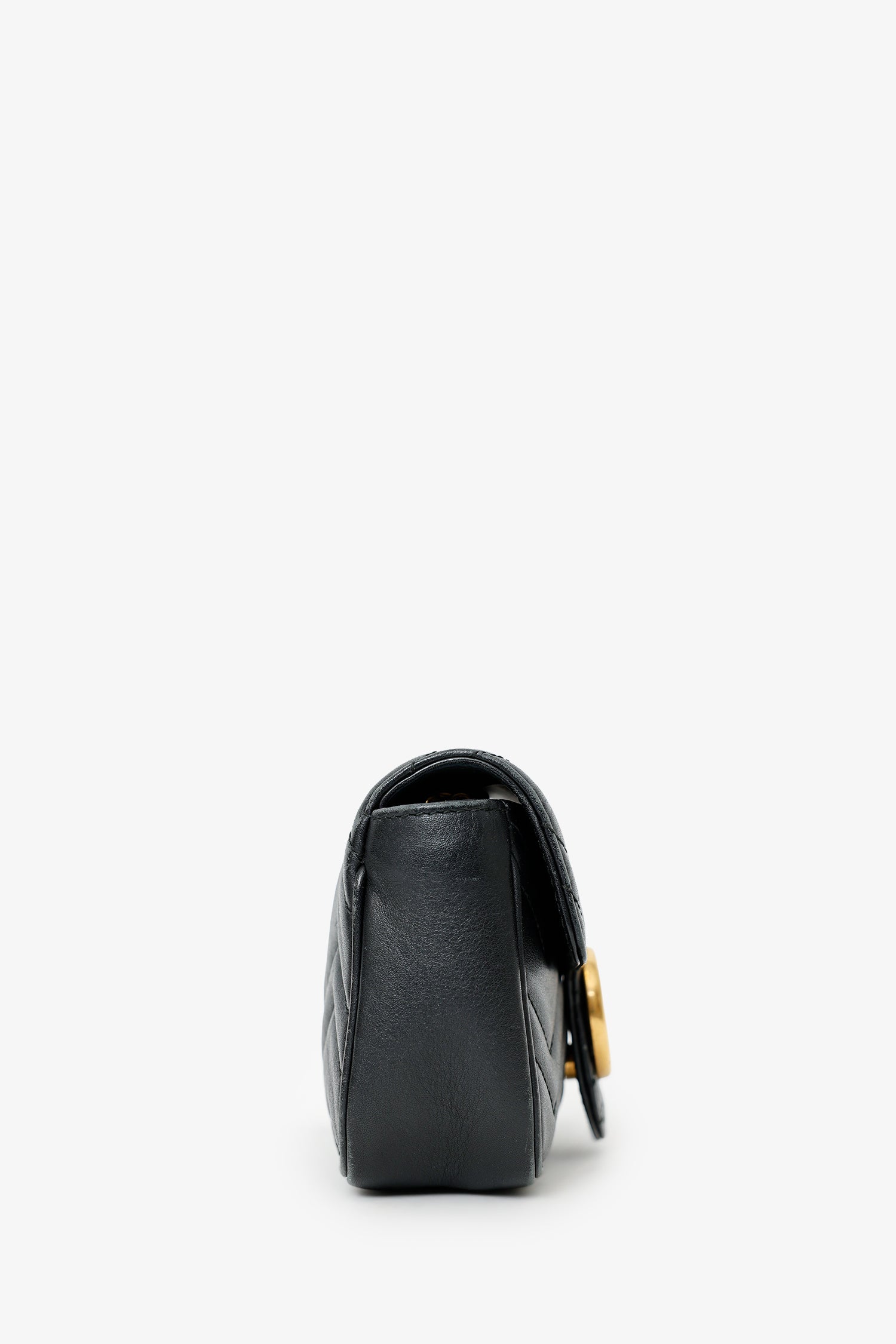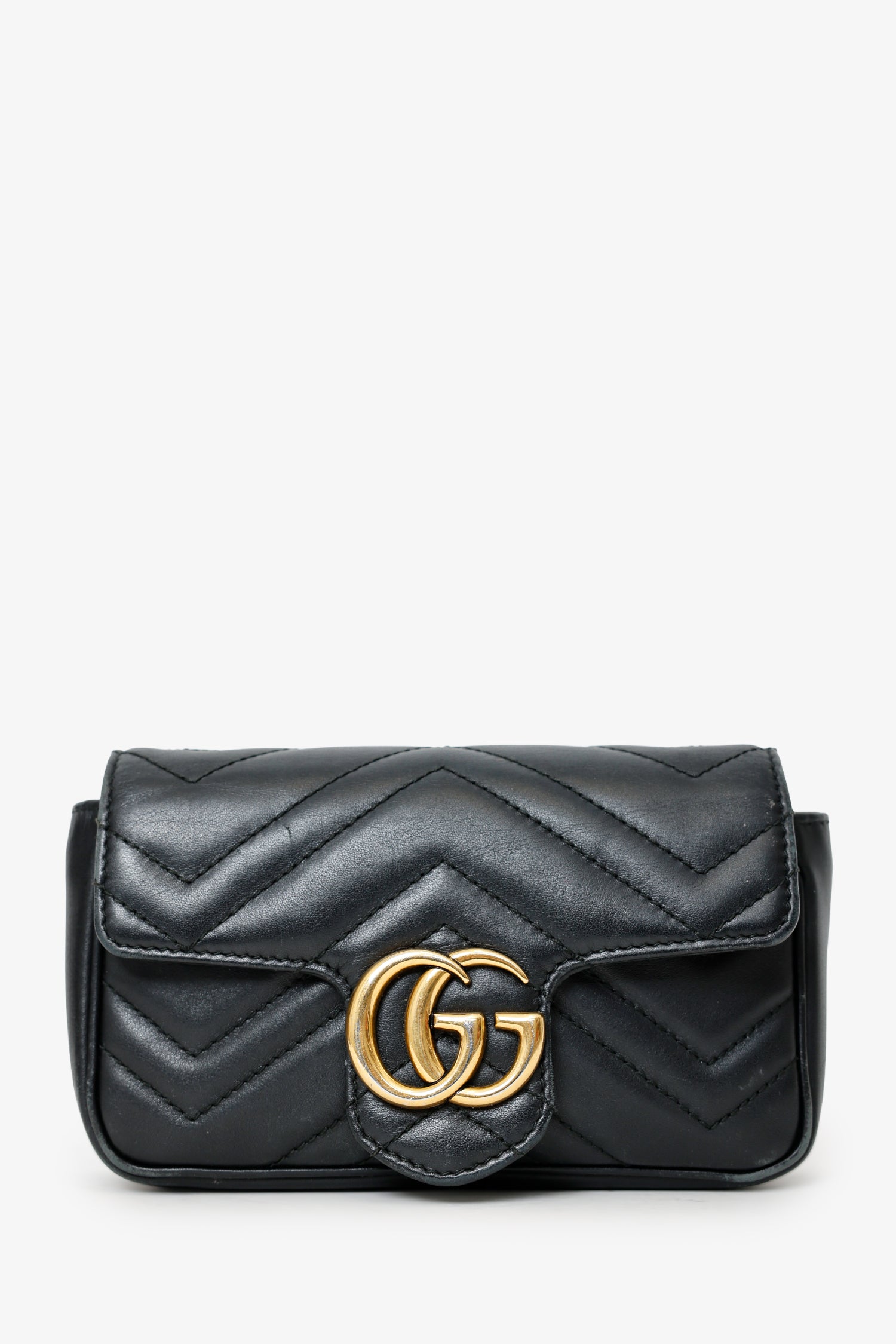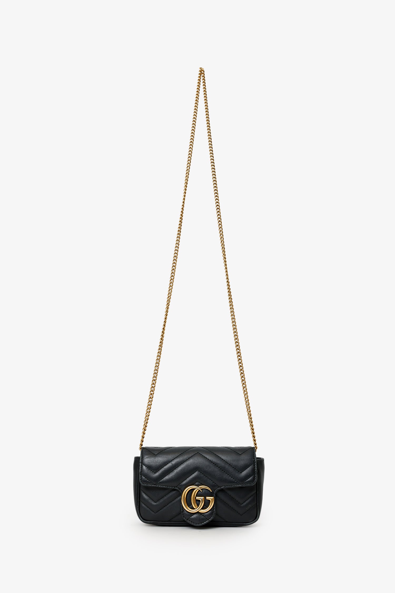 Refresh availabilityGucci Black Leather GG Marmont Super Mini Crossbody Bag. Front fold-over flap with button-up closure. Single chainlink crossbody strap. Lined open interior. Interior keychain with clasp closure. Gold-tone hardware. Tonal stitching.