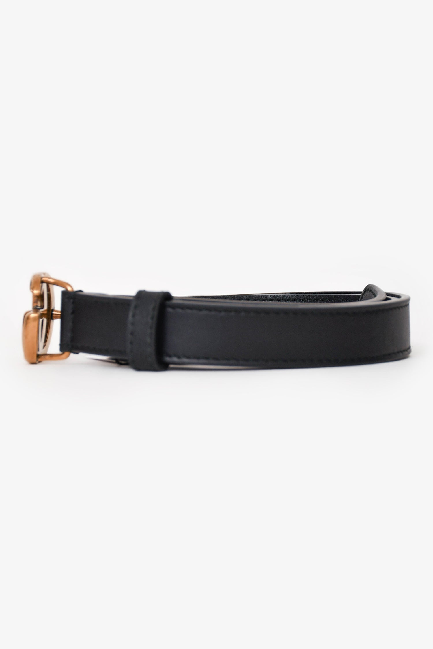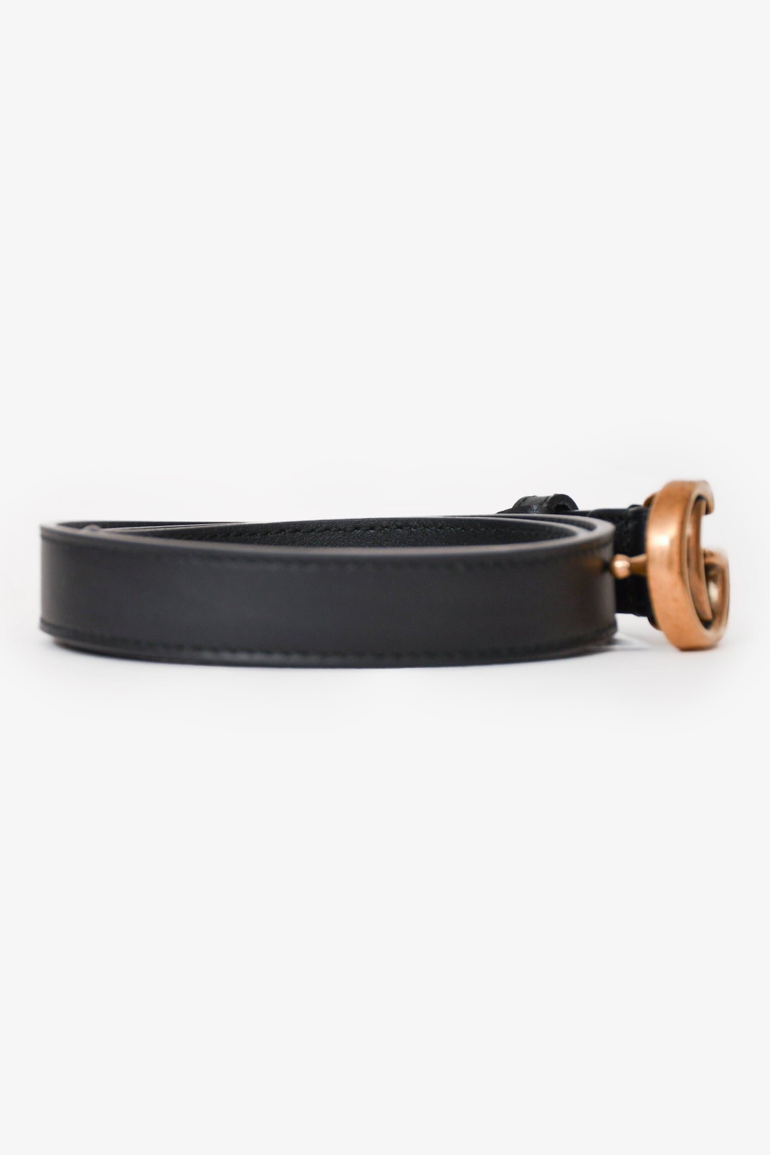Refresh availabilityGucci Black Leather GG Marmont Thin Belt. Gold-tone hardware. Anchor snap-on button. Tonal stitching.