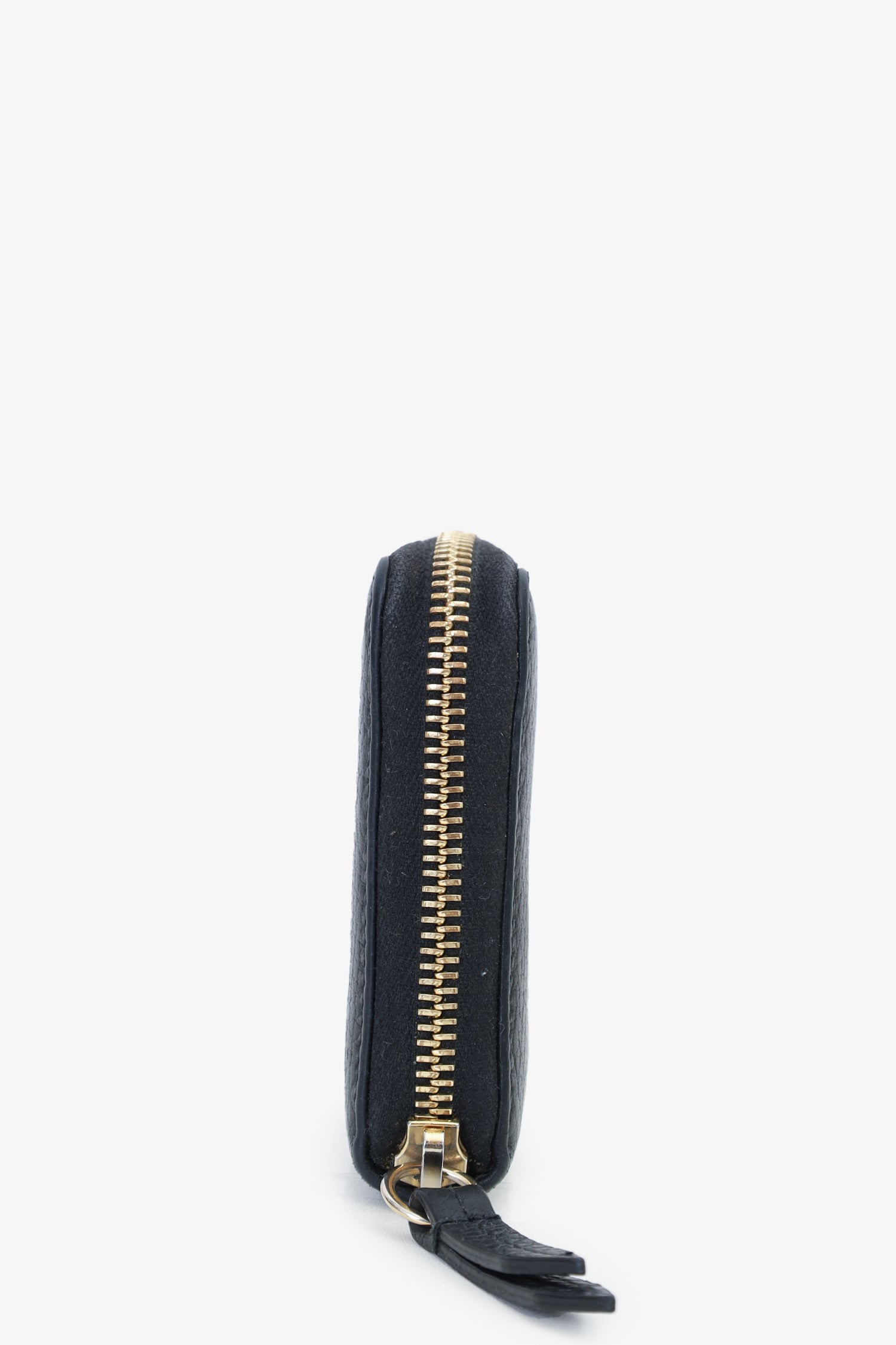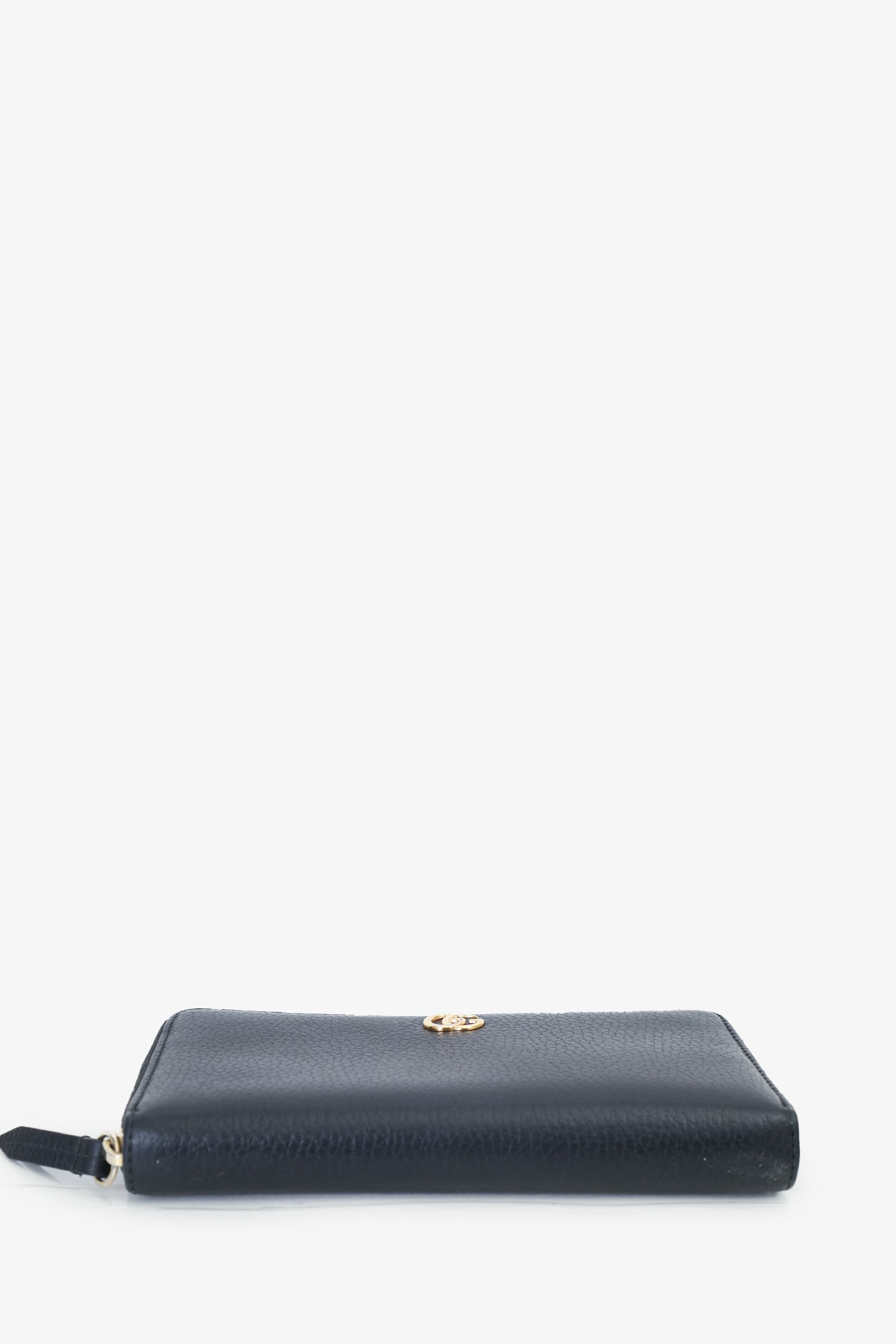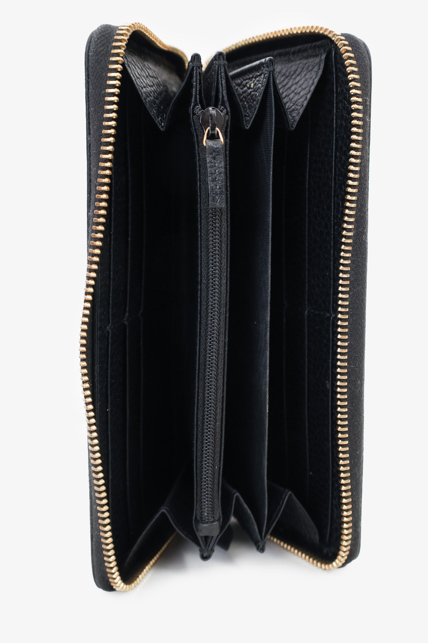 Gucci Black Leather GG Marmont Zip Wallet. Top zip closure. 12 card slots. 1 interior coin compartment. Gold-toned hardware. Tonal stitching.