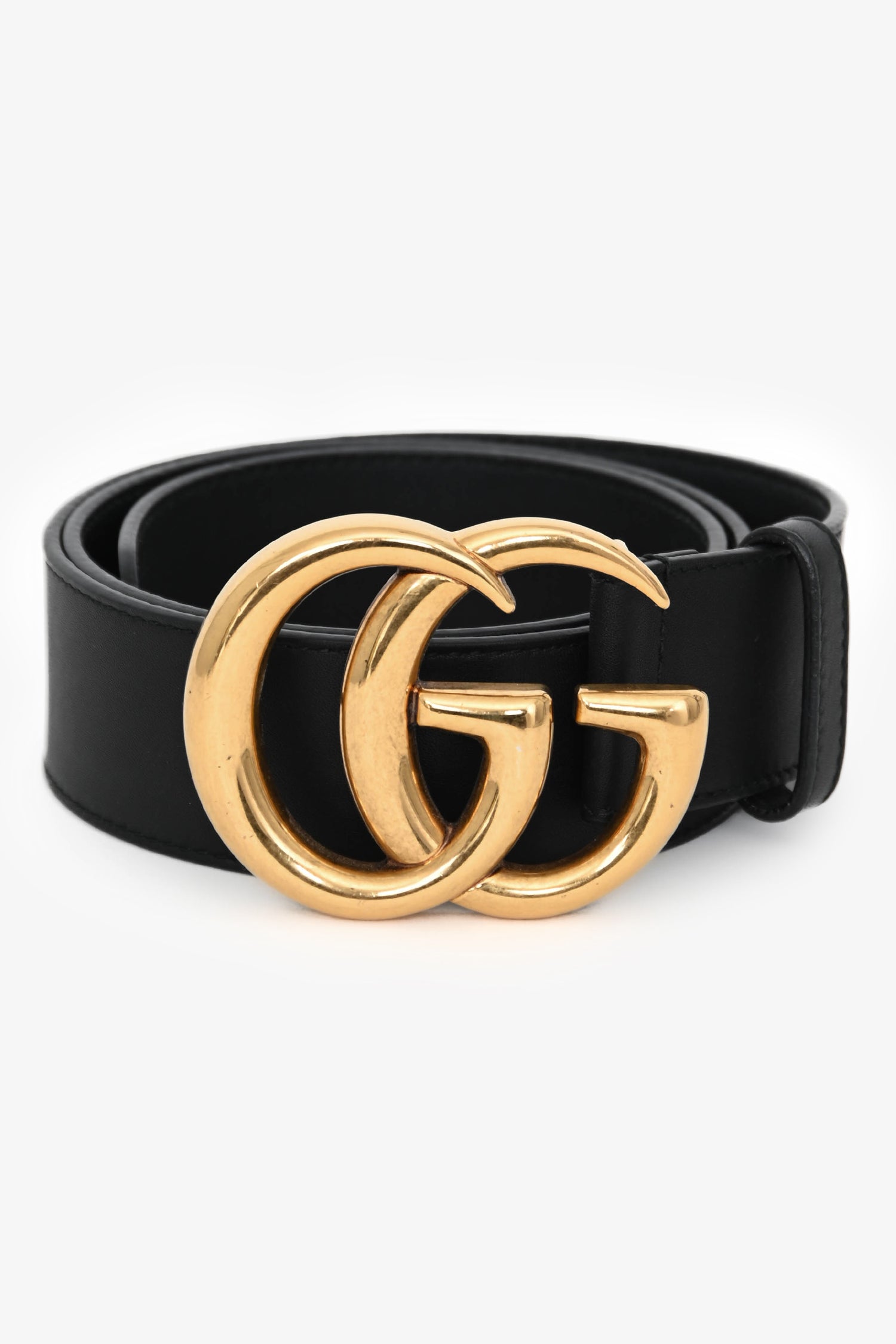 Refresh availabilityGucci Black Leather Gold GG Belt. Adjustable pull-through closure. Gold-tone hardware. Tonal stitching.