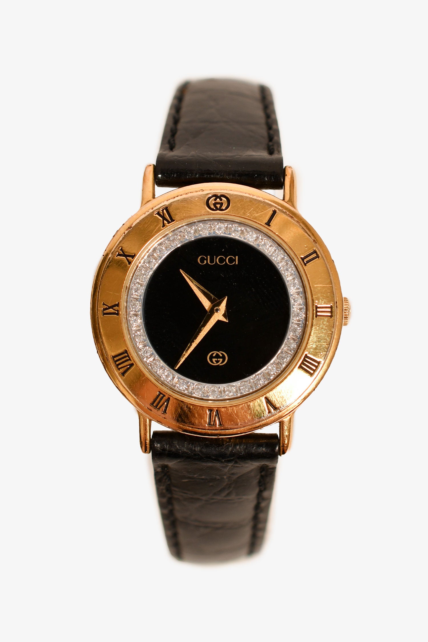 Refresh availabilityGucci Black Leather Gold Toned 3000 L Crystal Watch. Gold-tone bezel and crown. Leather wrist band. Crystal band. Pin-buckle. Tonal stitching.