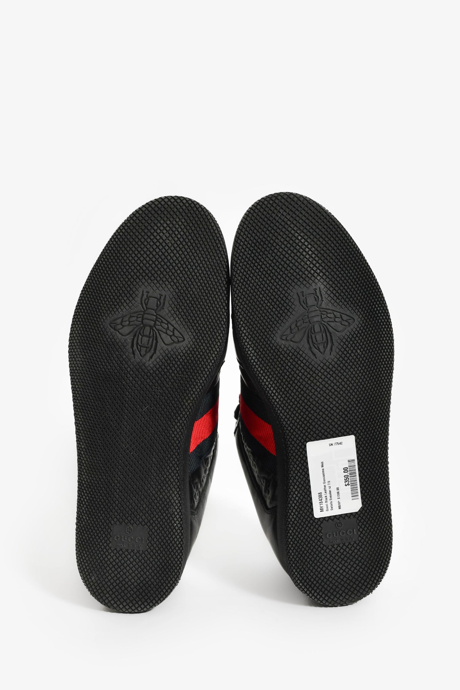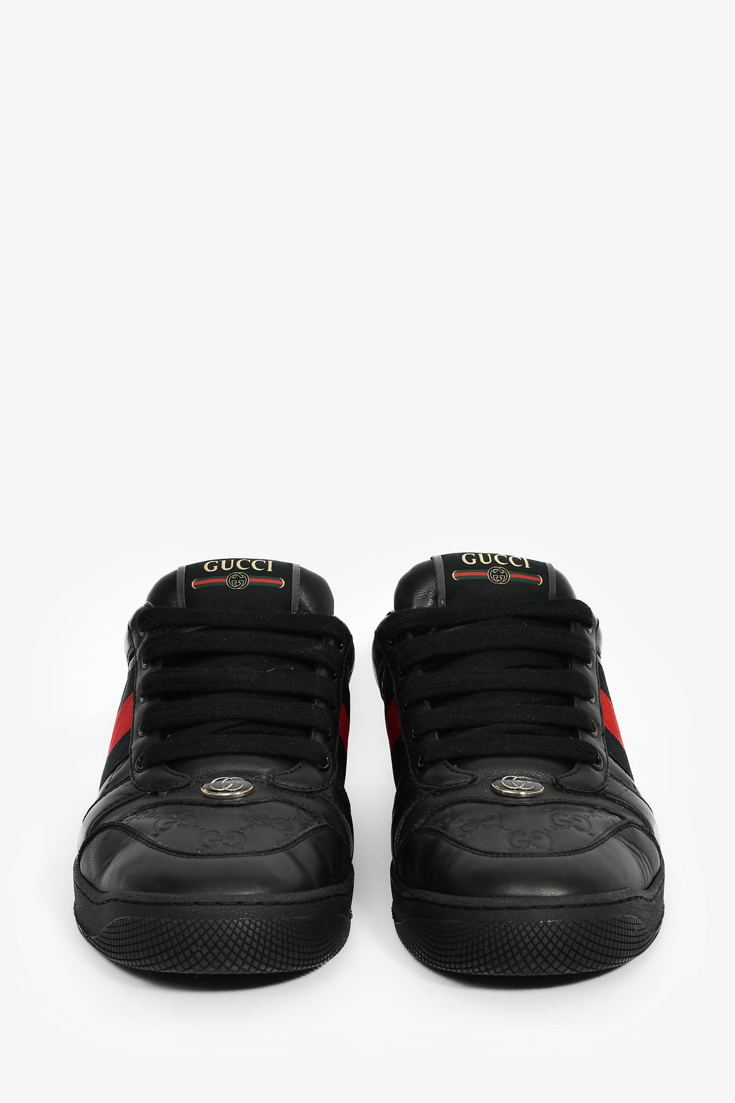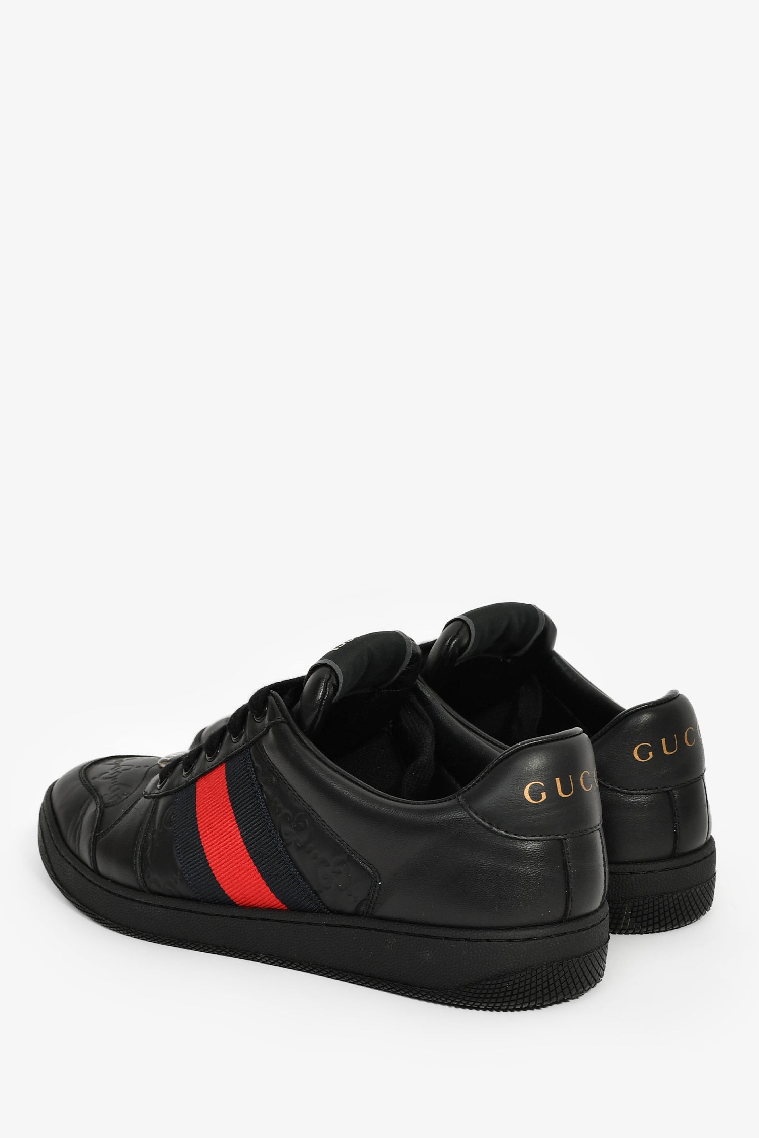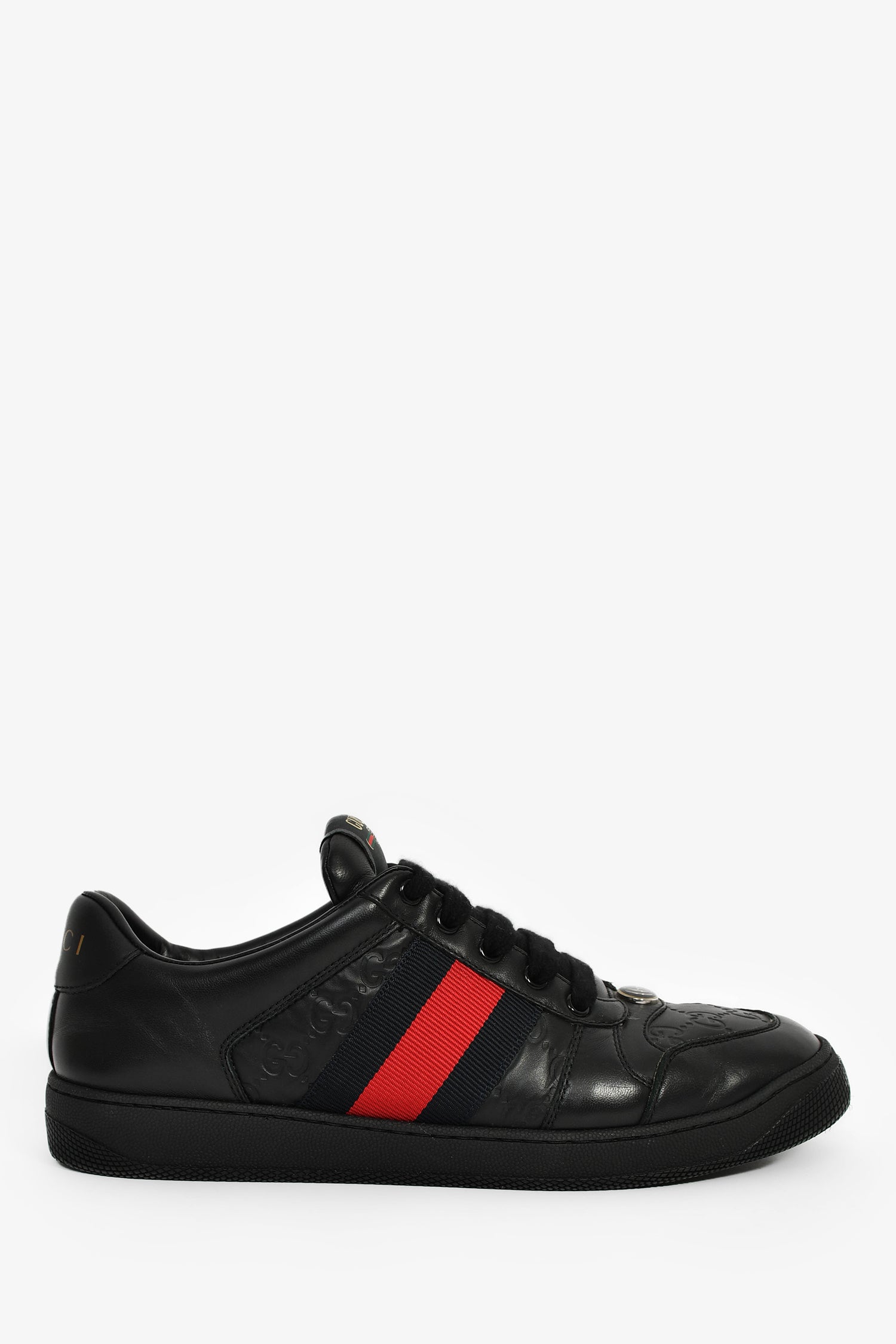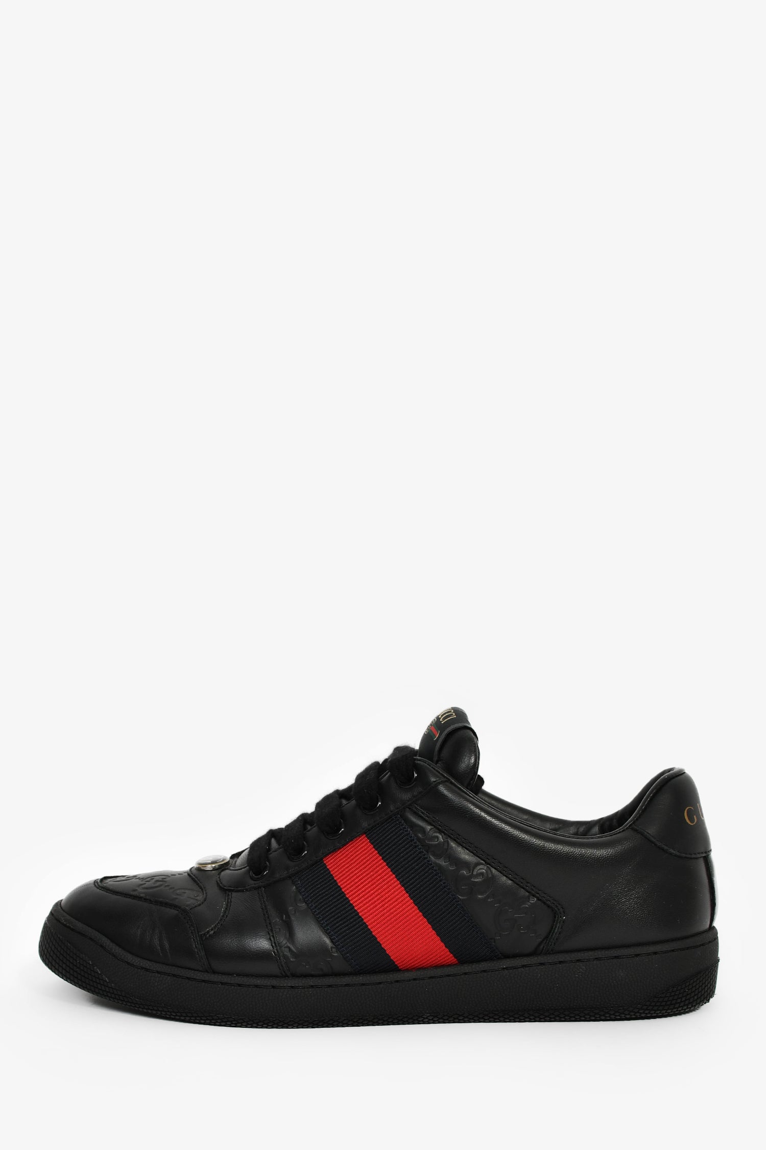 Refresh availabilityGucci Black Leather Guccissima Web Details Sneaker. Slip-on. Round toe. Lace-up closure. Leather insole. Rubber soles. Tonal stitching.