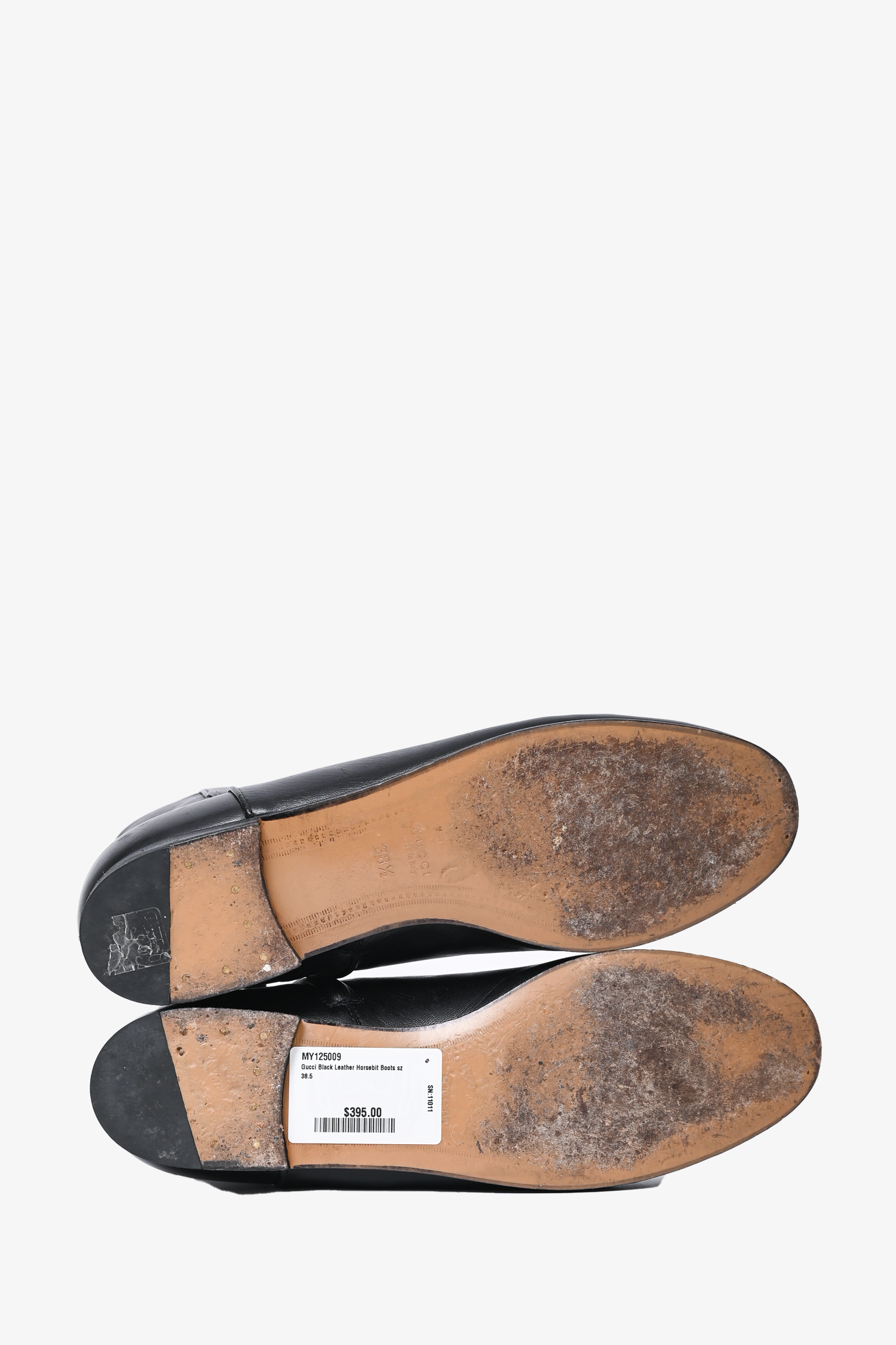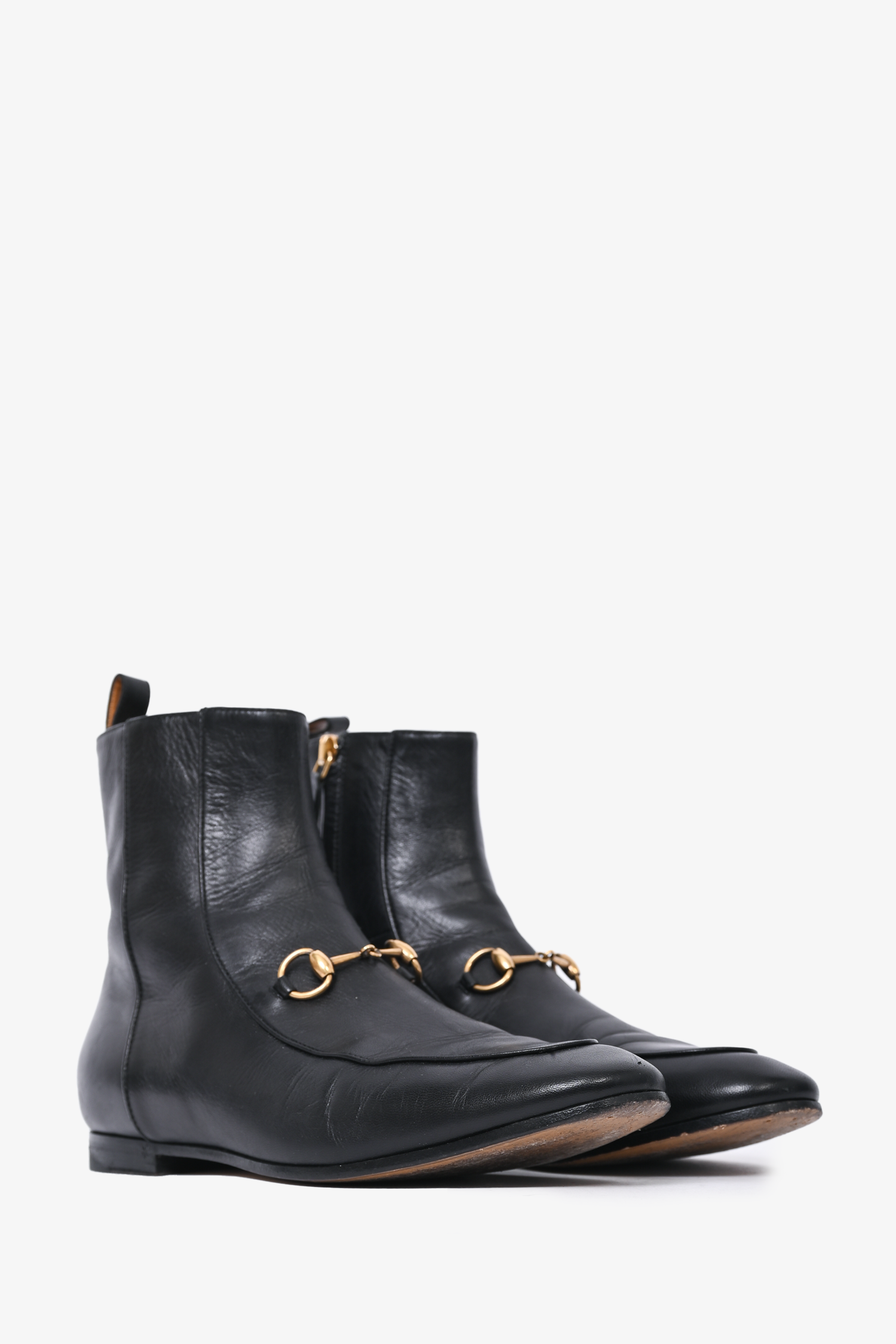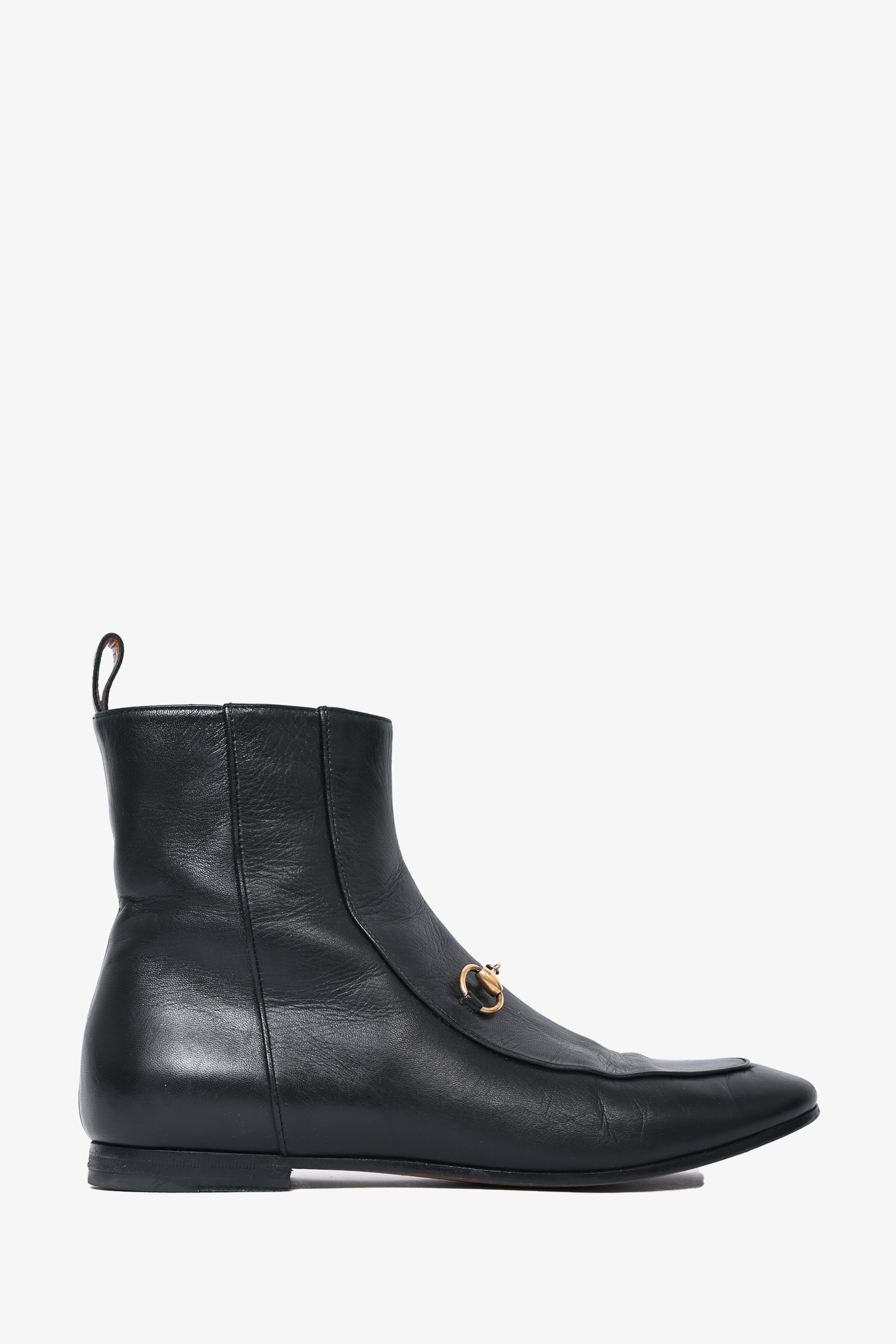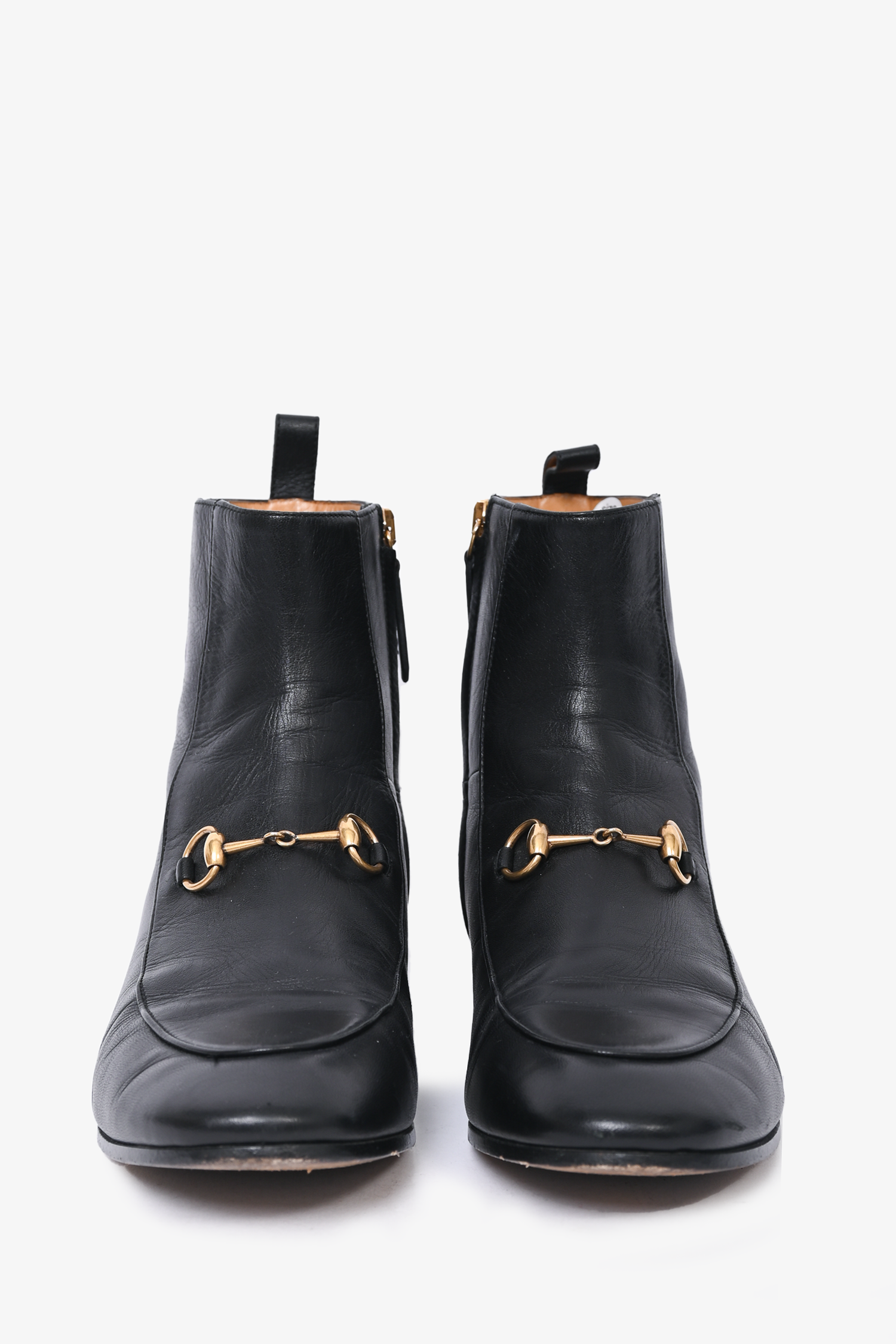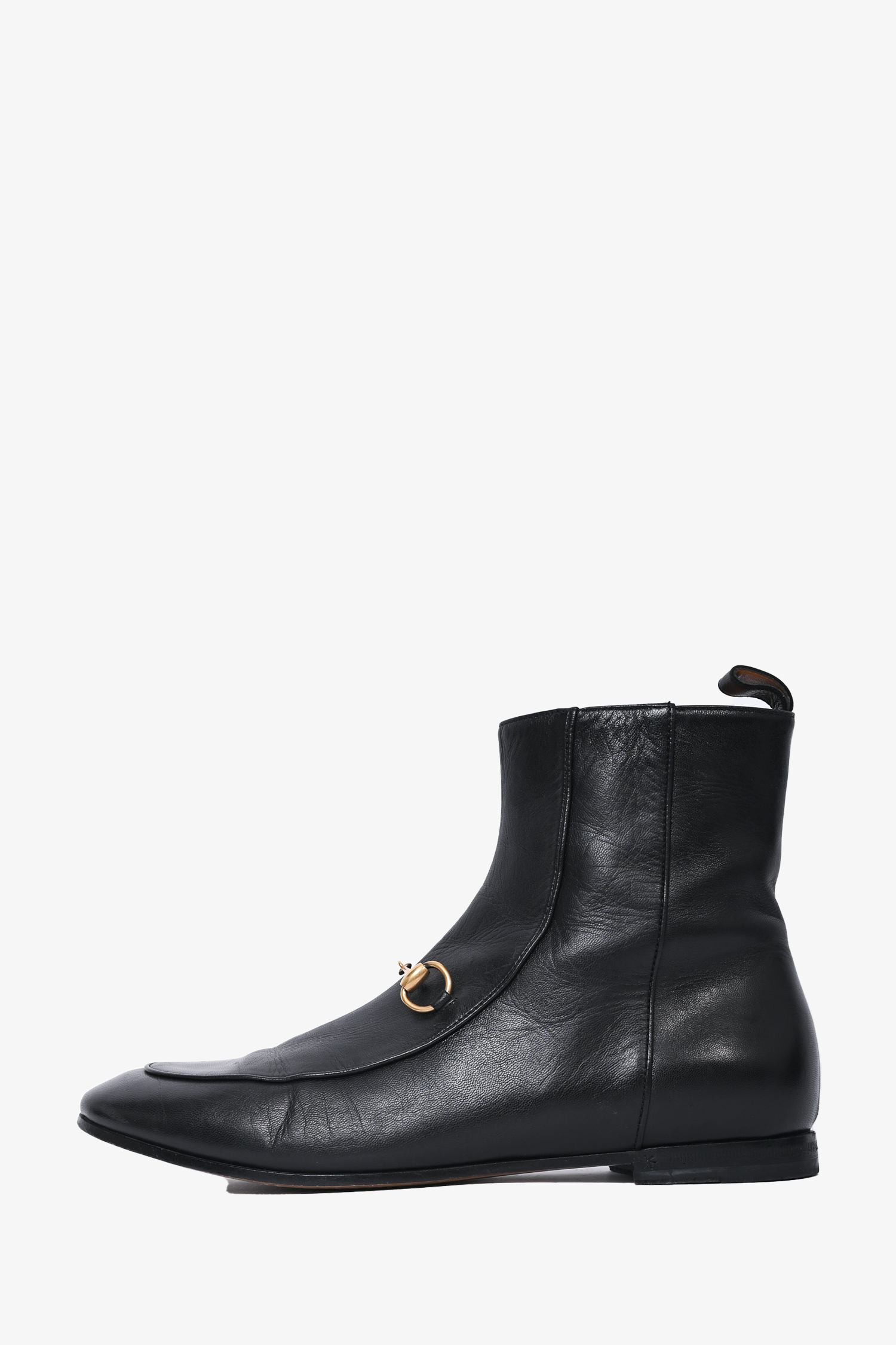 Refresh availabilityGucci Black Leather Horsebit Boots. Side-zip closure. Round toe. Gold-tone hardware. Tonal stitching.