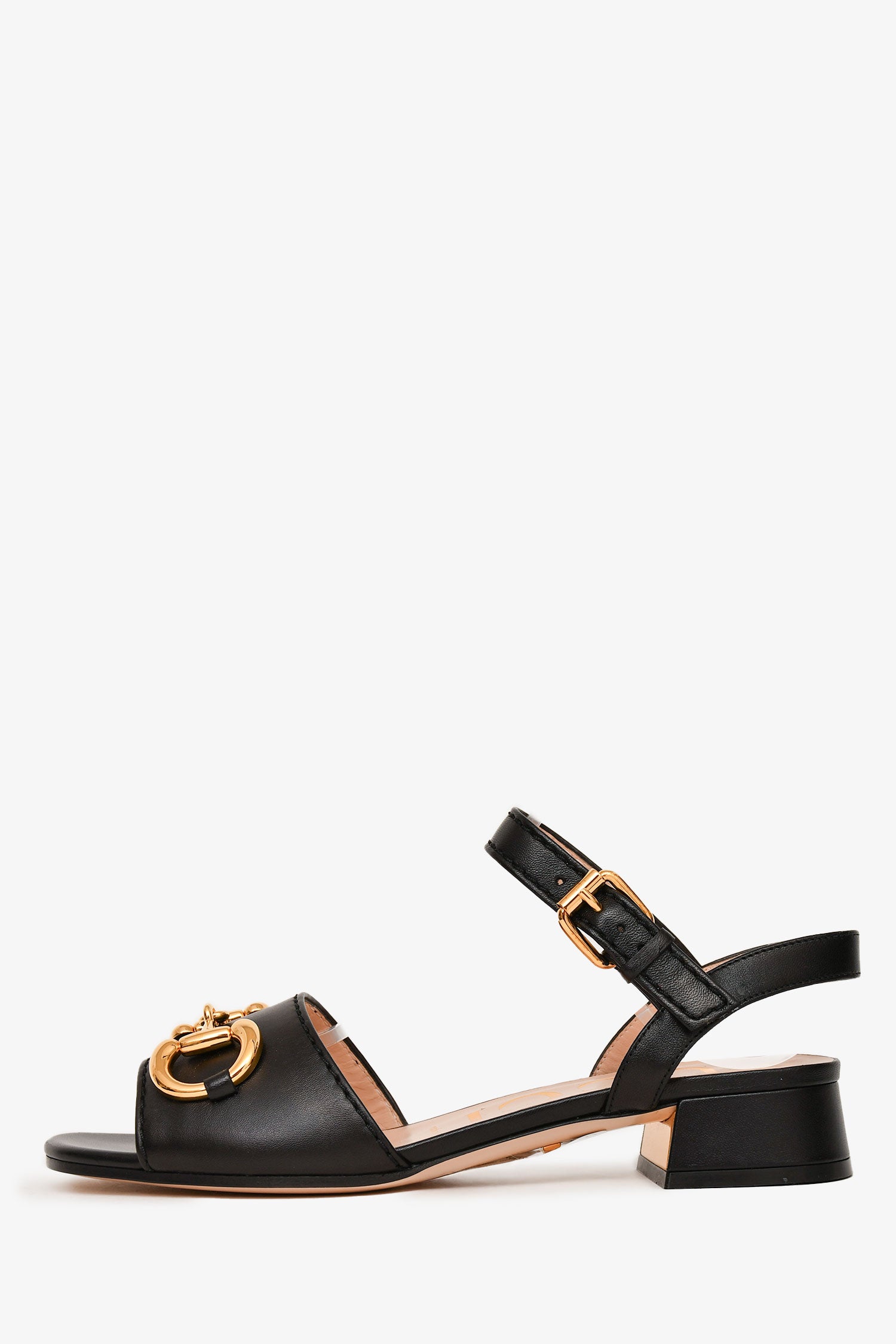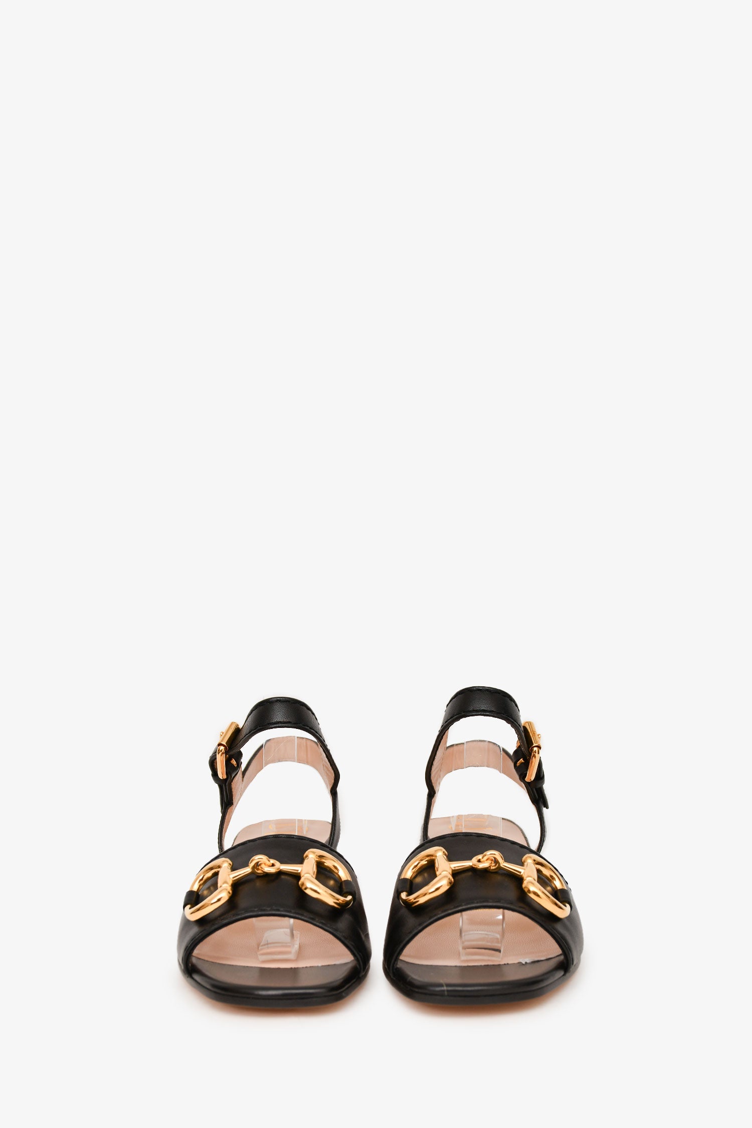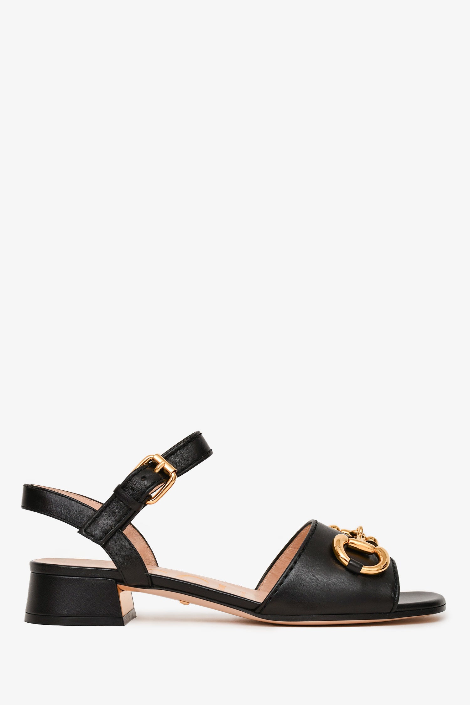 Refresh availabilityGucci Black Leather Horsebit Buckle Sandals. Open toe. Slim leather straps with signature gold-tone buckle at front. Adjustable ankle strap with buckle closure. Low heel. Leather sole. Tonal stitching. Comes with box and dust bags.