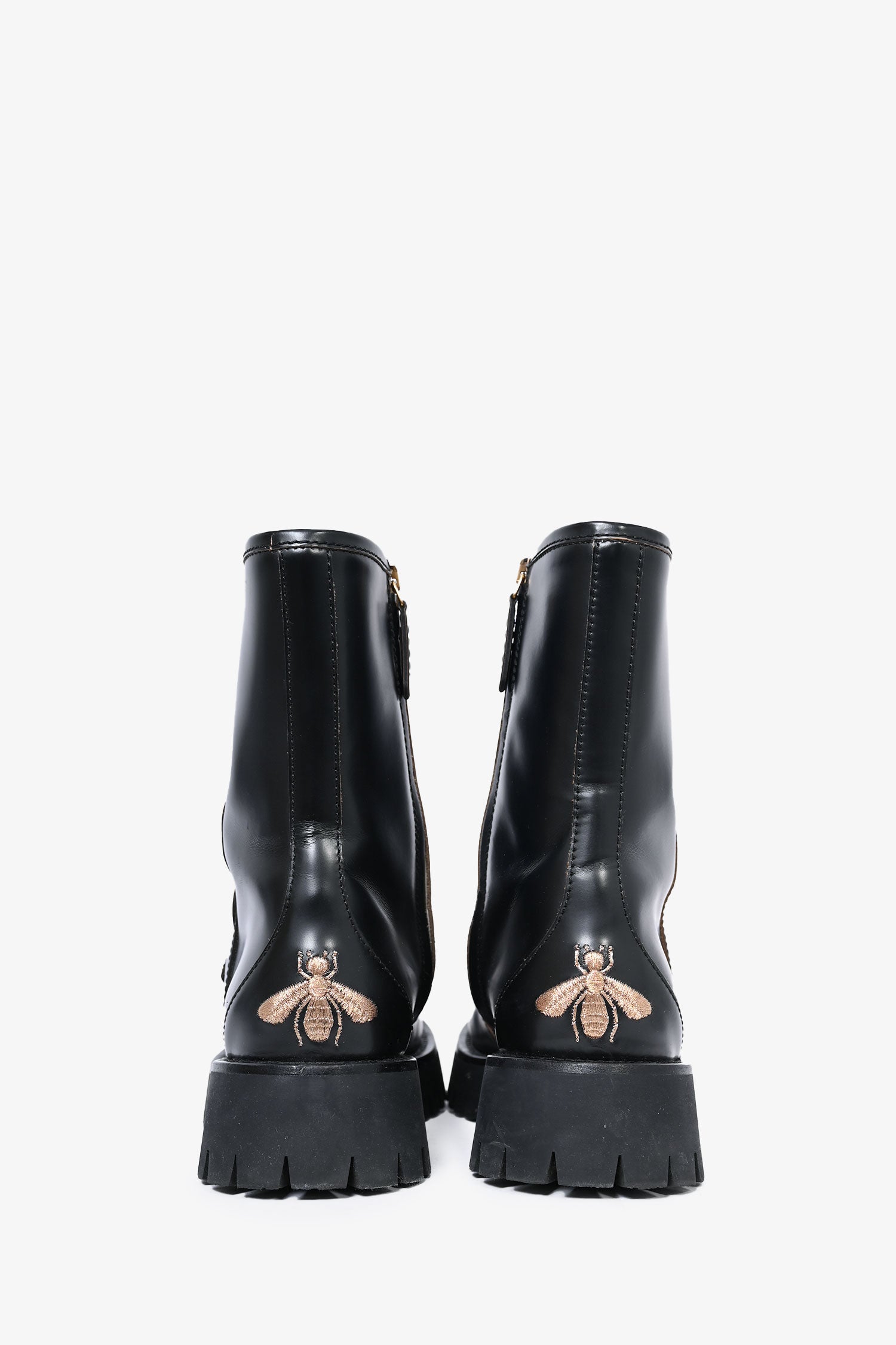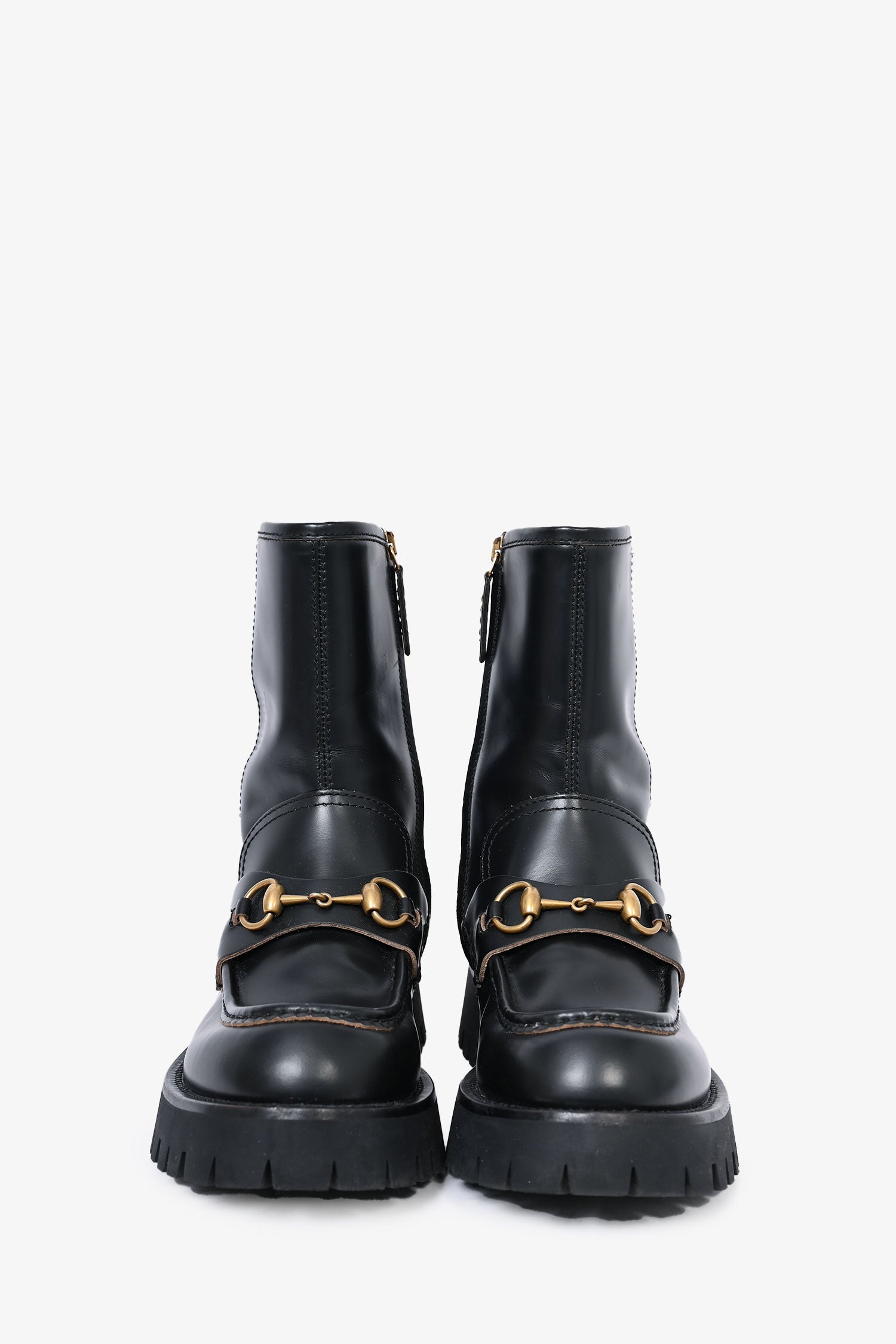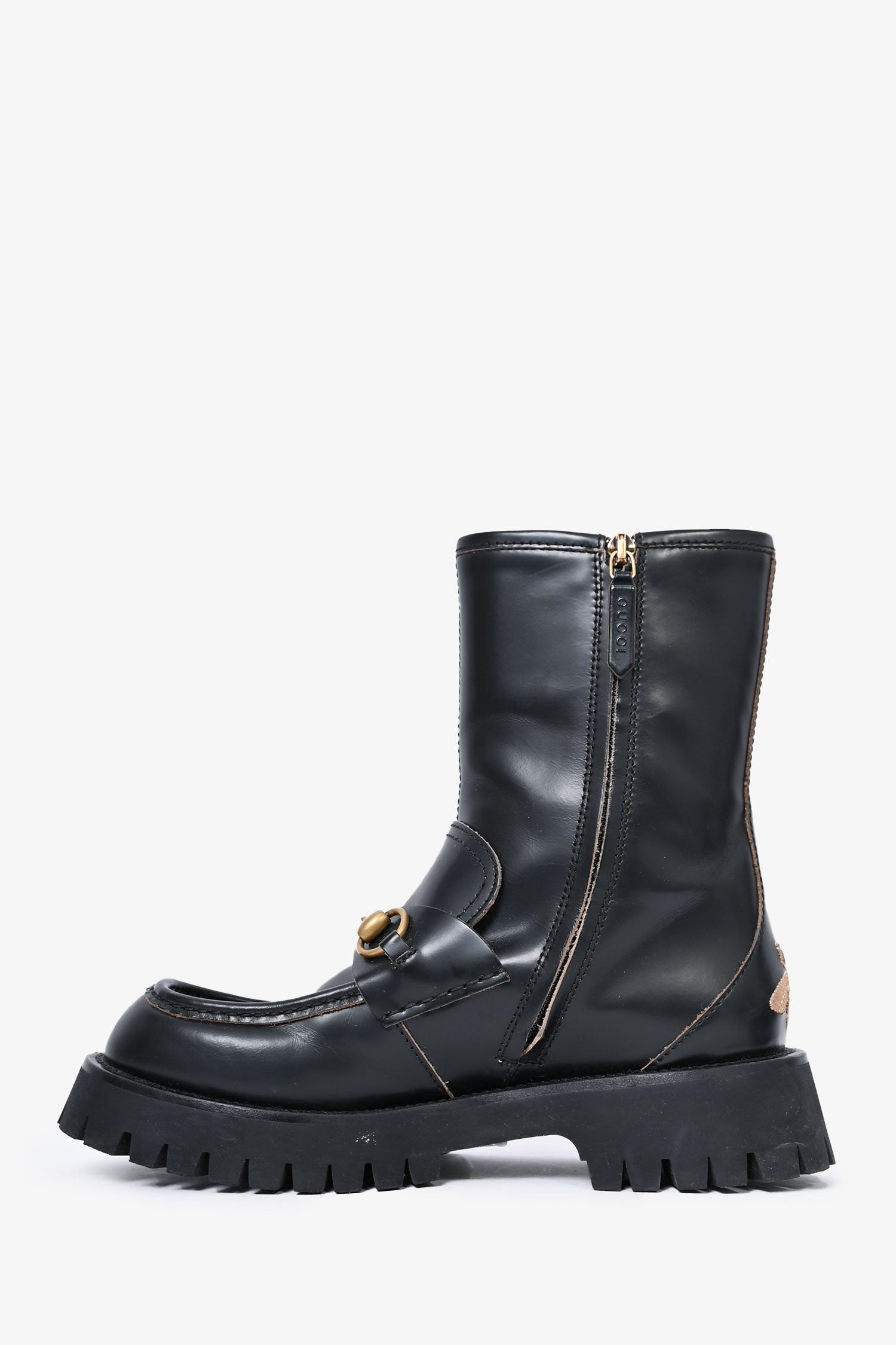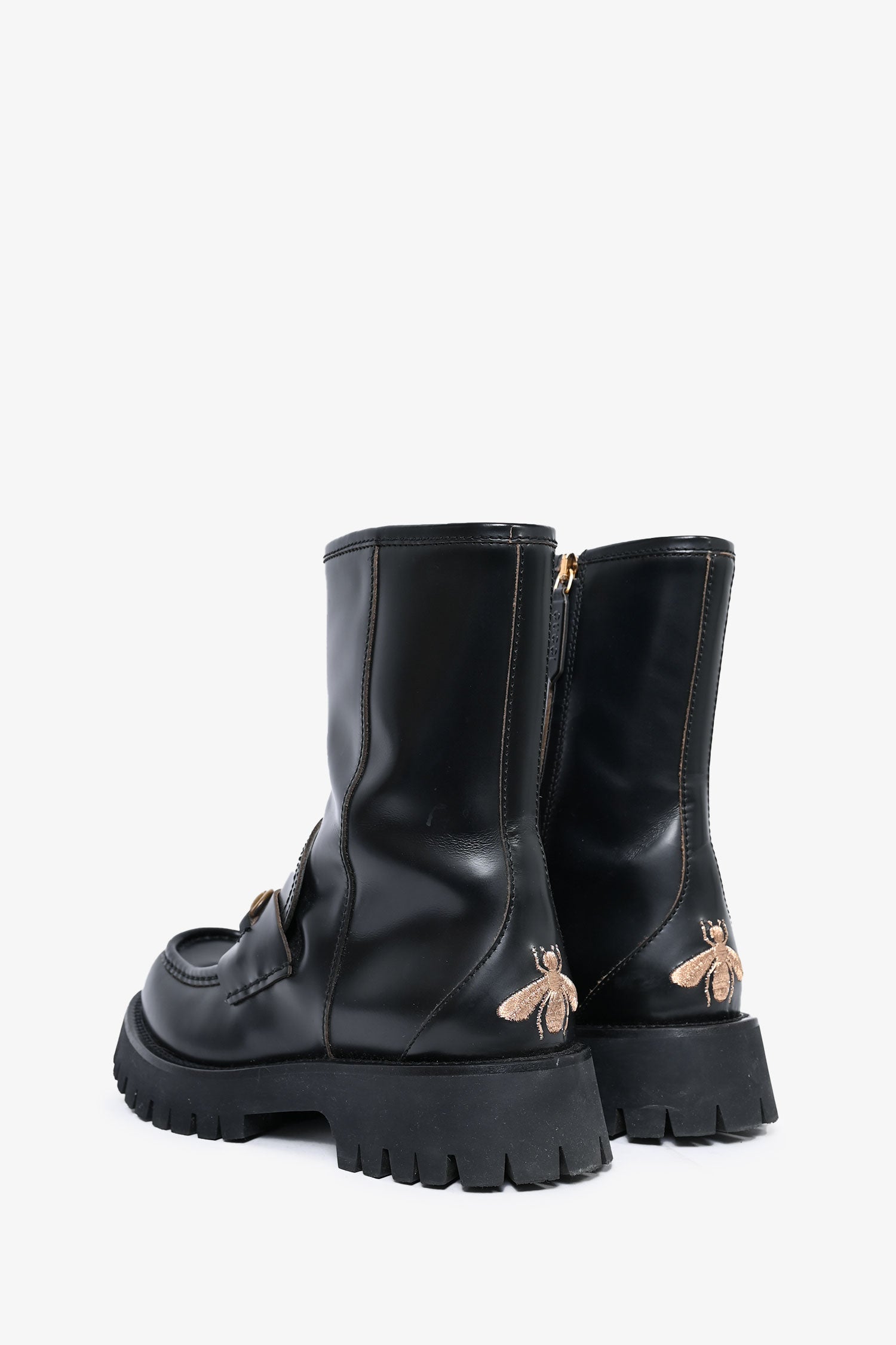 Gucci Black Leather Horsebit Chunky Boots. Side zip up closure. Round toe. Gold-tone hardware. Rear embroidered bee logo.
