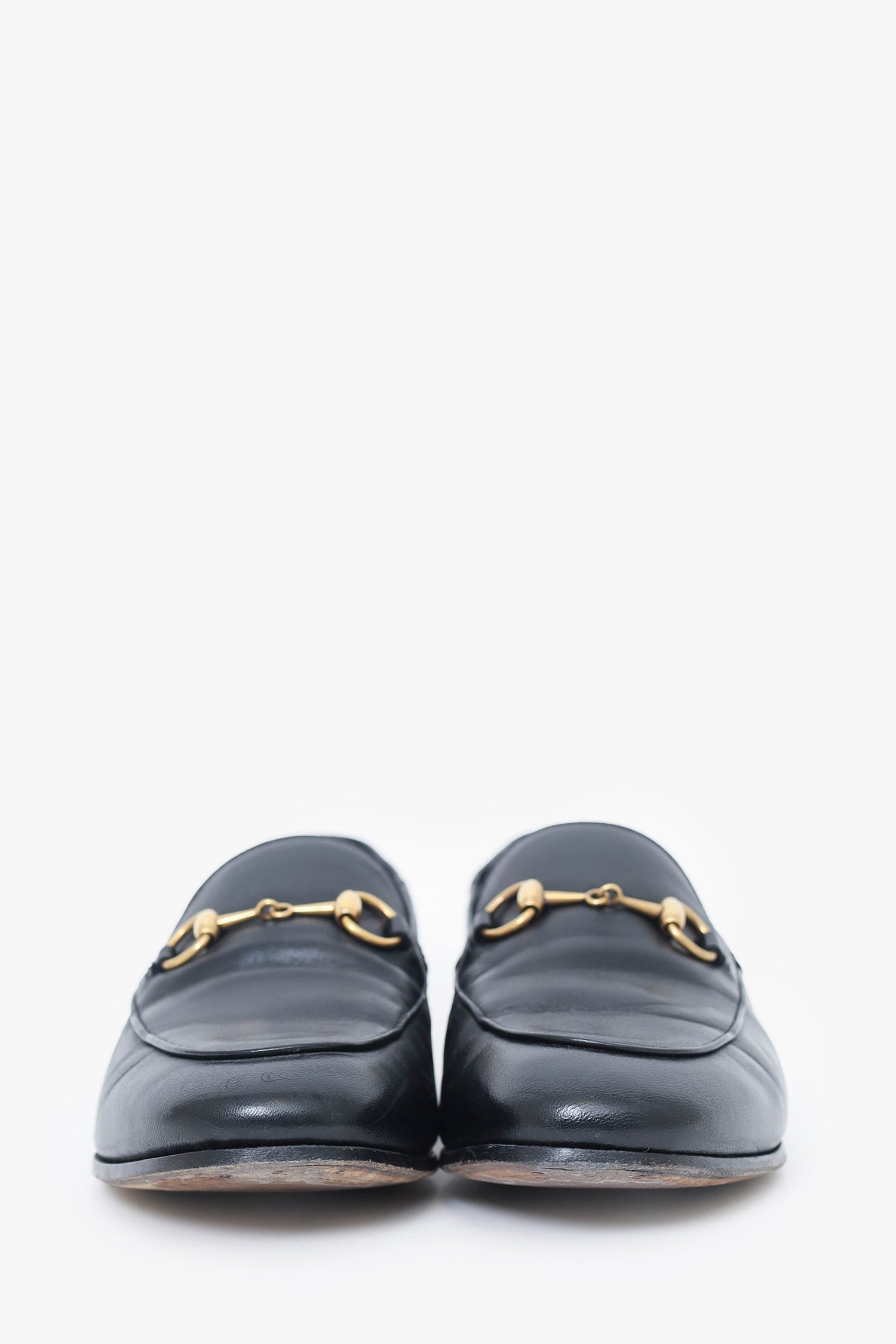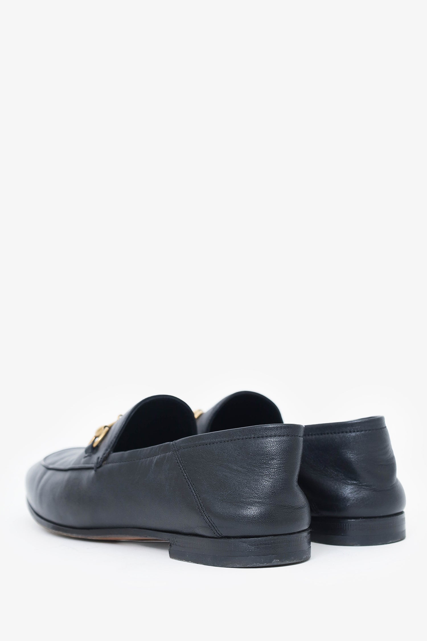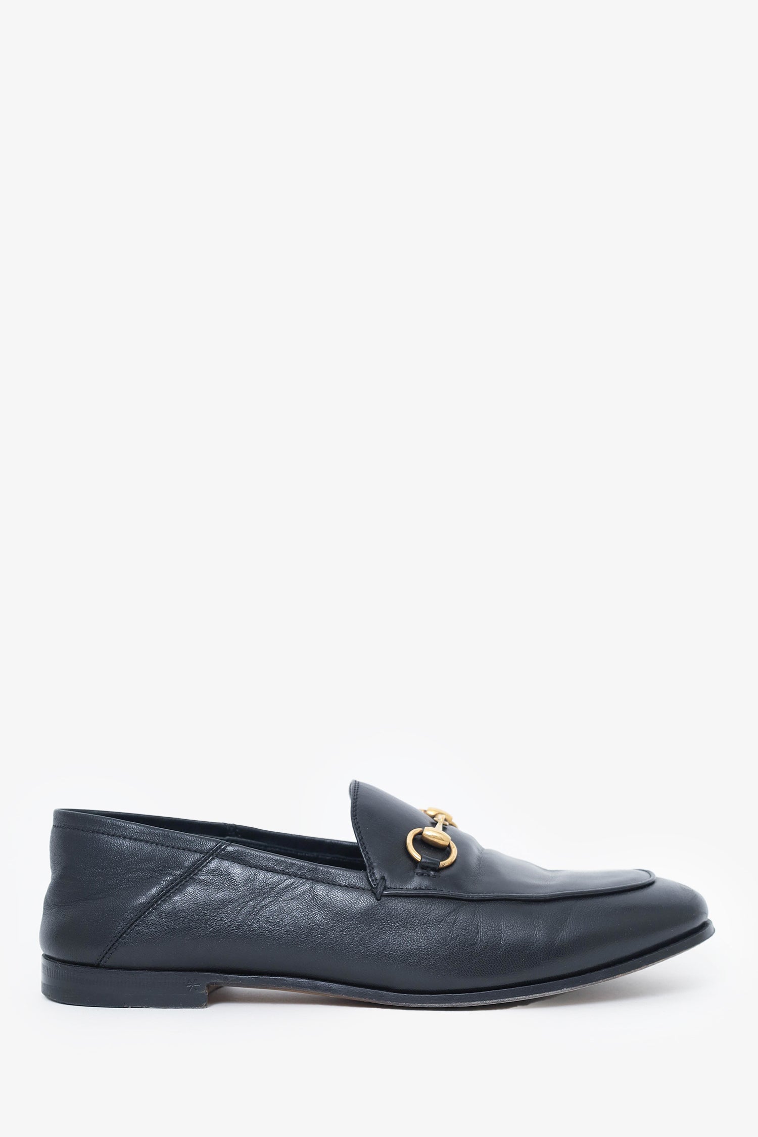 Refresh availabilityGucci Black Leather Horsebit Jordaan Loafers. Slip-on. Round toe. Gold-tone hardware. Tonal stitching.
