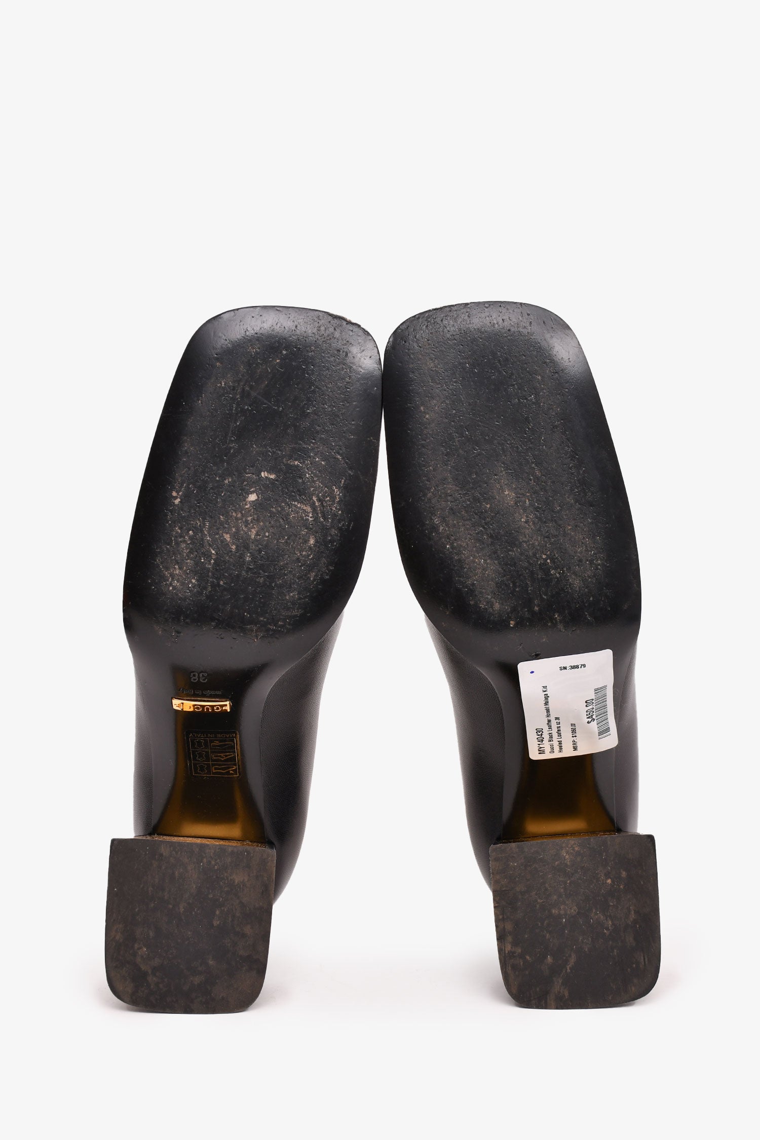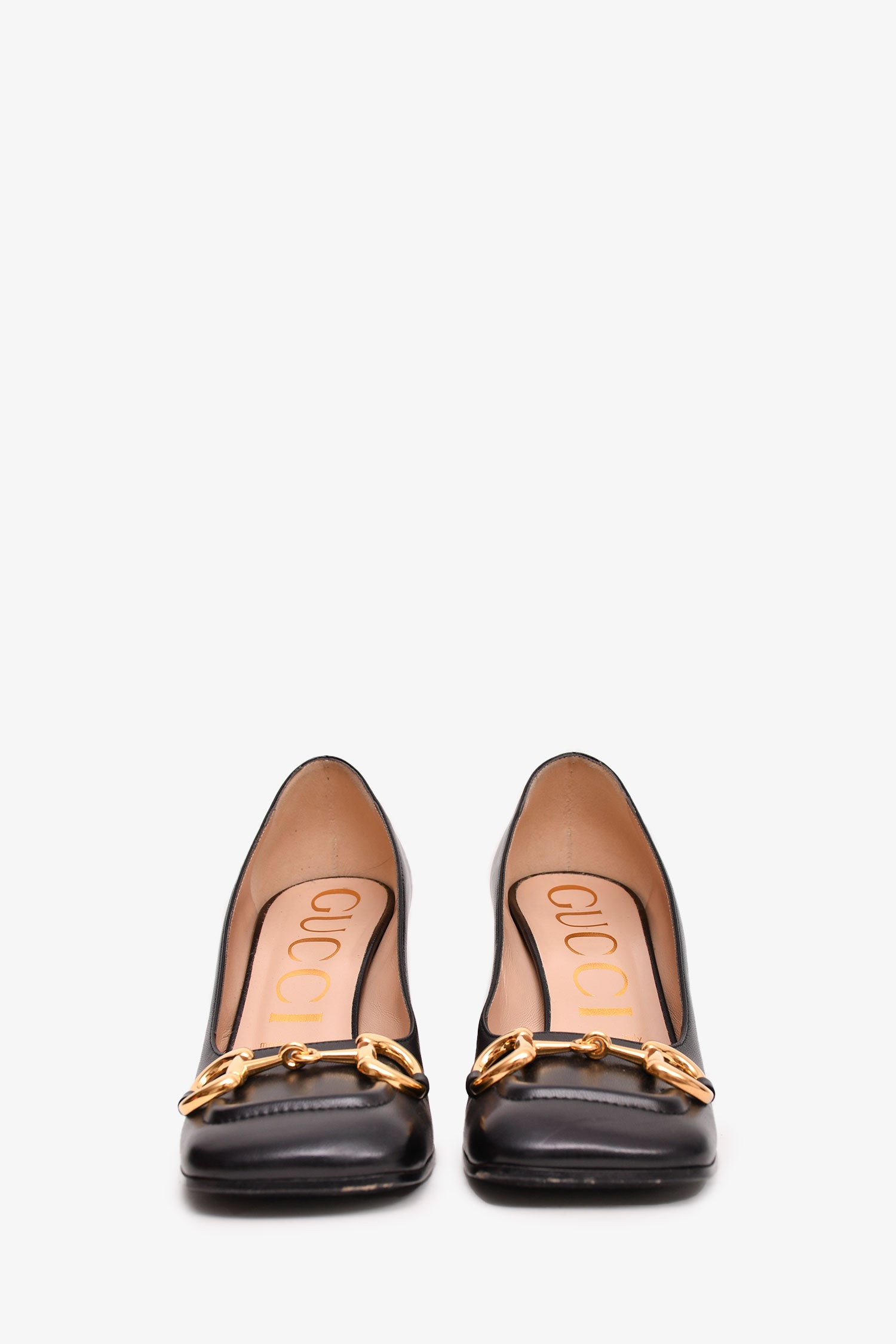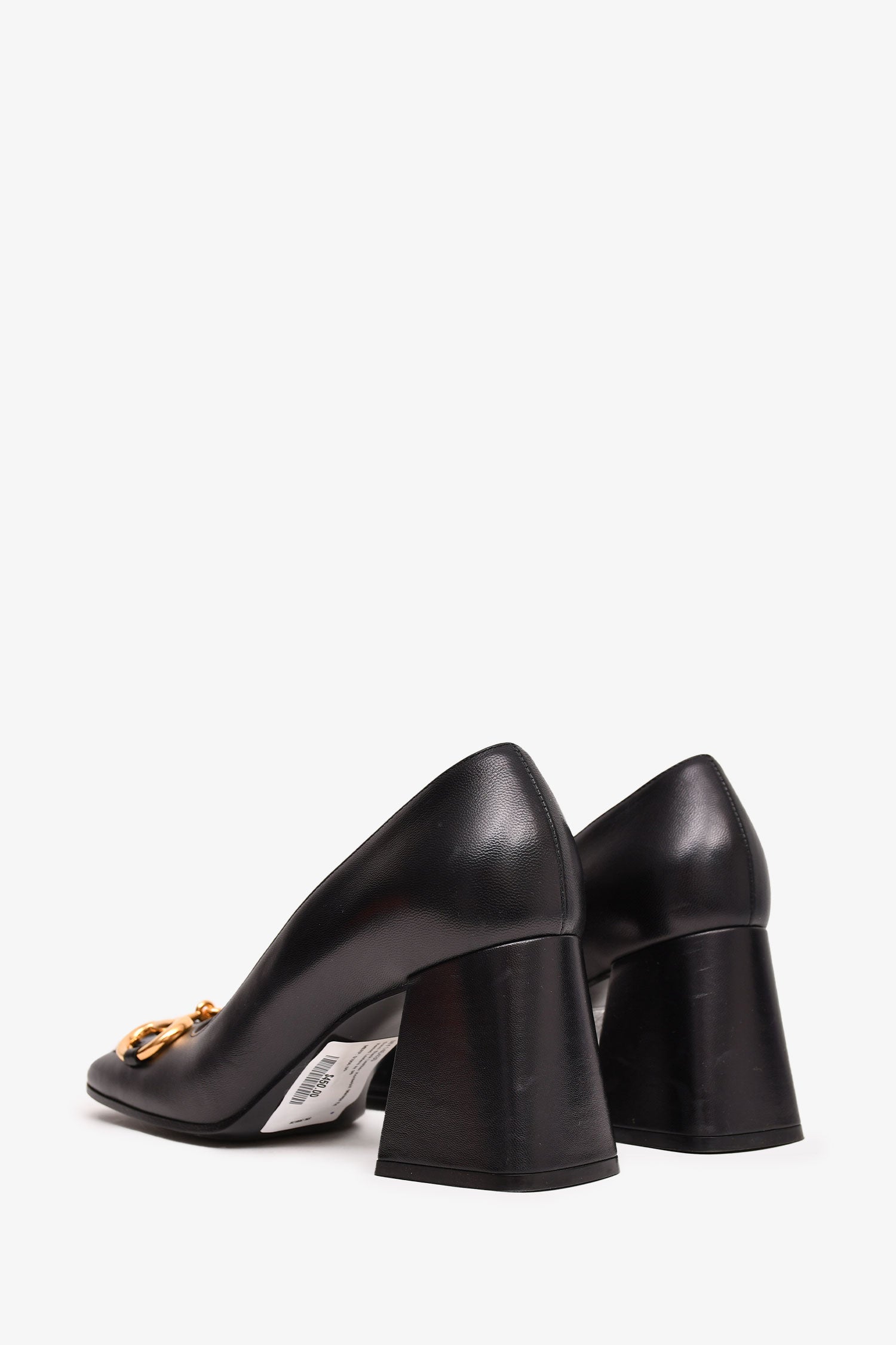 Refresh availabilityGucci Black Leather Horsebit Malaga Kid Heeled Loafers. Gold-tone hardware. Leather lined interior. Sculptural block heel with a gold plate. Square toe. Tonal stitching.
