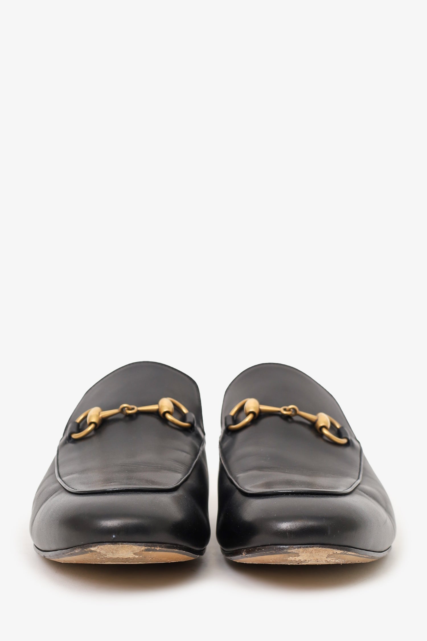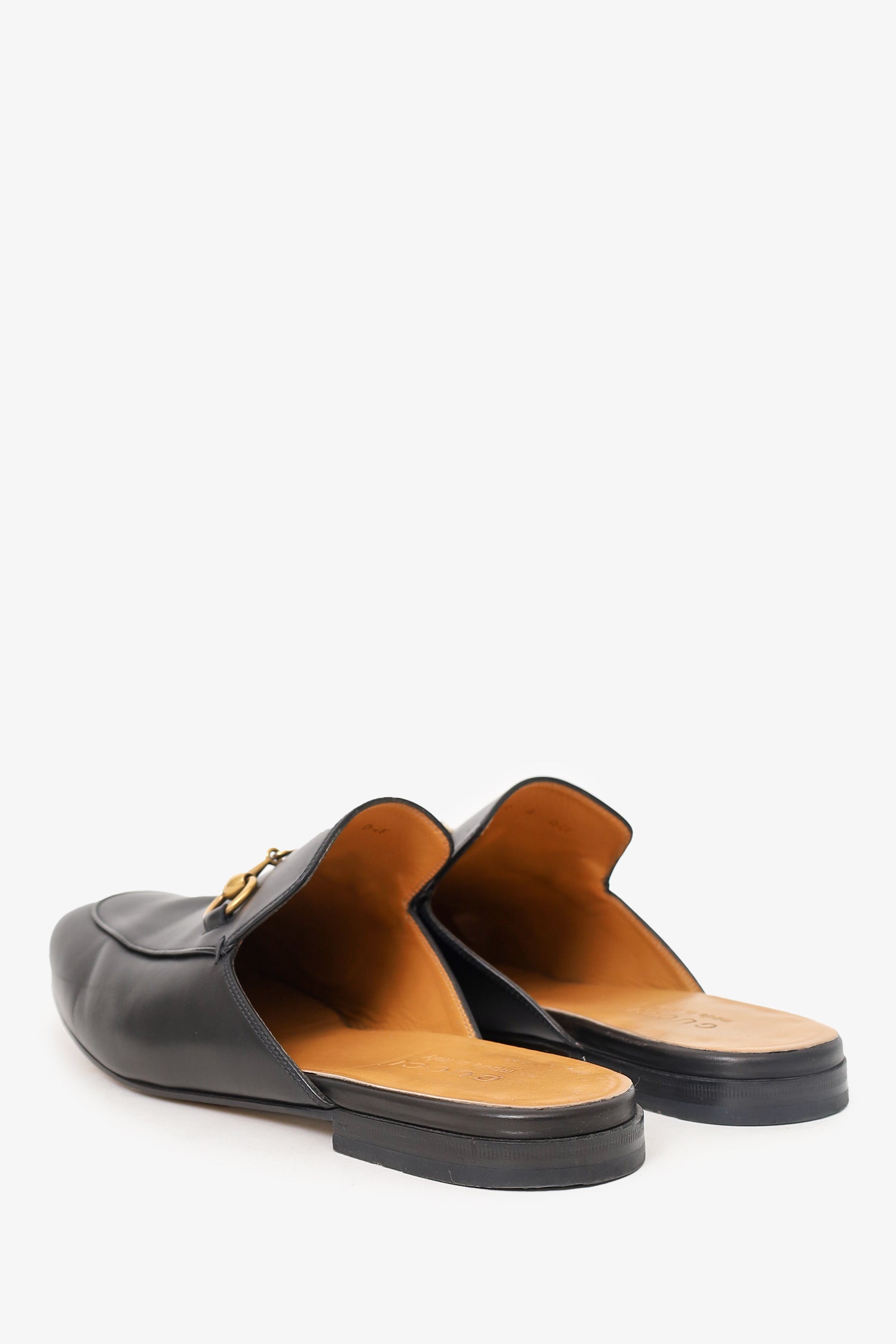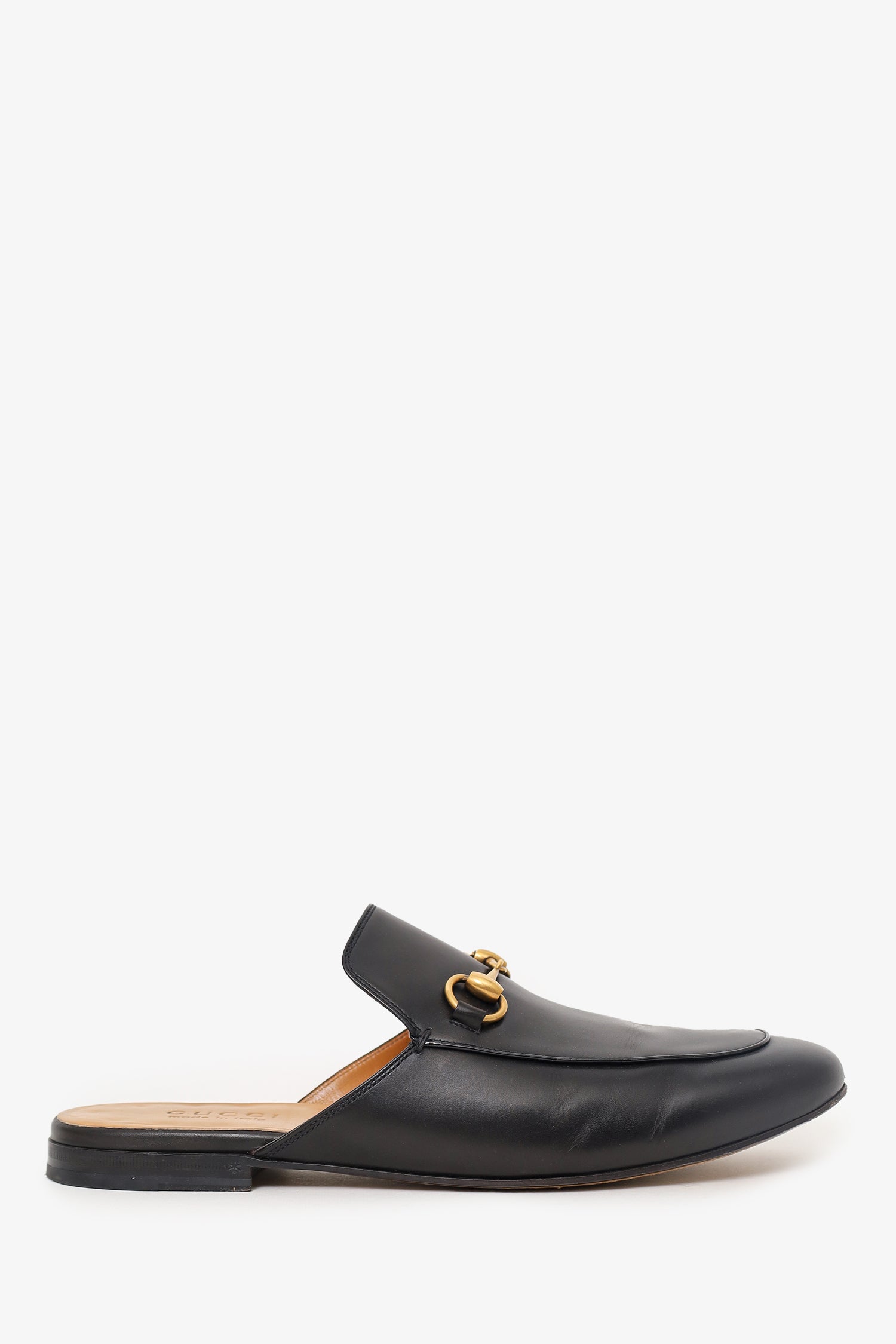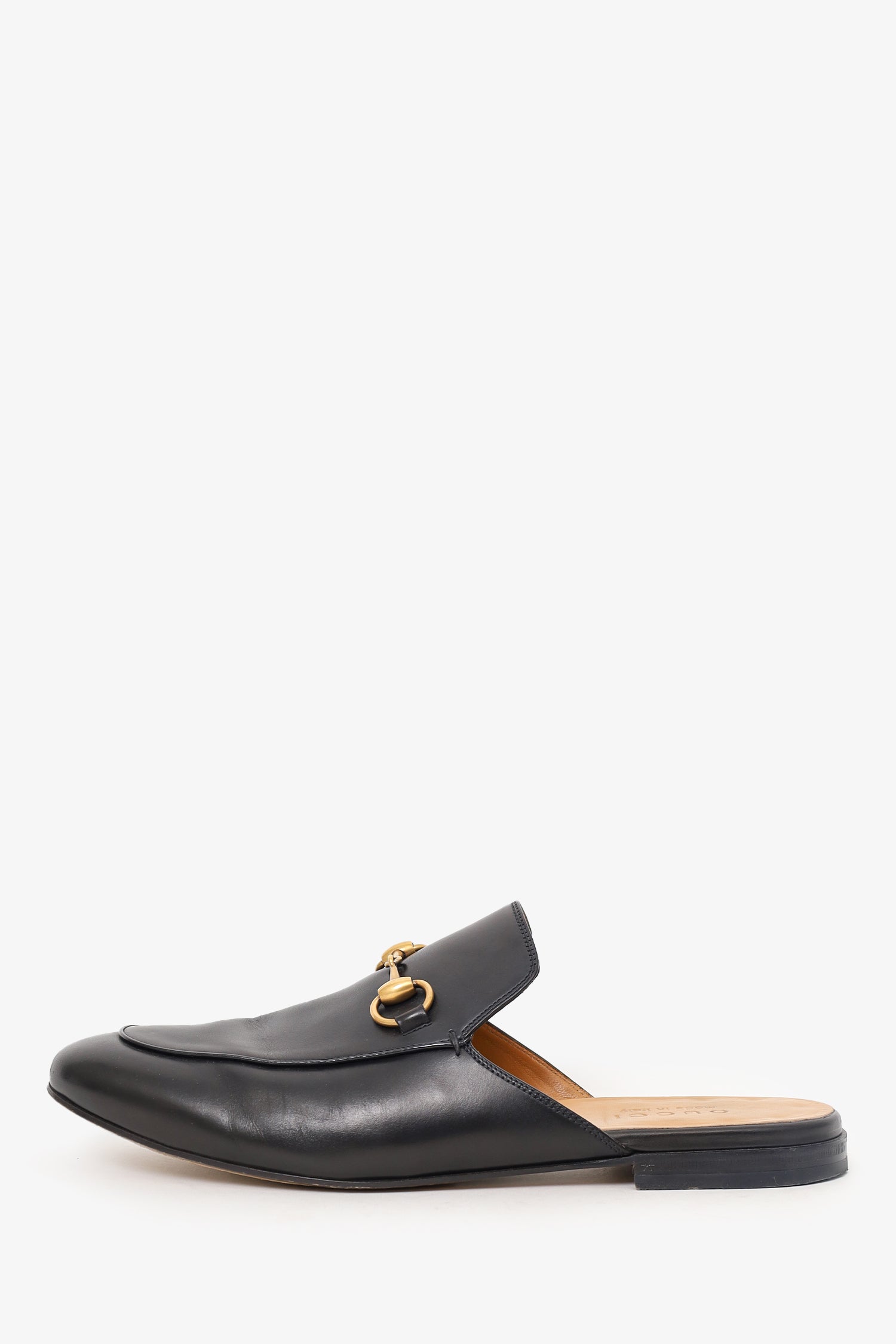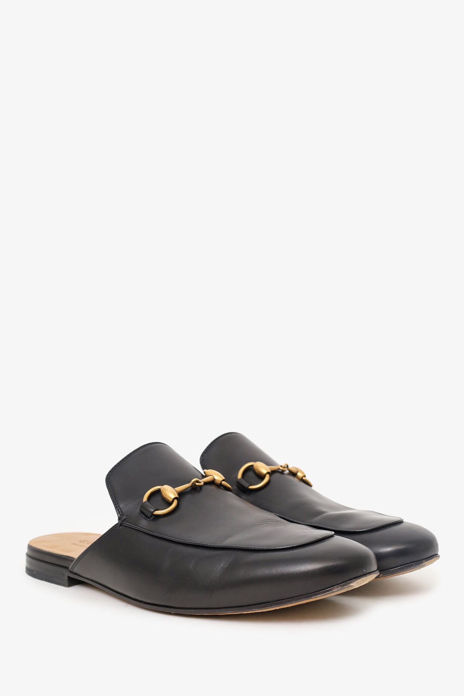 Refresh availabilityGucci Black Leather Horsebit Princetown Slip-on Loafer. Slip-on. Pointed-round toe. Chain detail on upper toe box. Gold-tone hardware. Tonal stitching.