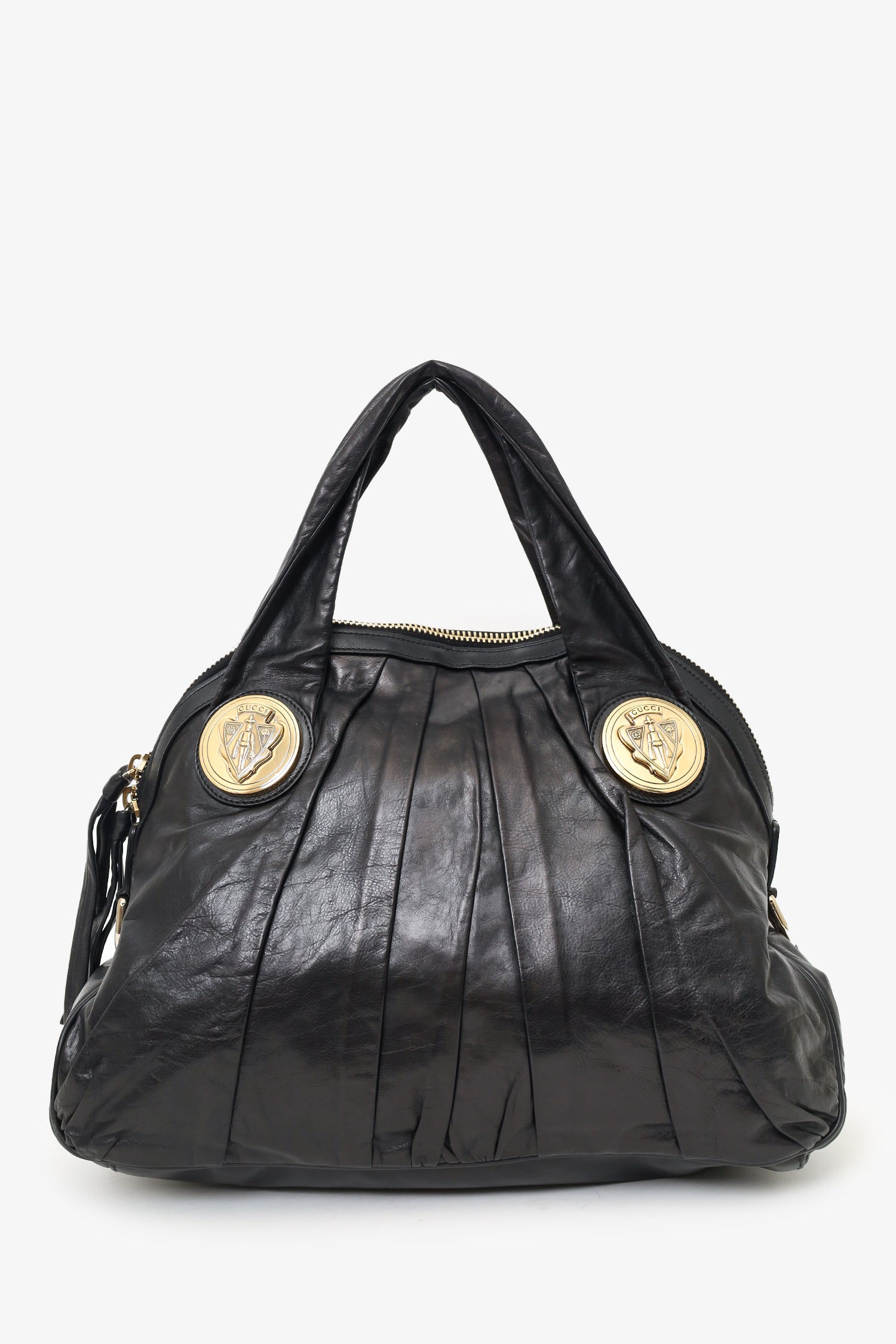 Refresh availabilityGucci Black Leather 'Hysteria' Hobo Bag. Top zipper closure. Dual handles. 3 interior pockets; 2 slip and 1 with zip closure. Black lined "gucci" canvas interior. Gold-tone hardware. Tonal stitching.