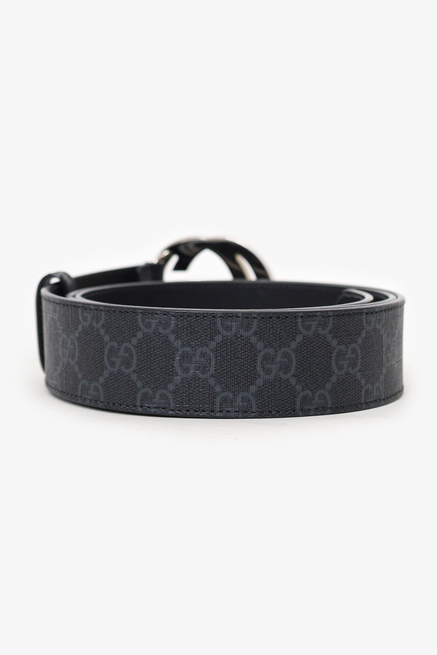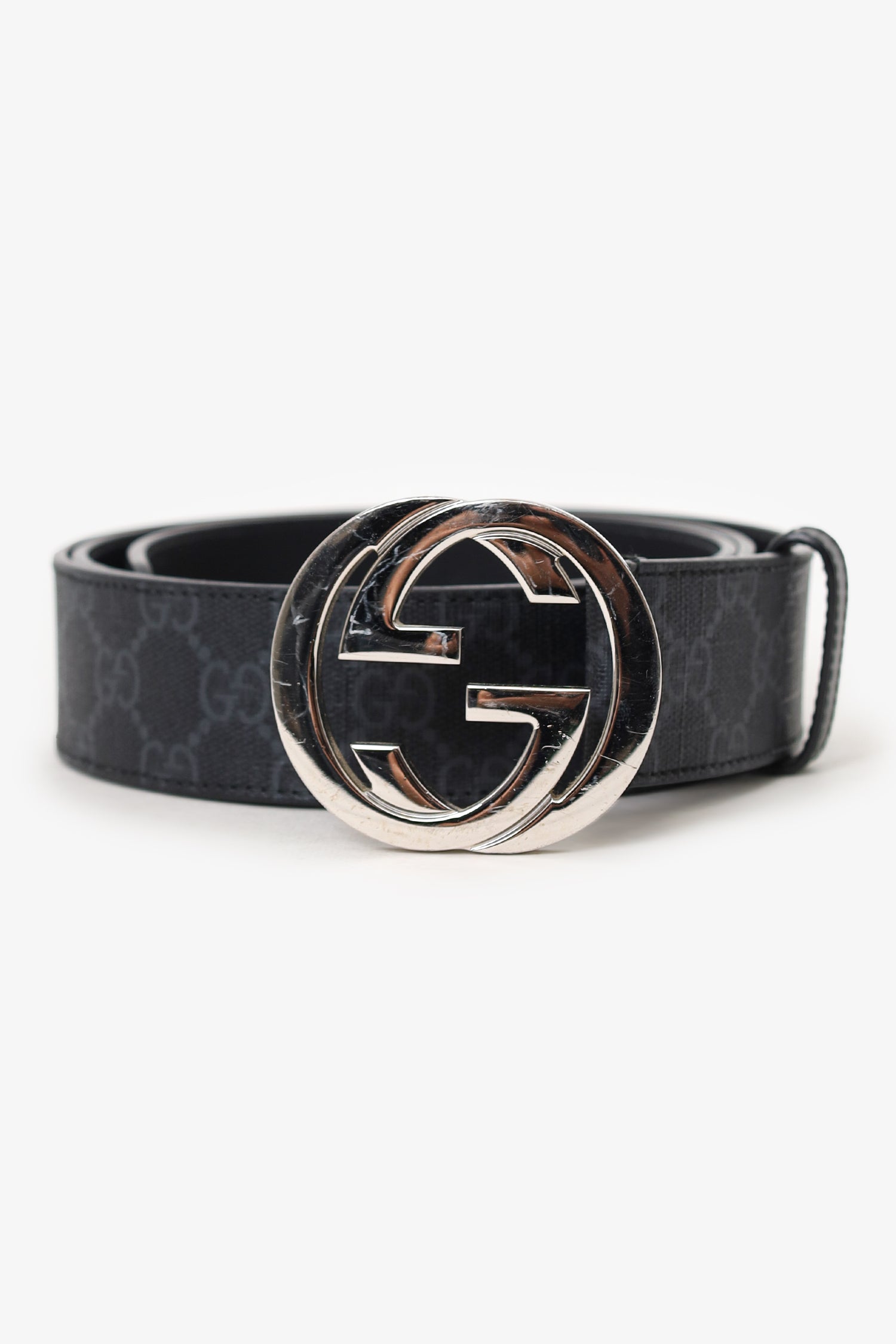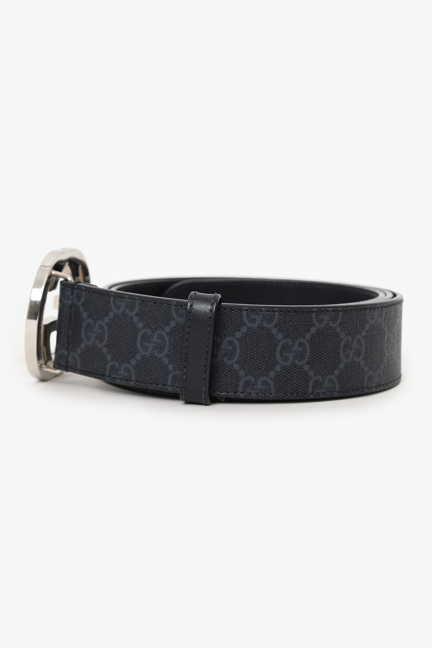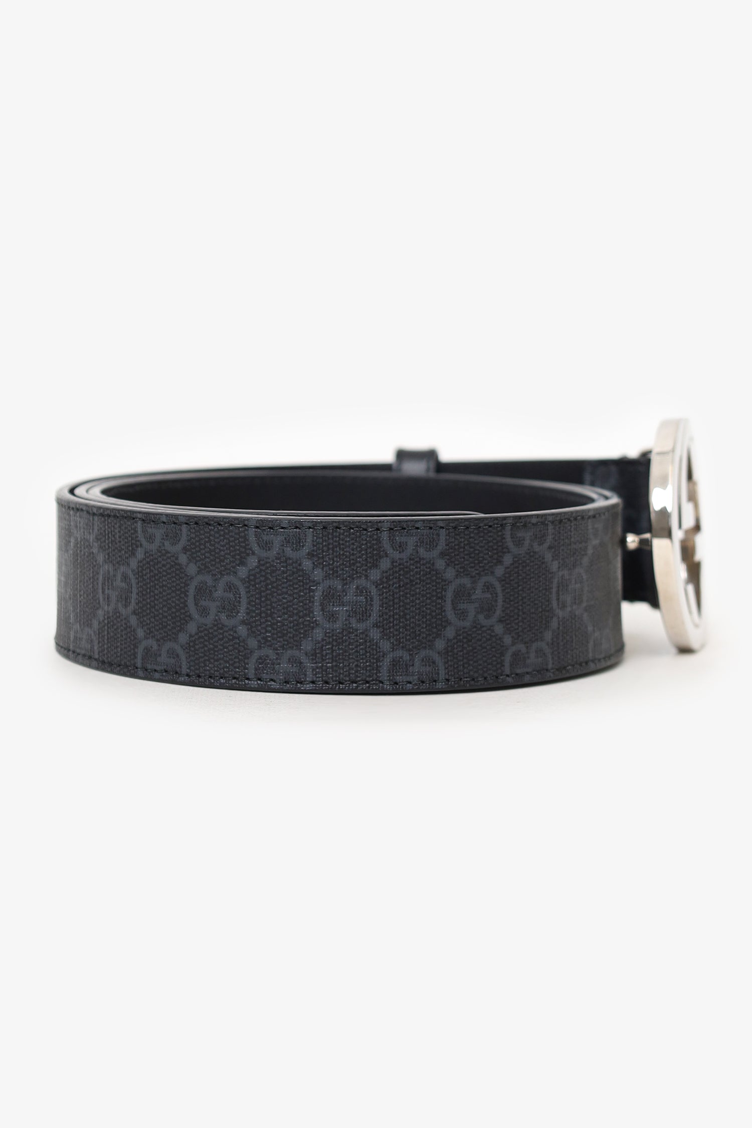 Refresh availabilityGucci Black Leather Interlocking G Buckle Belt. Adjustable pull-through push-pin closure. Tonal stitching. Silver-tone hardware.